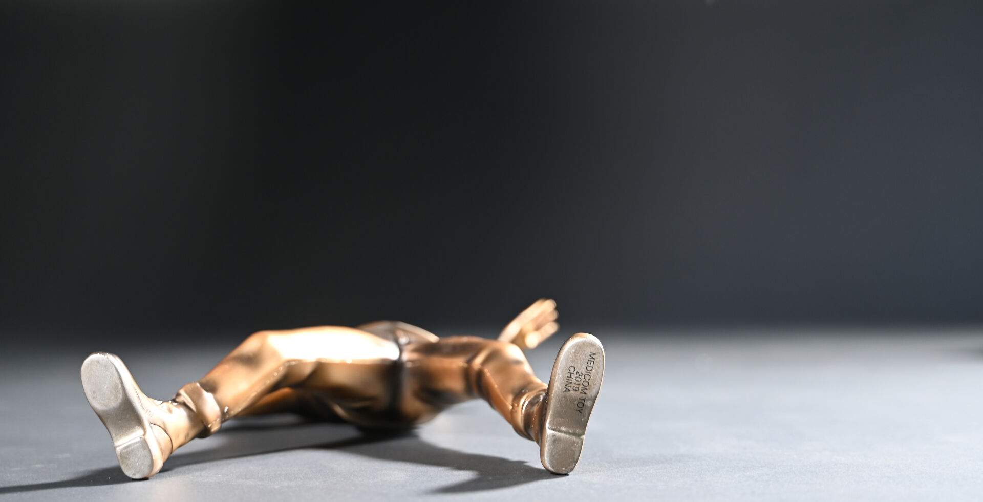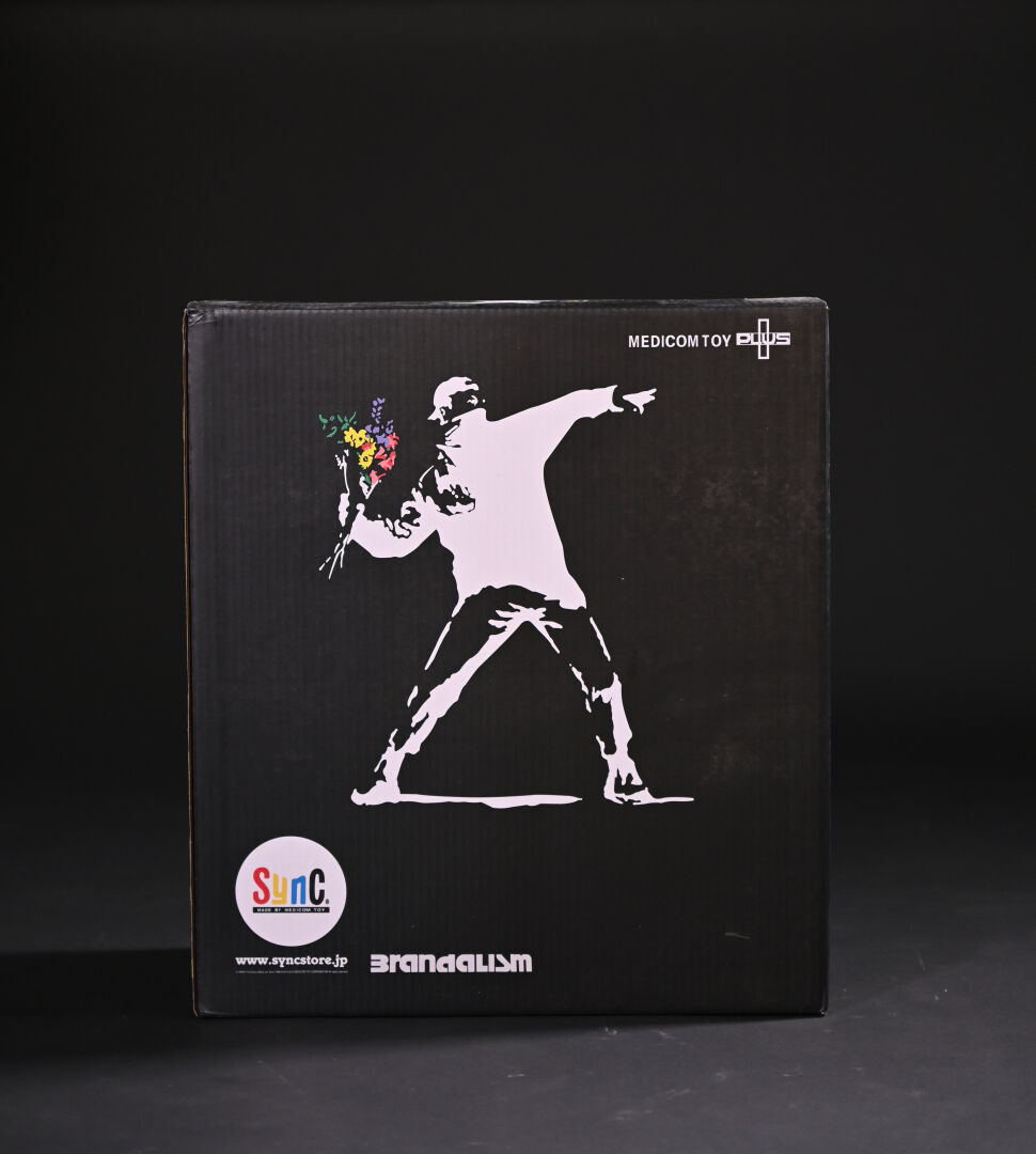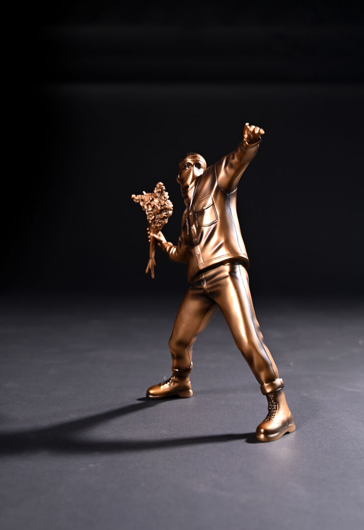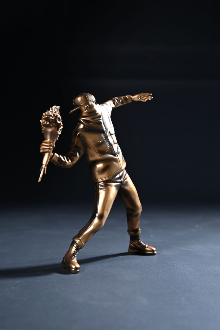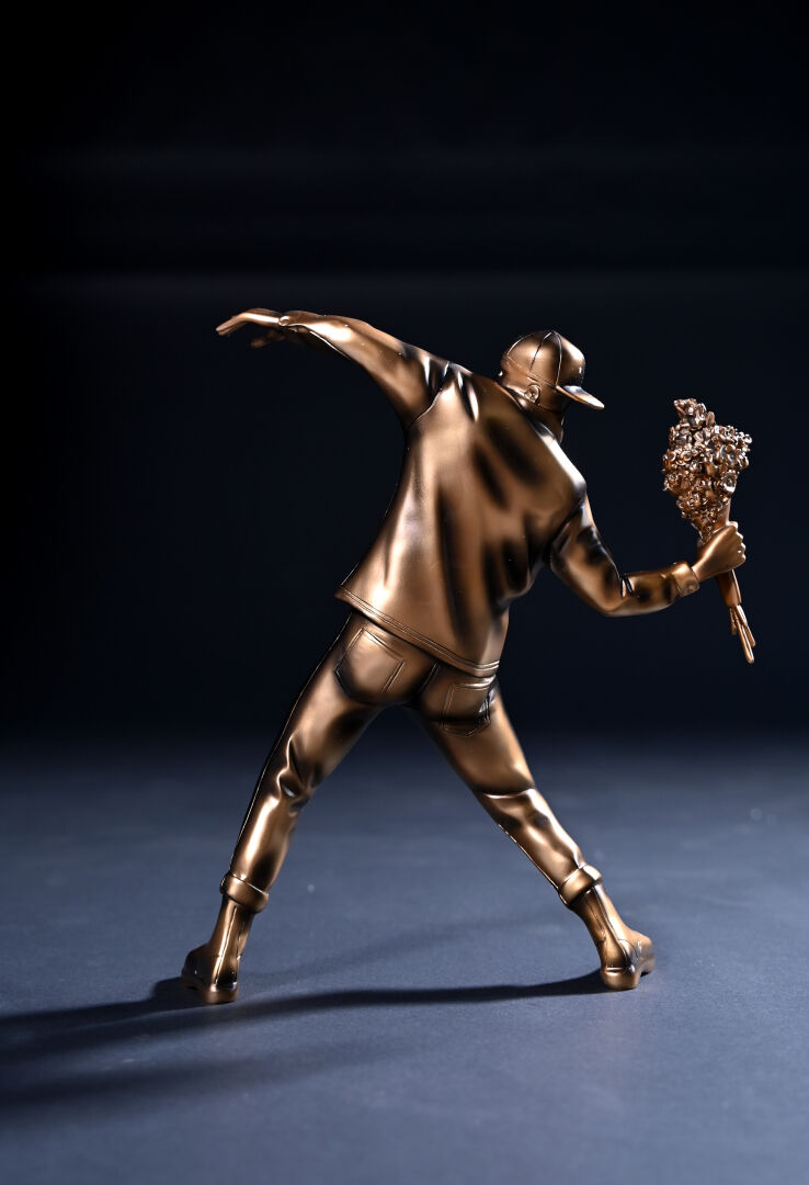 D’après BANKSY (Né en 1974) – MEDICOM TOY. Le lanceur de fleurs. Edition en résine. Daté 2019. Haut. : 36 cm. Avec boite.