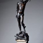 D’après Benvenuto CELLINI (1500-1557) Persée tenant la tête de la Méduse. Sujet en bronze patiné brun (deux accidents restaurés). Socle de pierre crème (quelques éclats). Haut. : 76 cm.