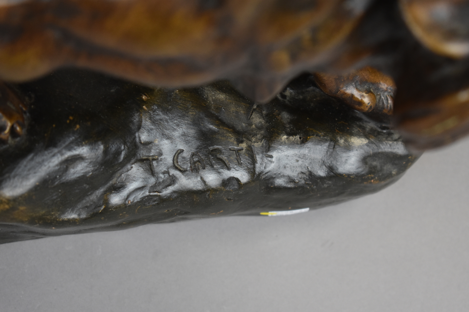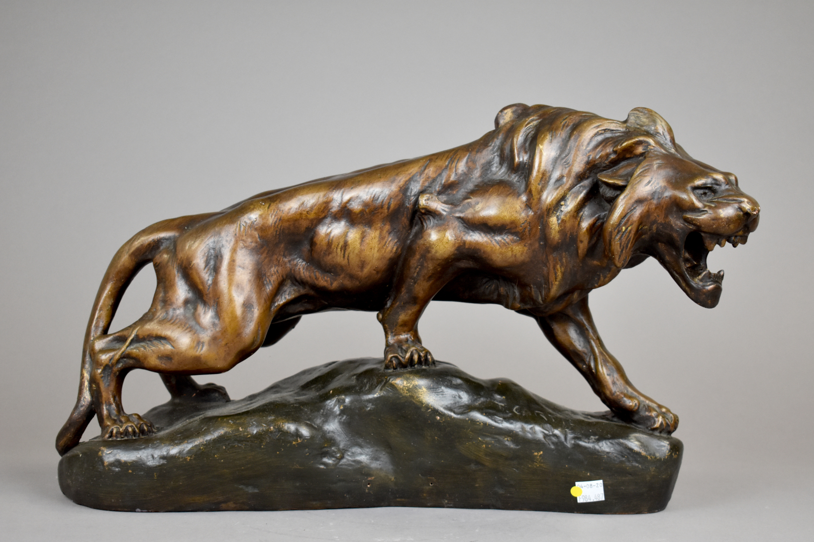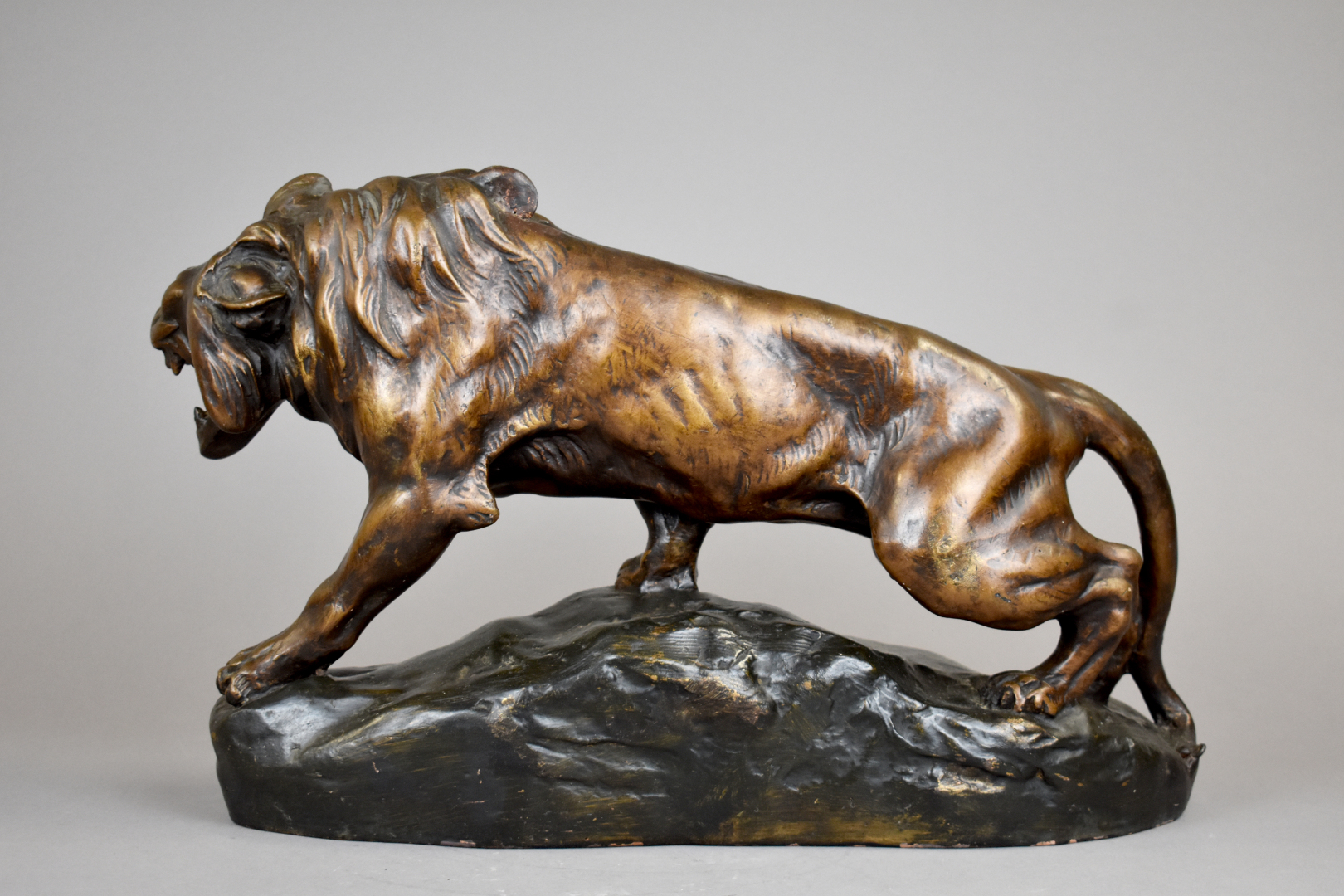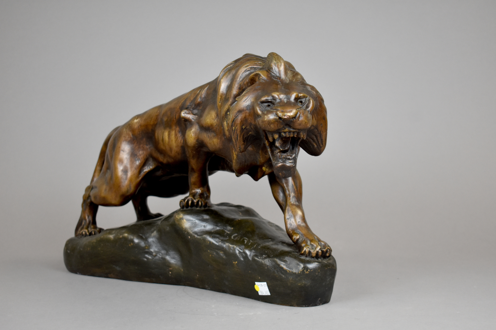 D’après CARTIE. Lion rugissant en plâtre ou terre cuite émaillée à l’imitation du bronze (frottements et petits éclats). Haut. : 31 cm – Larg. : 55 cm – Prof. : 15 cm.