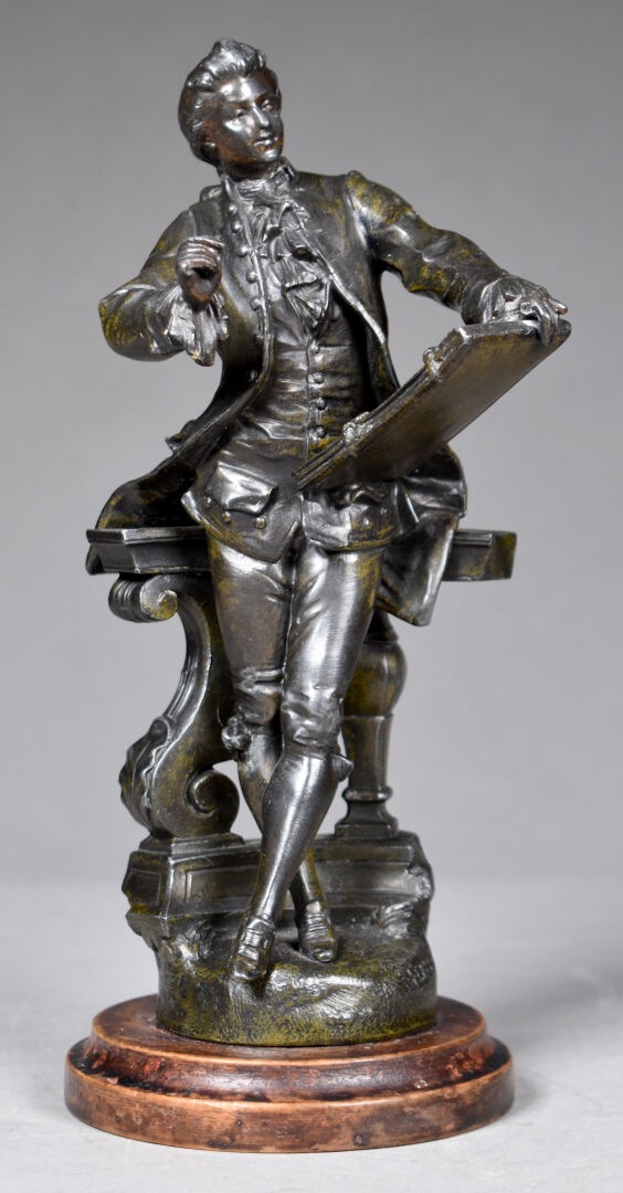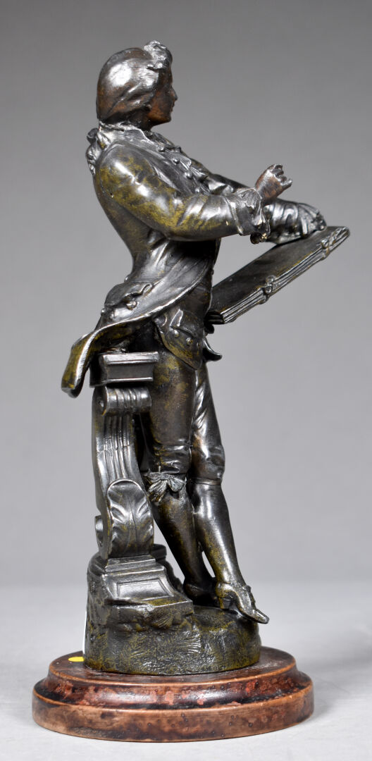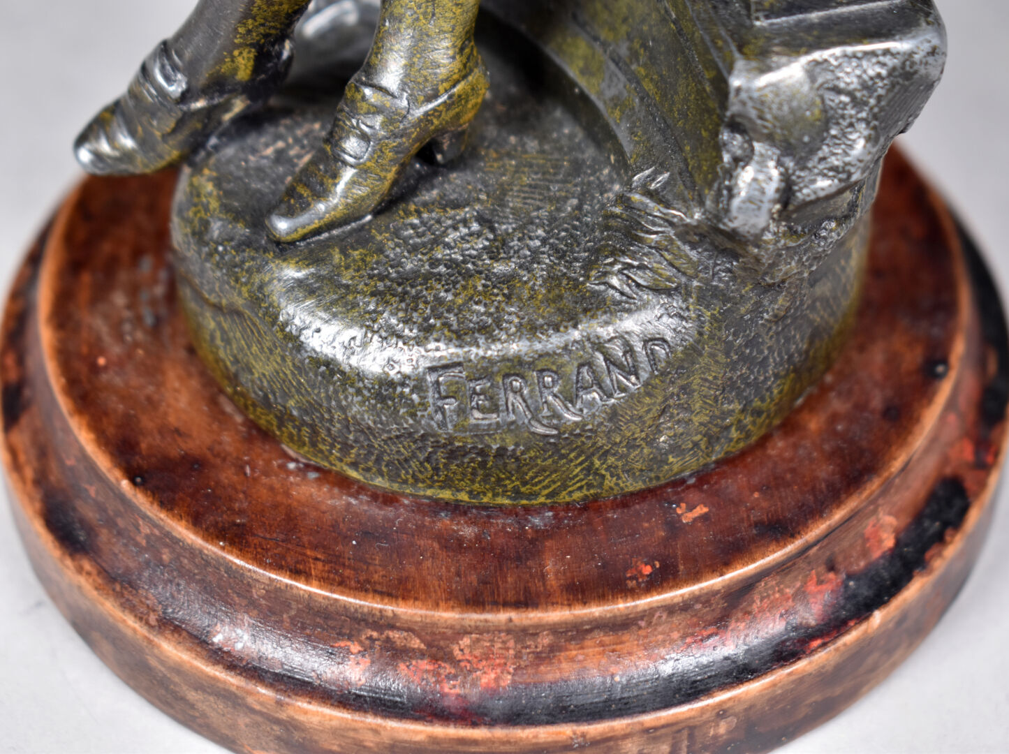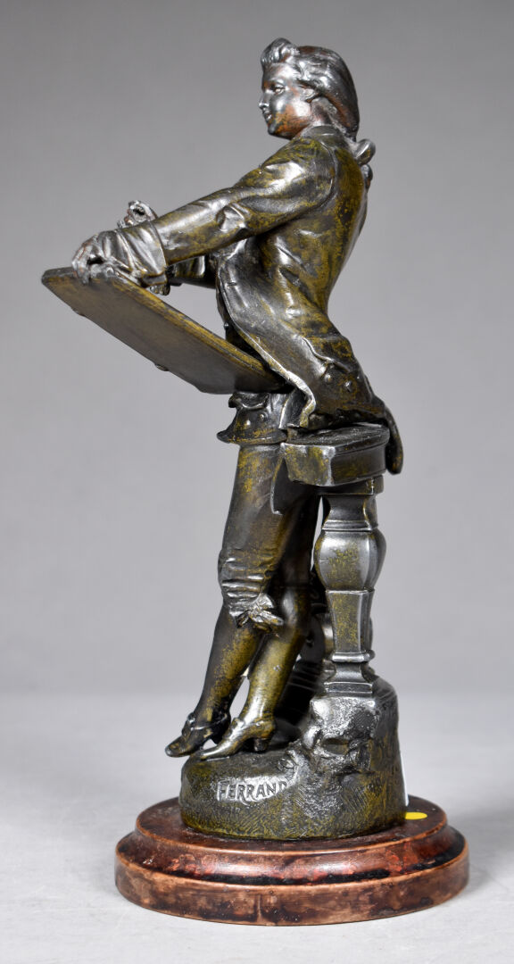 D’après Ernest Justin FERRAND (1846-1932). Gentilhomme écrivant. Régule à patine brun (manques). Signé sur la terrasse. Socle de bois . Haut. : 27 cm.