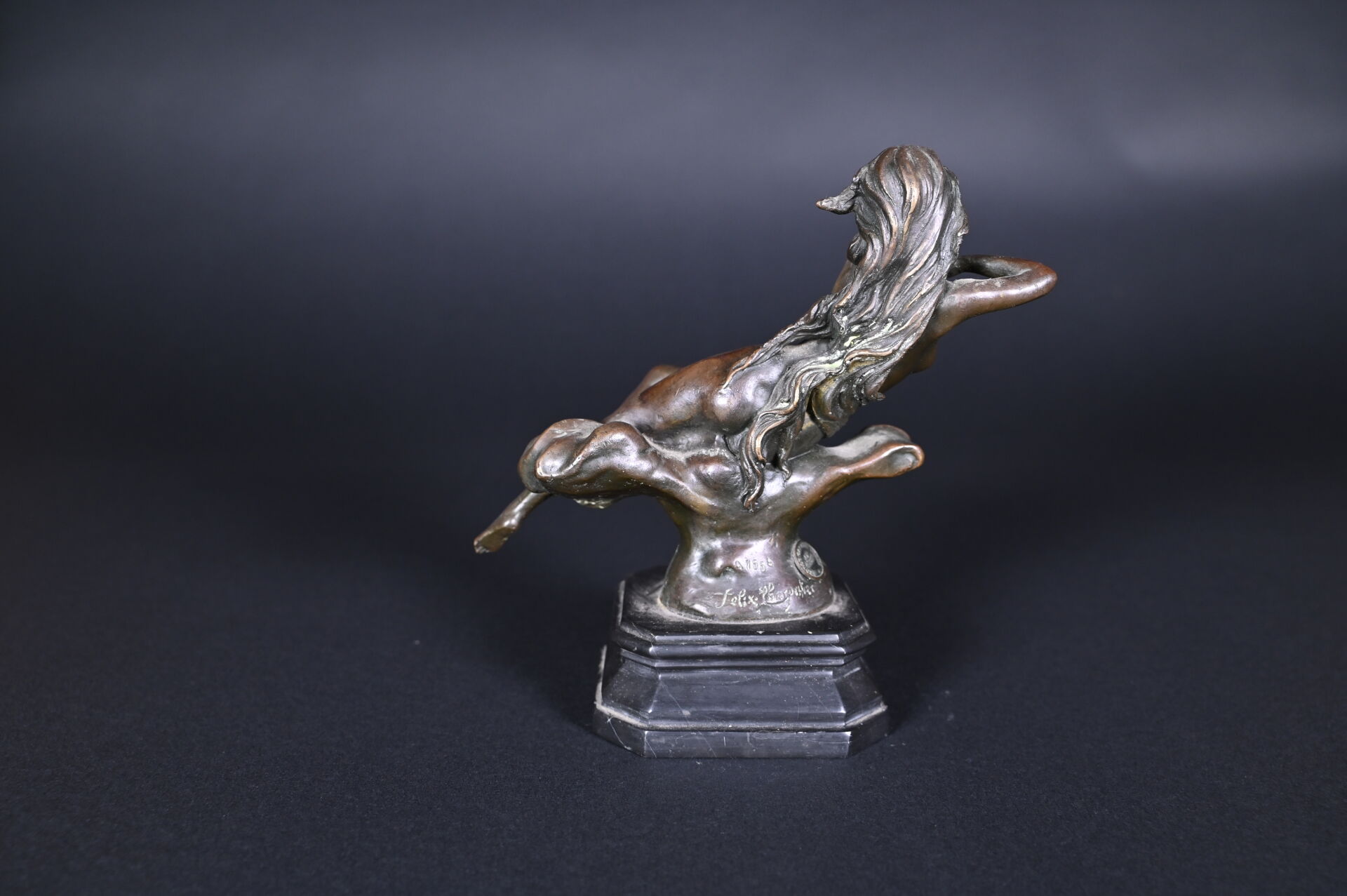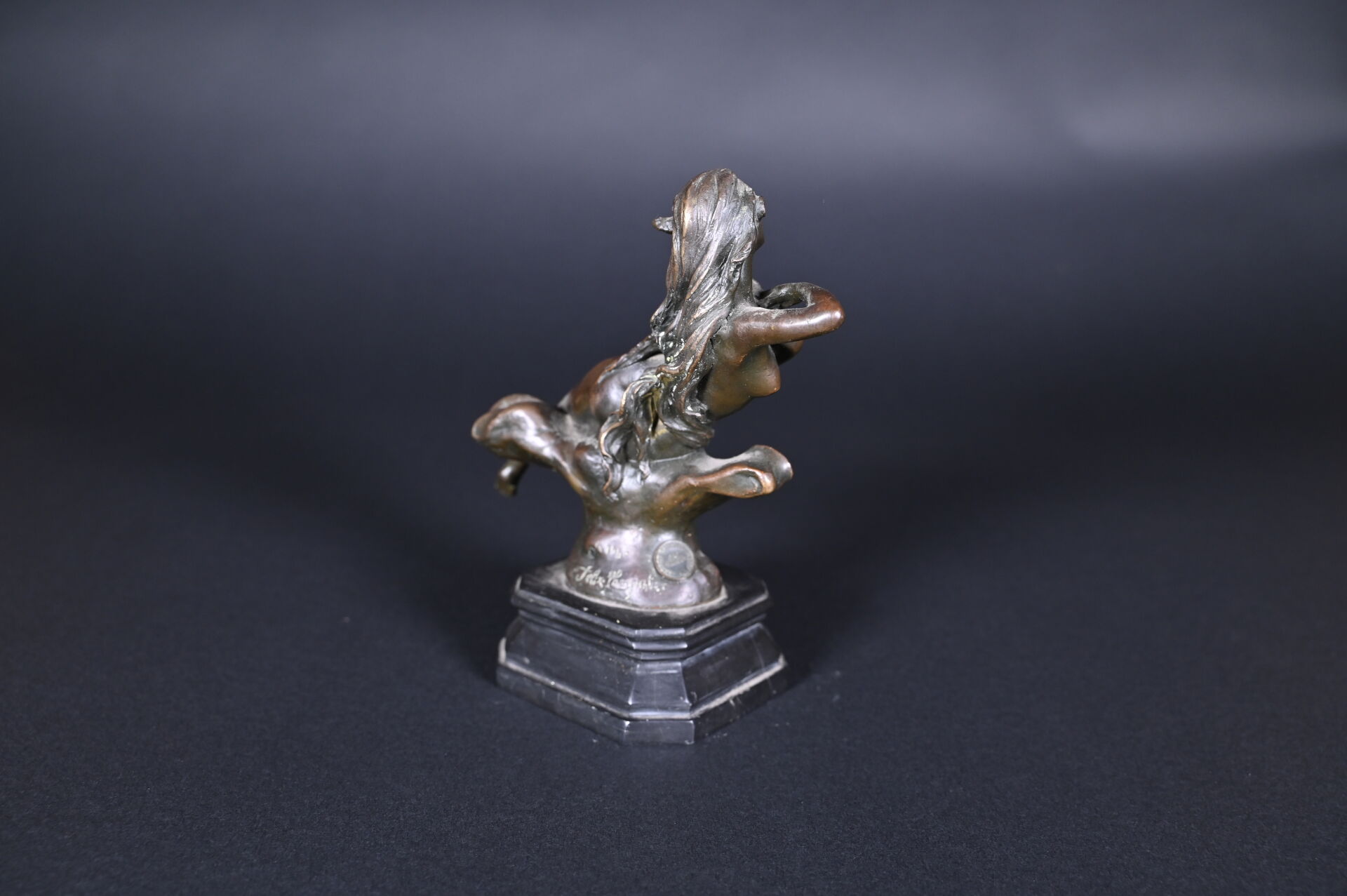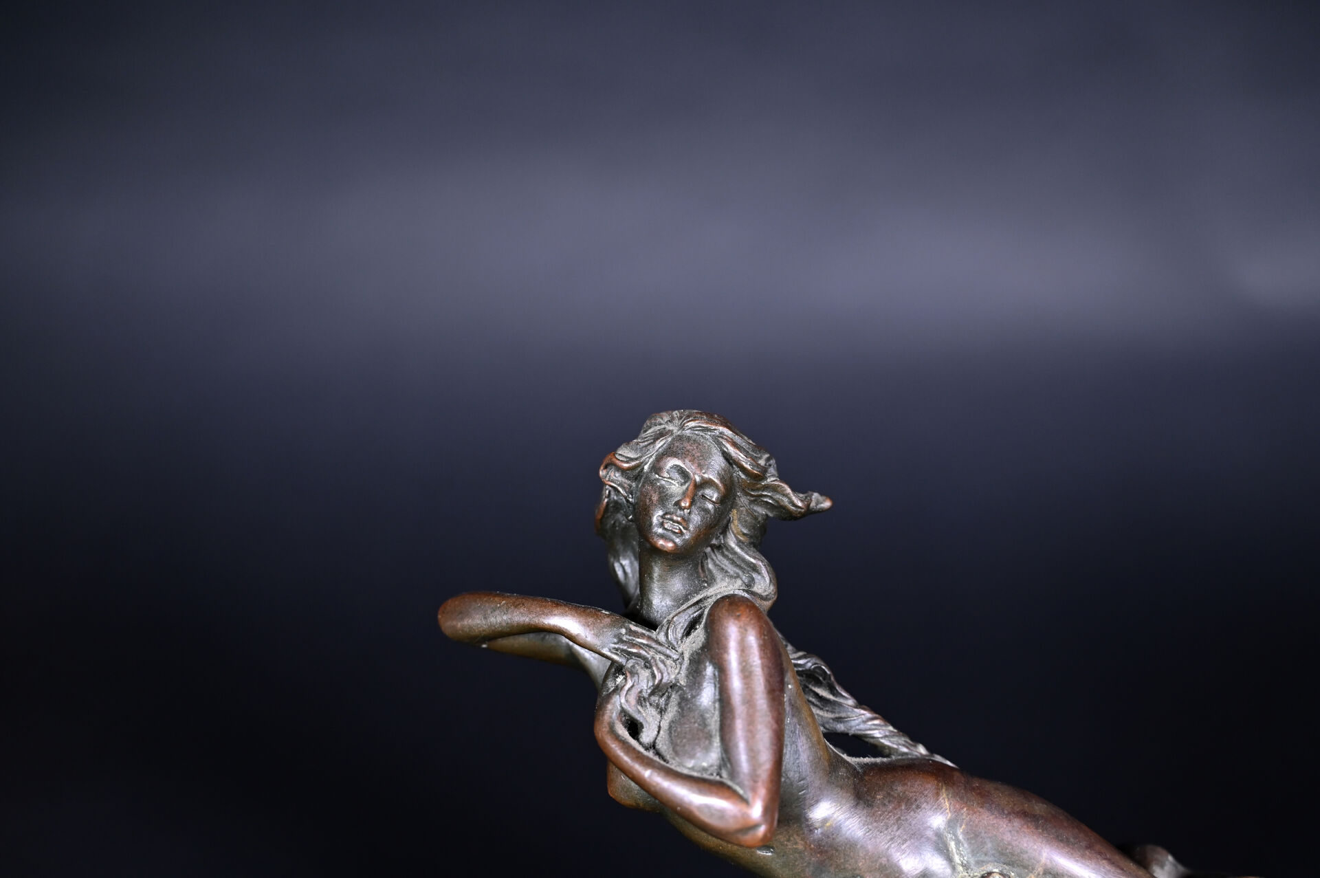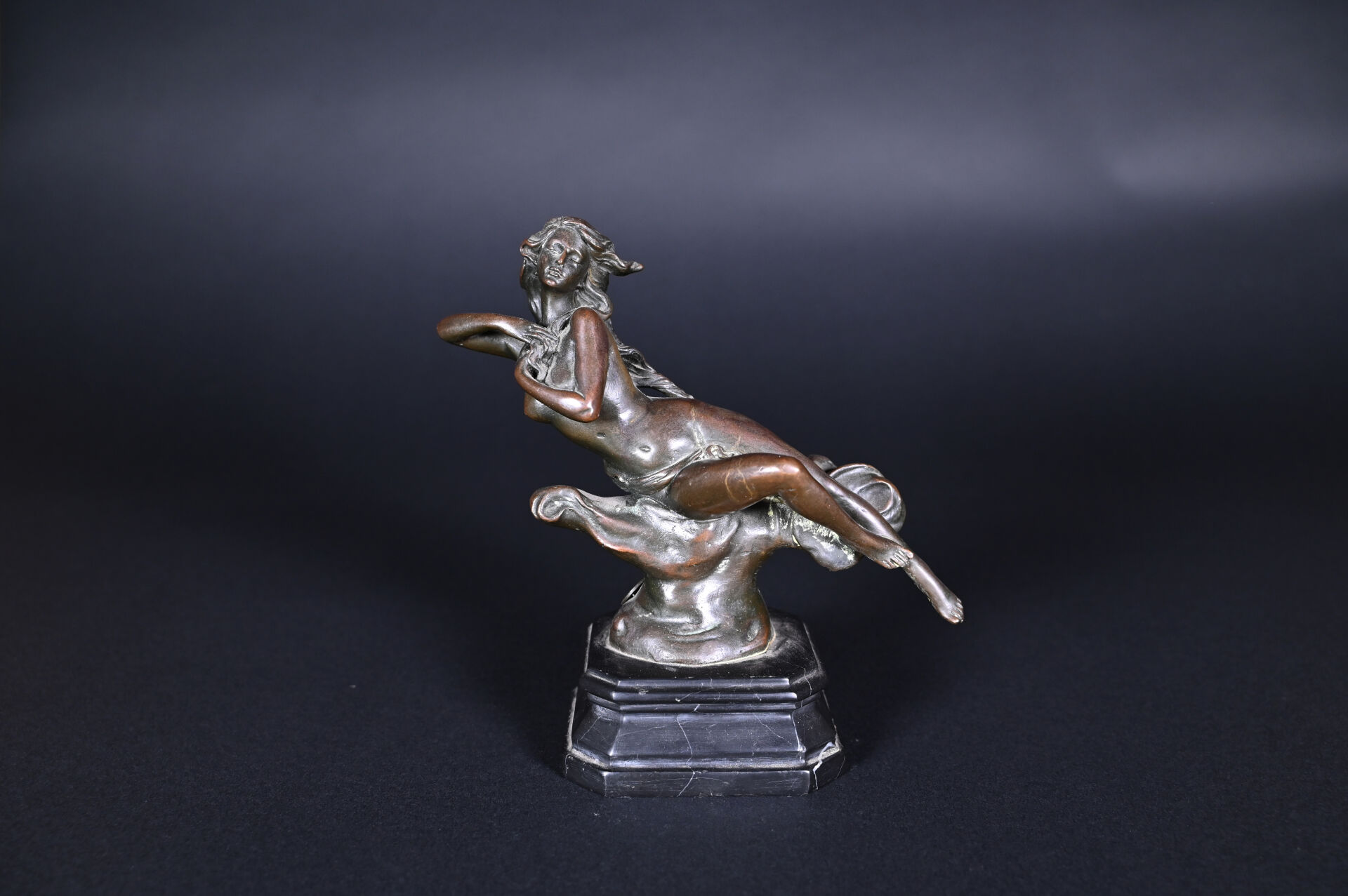 D’après Felix CHARPENTIER (1858-1924). Naïade sur les flots en bronze patiné brun. Signé, cachet fondeur et numéroté A7576 au dos. Socle en marbre noir à pans coupés. Haut. : 20 cm.