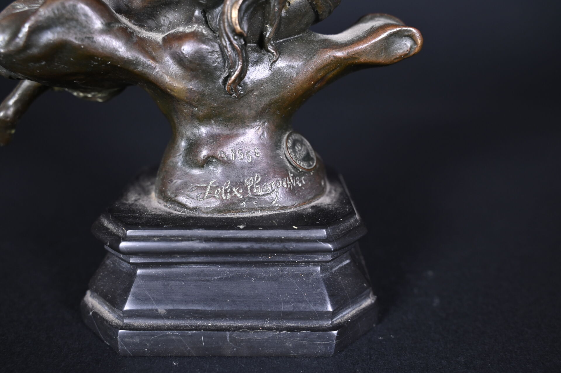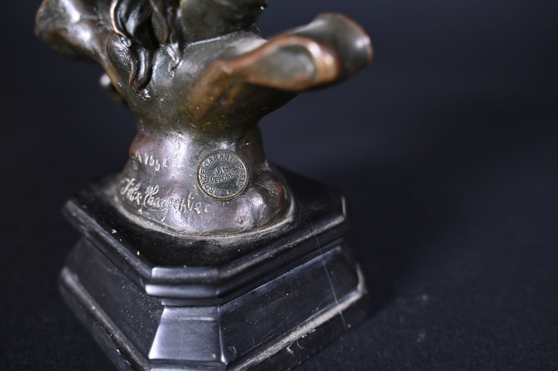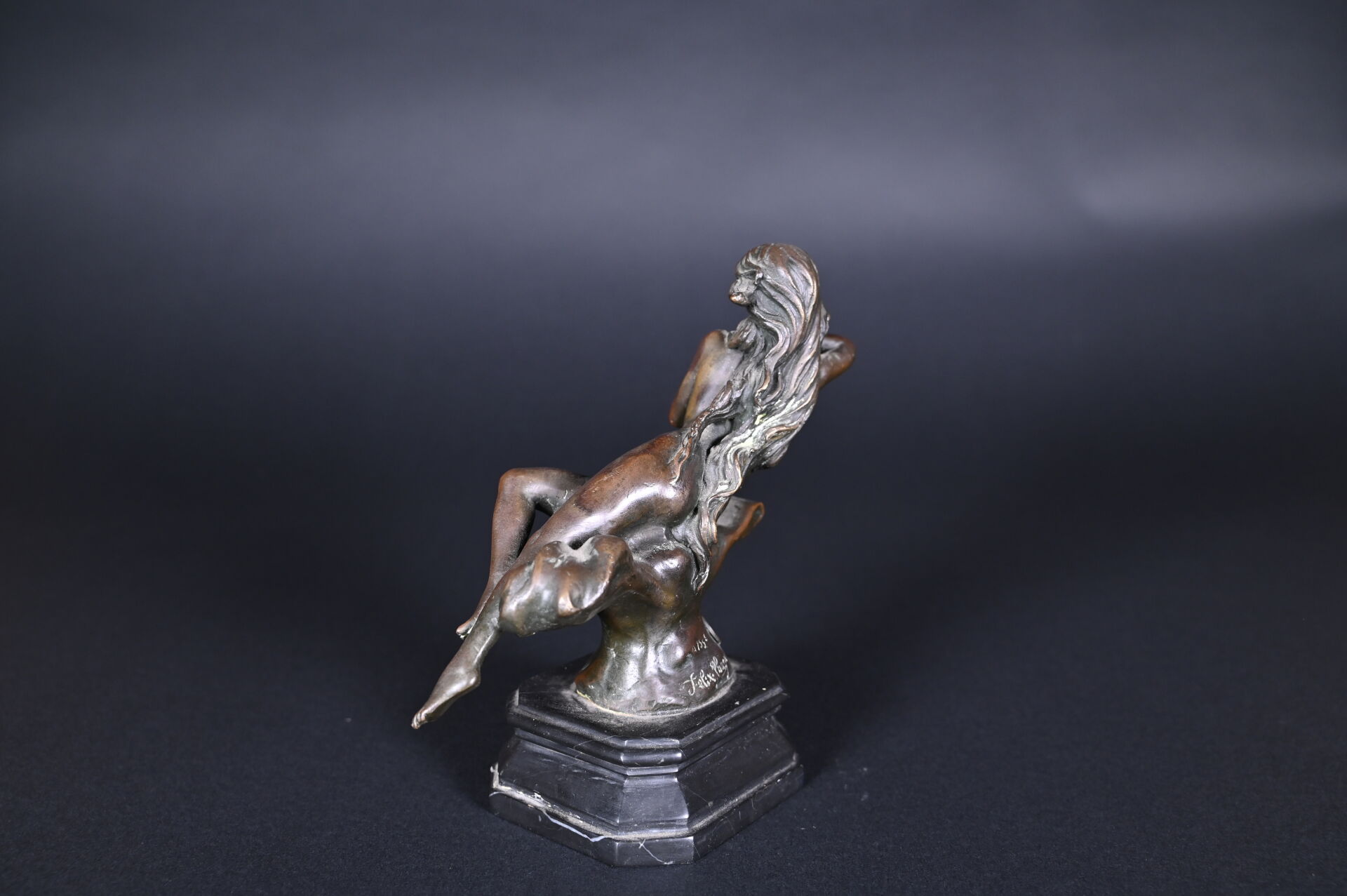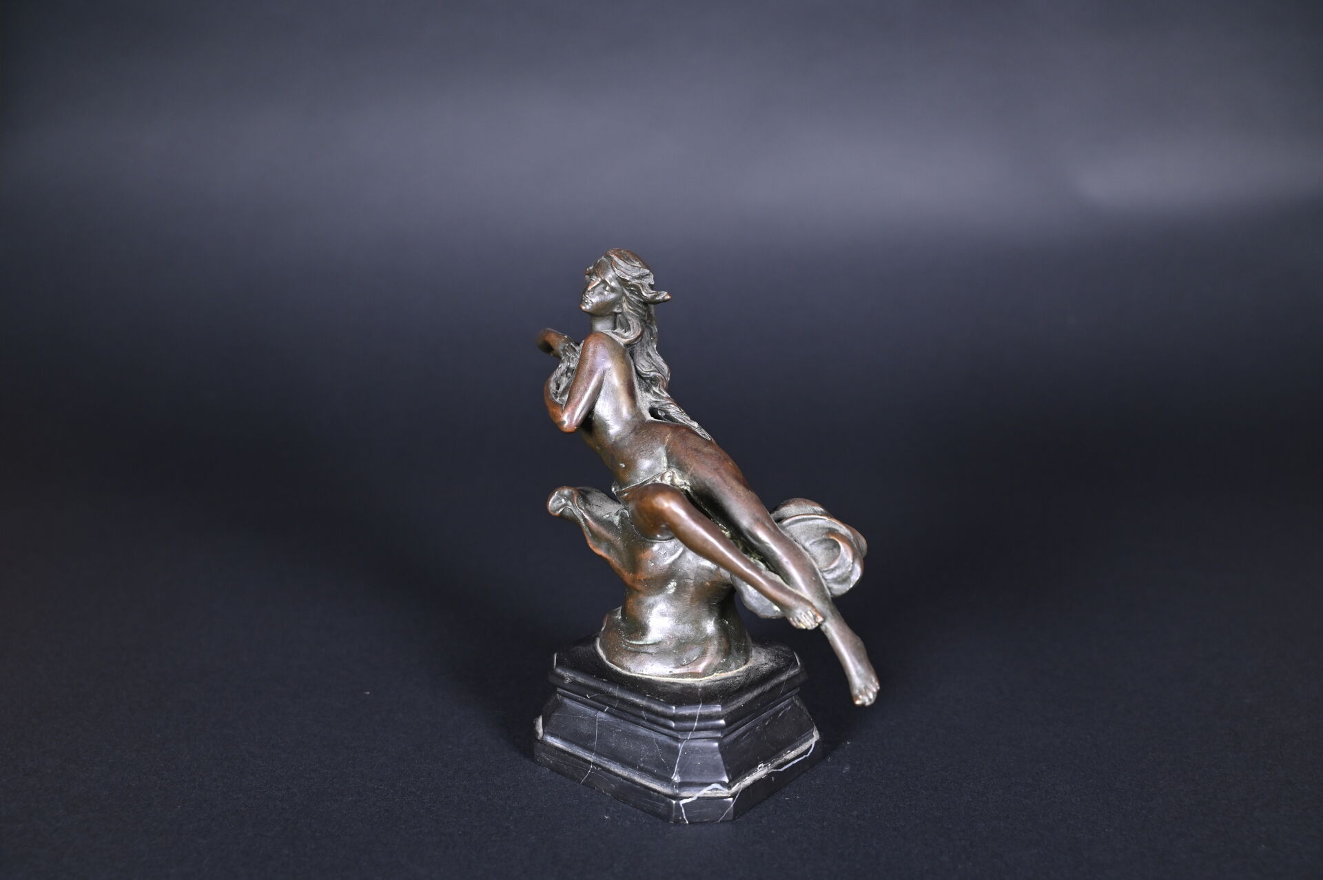D’après Felix CHARPENTIER (1858-1924). Naïade sur les flots en bronze patiné brun. Signé, cachet fondeur et numéroté A7576 au dos. Socle en marbre noir à pans coupés. Haut. : 20 cm.