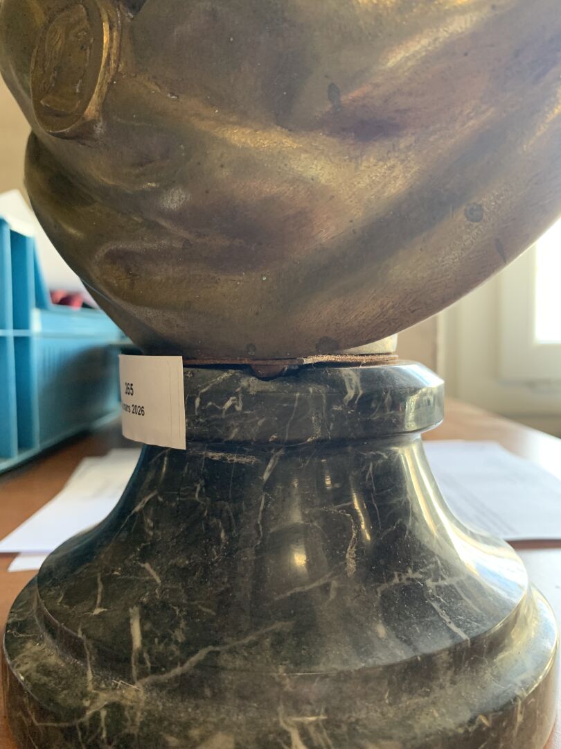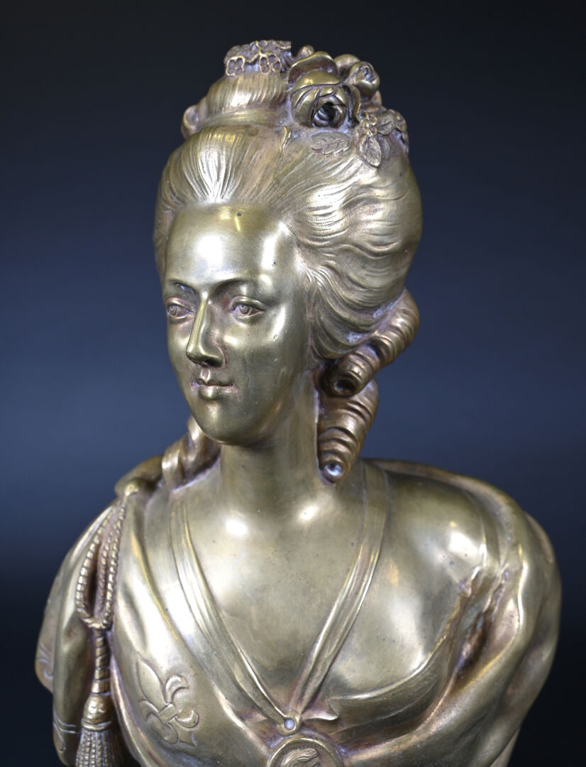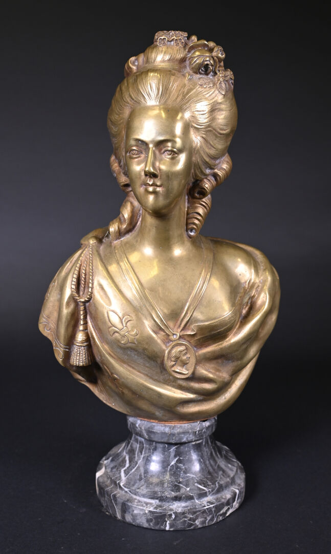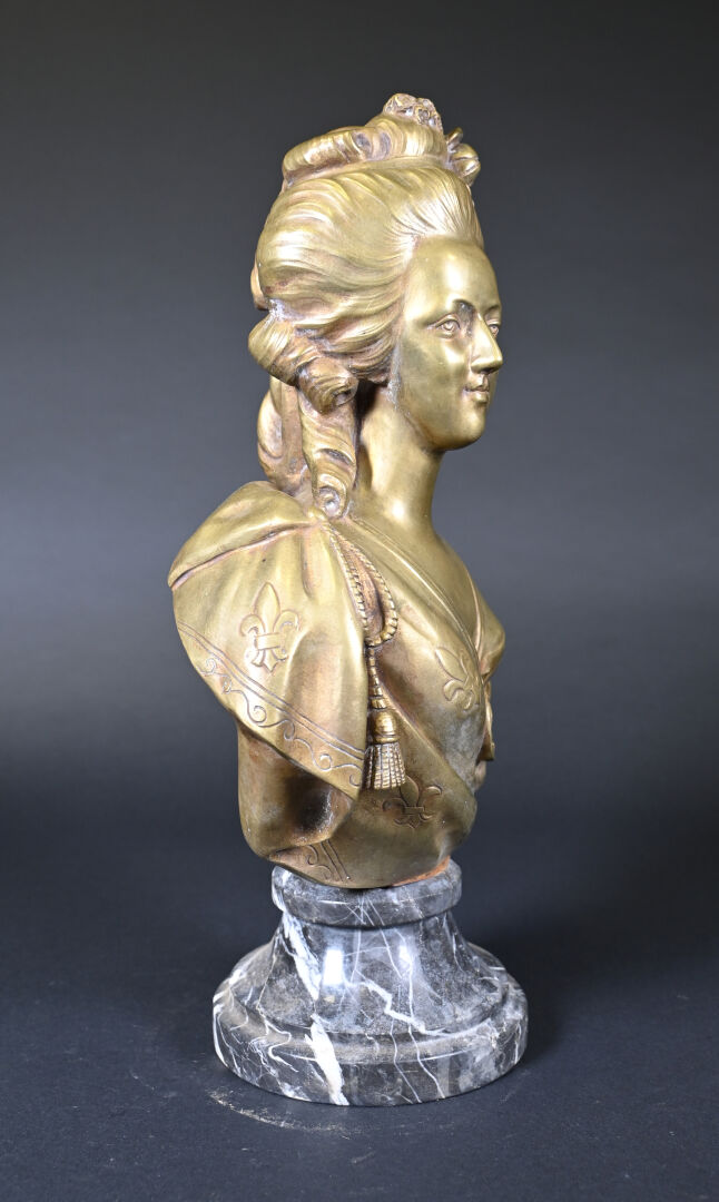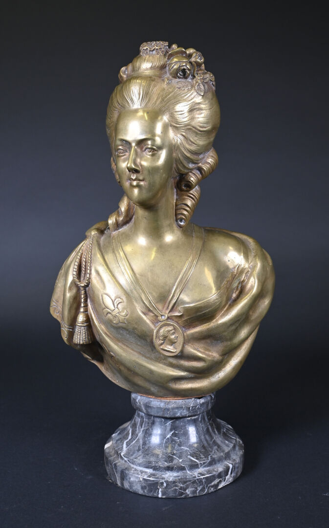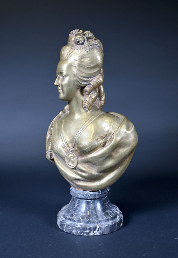 D’après Félix LECOMTE (1737-1817). Buste en bronze représentant Marie Antoinette (éclat au socle, fissure au niveau de la fixation avec le marbre, usures à la dorure). Signé au dos. Socle de marbre gris veiné blanc. Haut. : 44 cm.