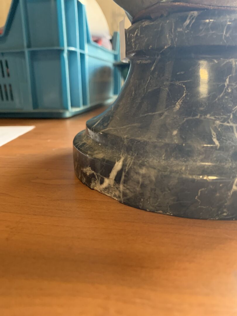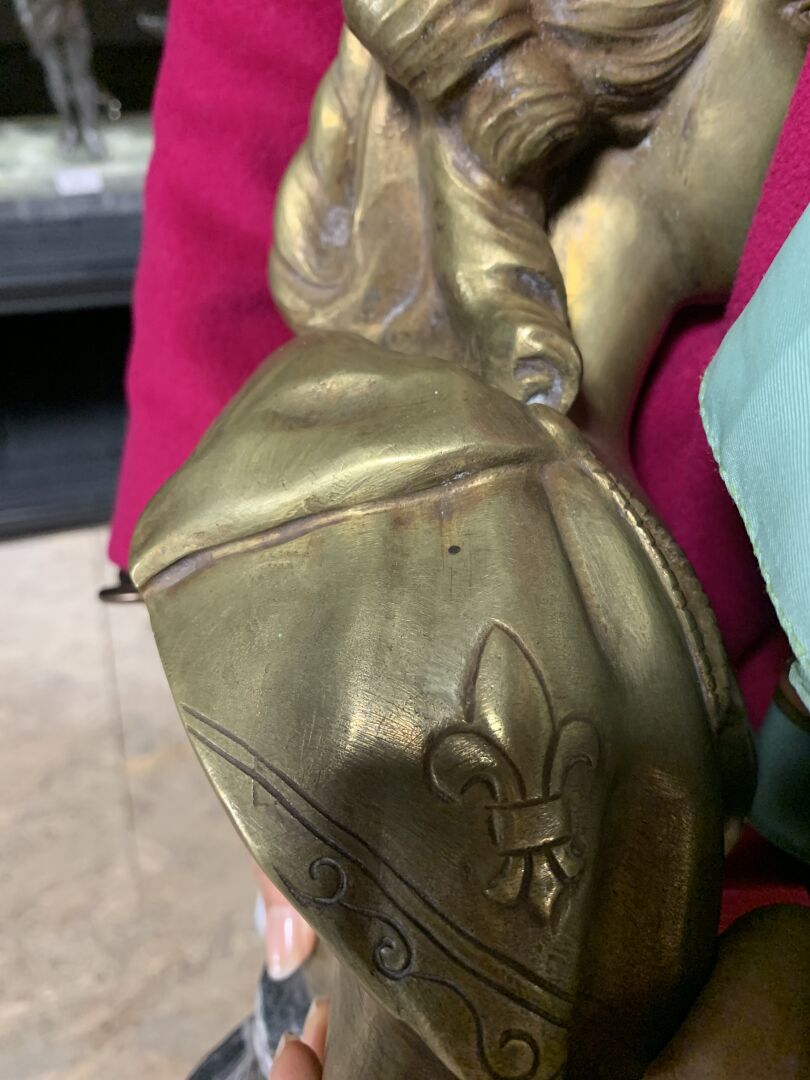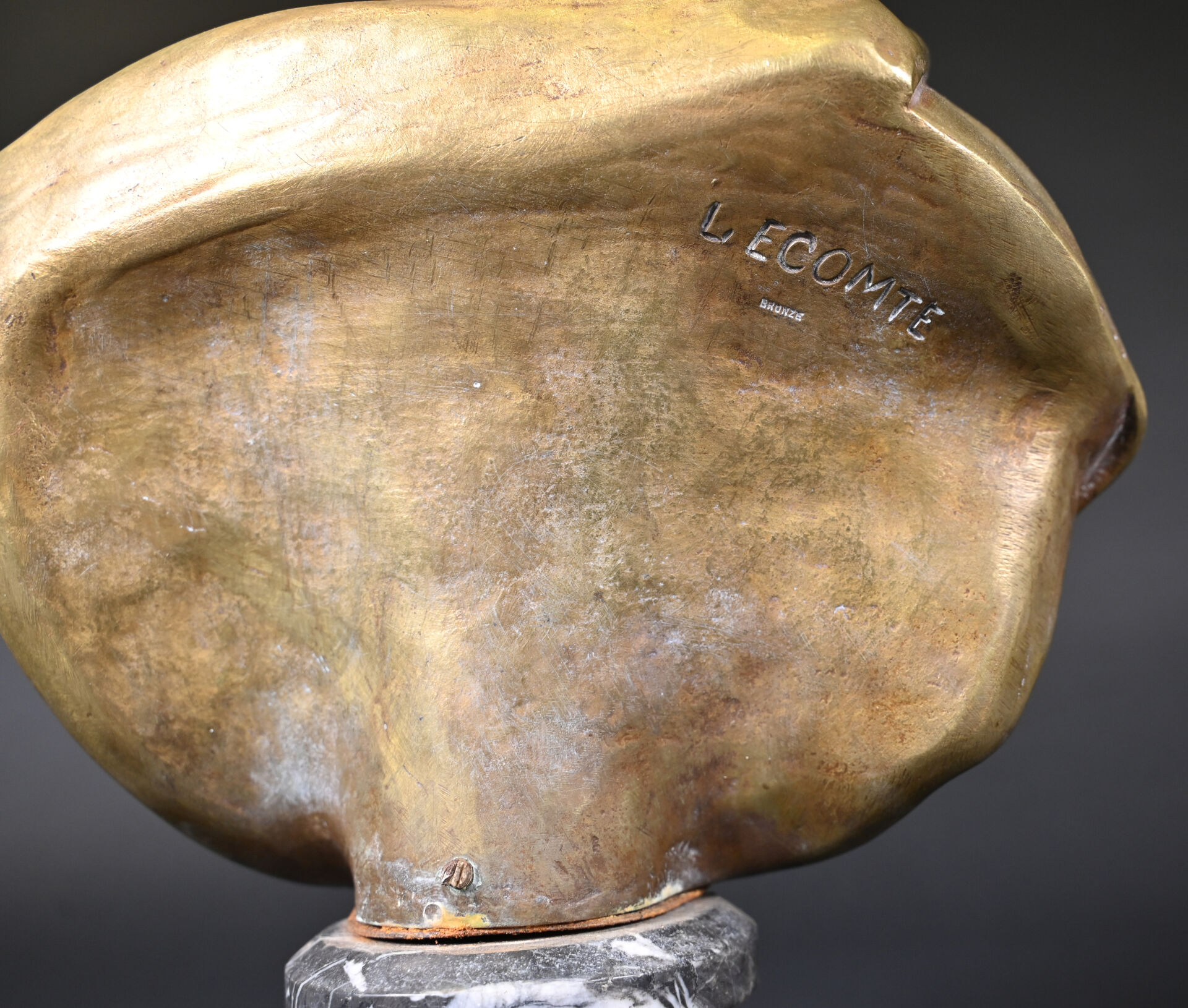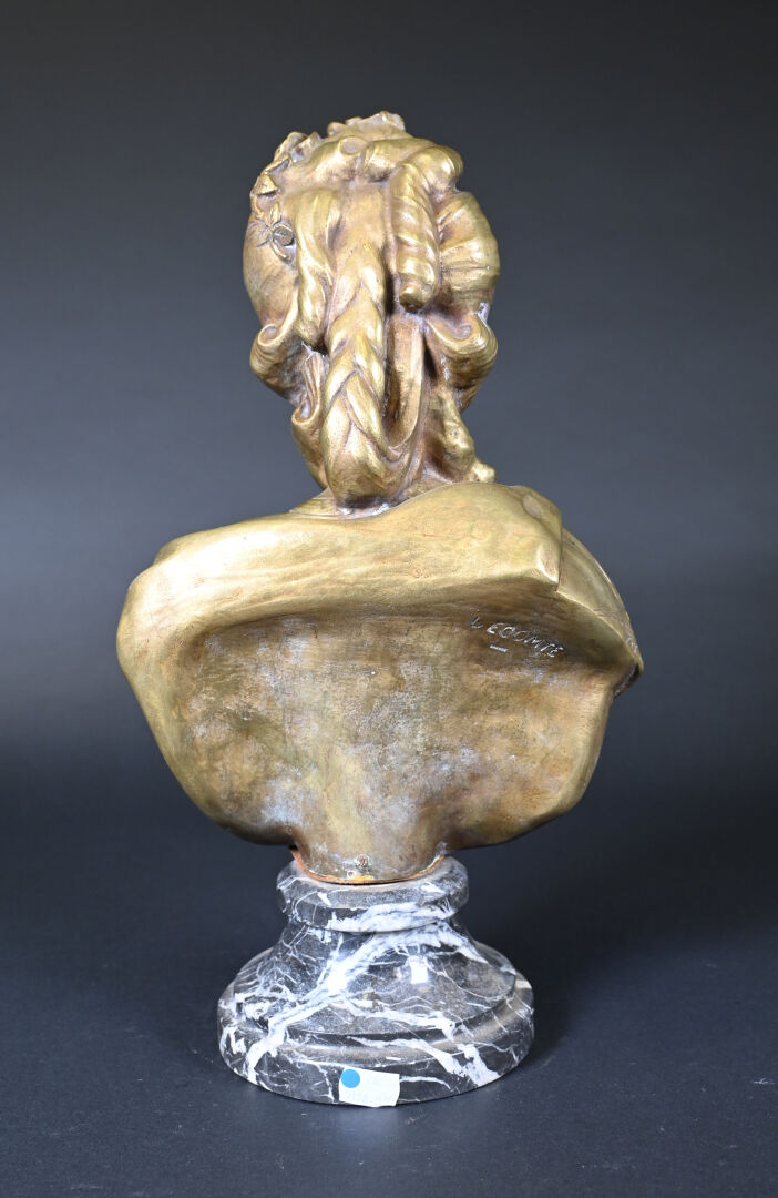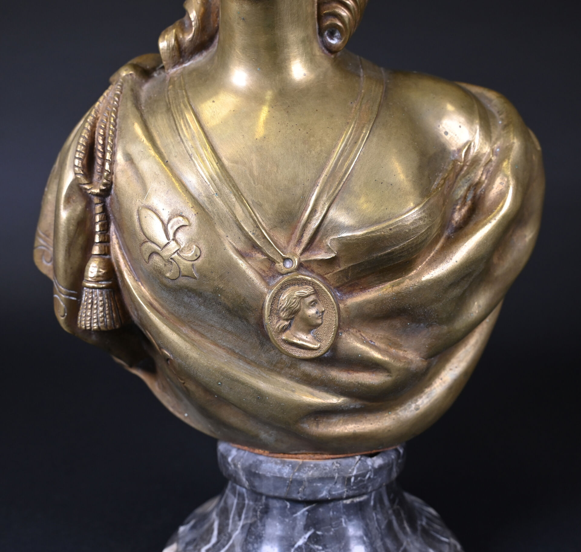 D’après Félix LECOMTE (1737-1817). Buste en bronze représentant Marie Antoinette (éclat au socle, fissure au niveau de la fixation avec le marbre, usures à la dorure). Signé au dos. Socle de marbre gris veiné blanc. Haut. : 44 cm.