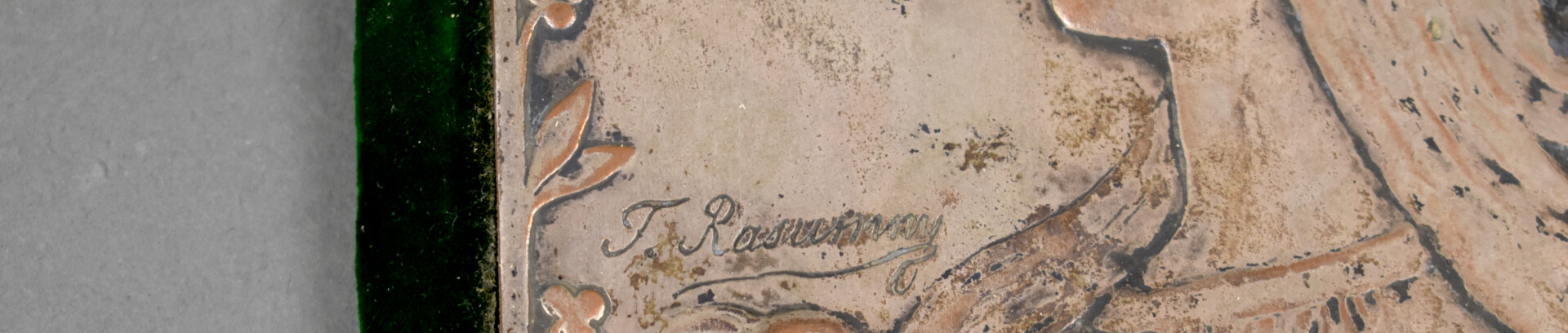 D’après Félix RASUMNY (1869-1940). Petit calendrier en métal argenté à décor d’une femme de profil (quelques usures). Epoque Art Nouveau. Dim. plaque : 13,7 x 13 cm.