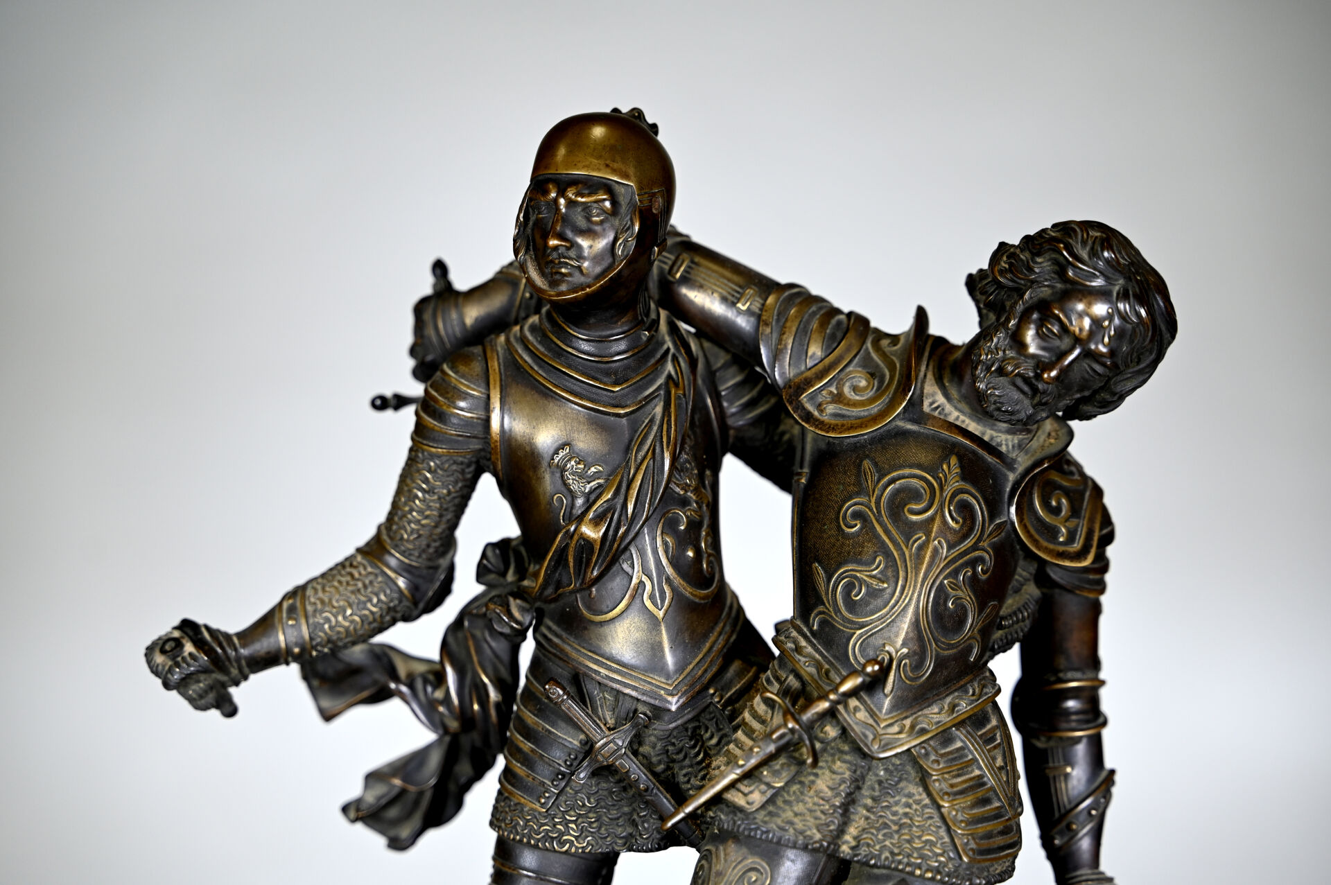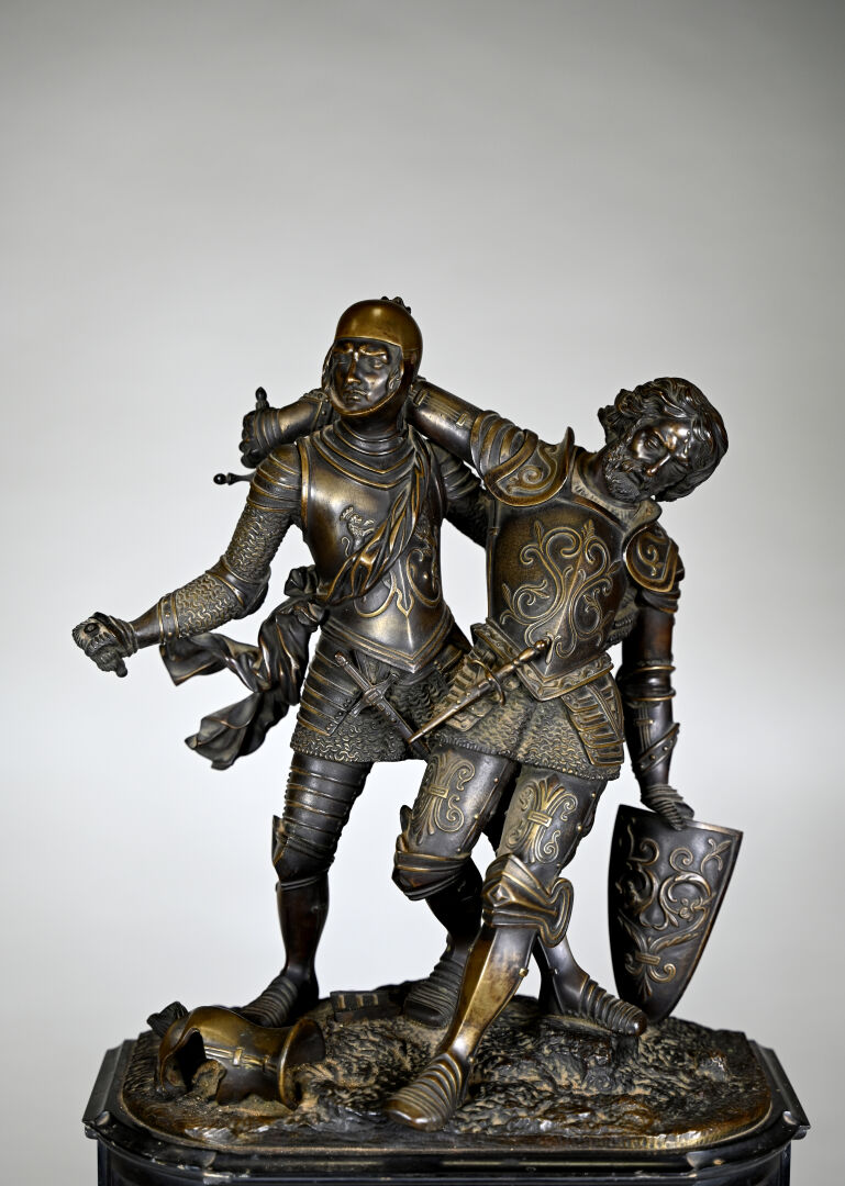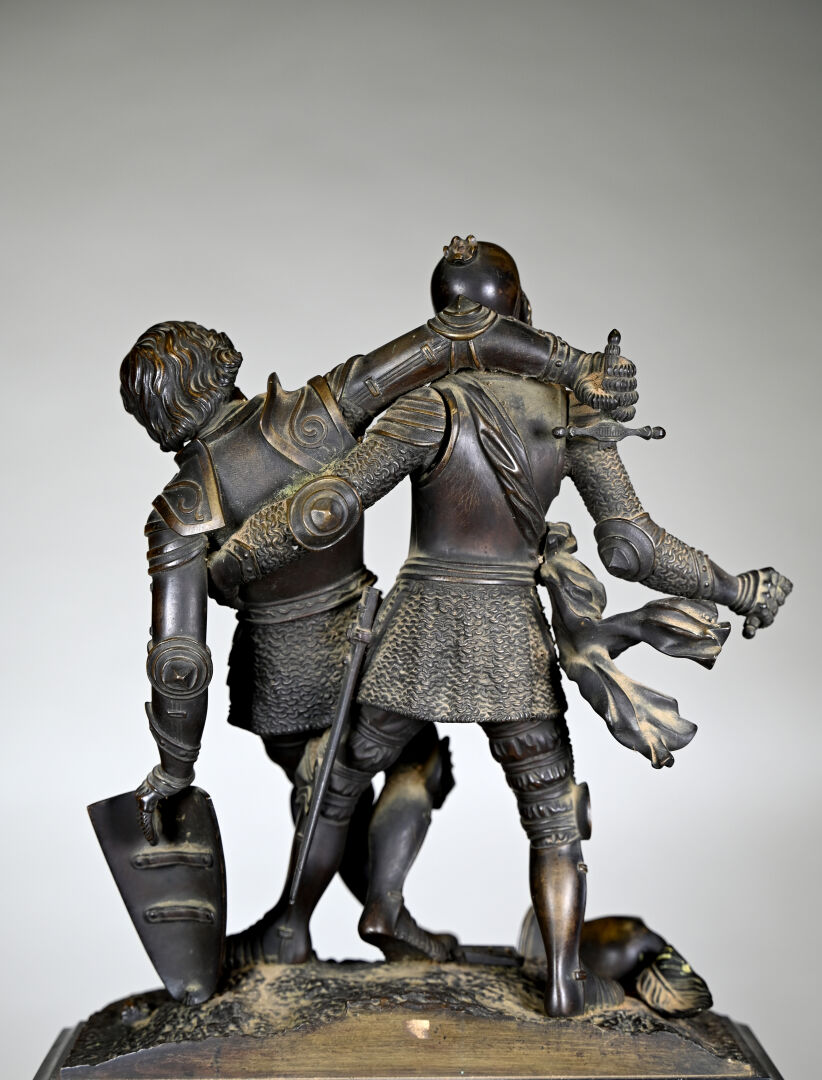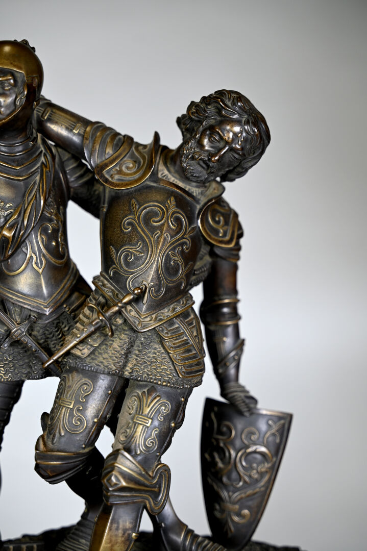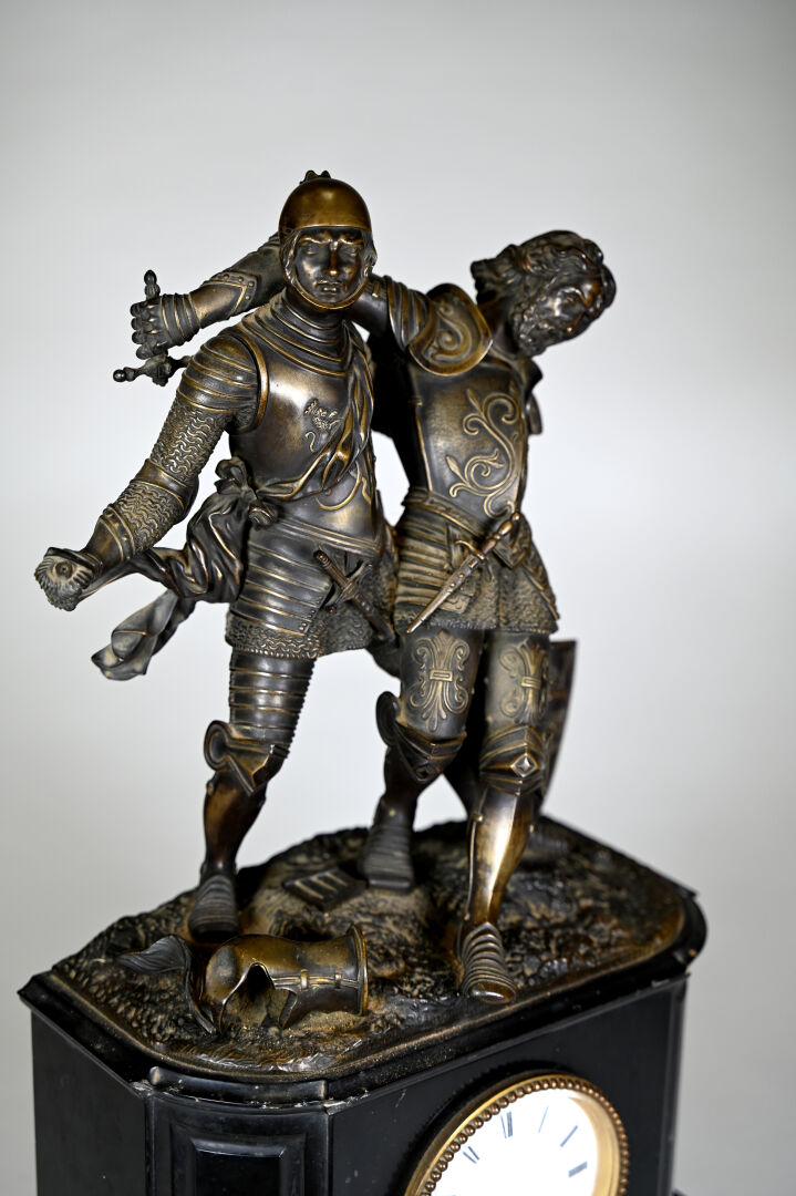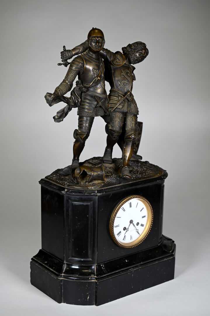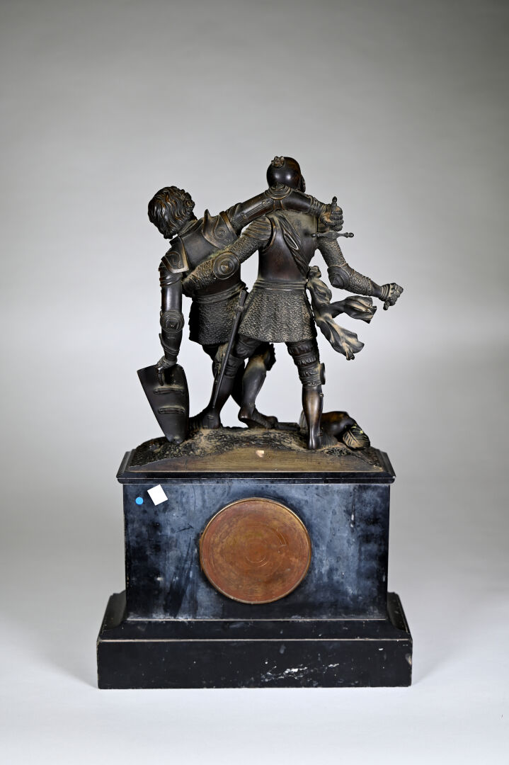 D’après Jean-François-Théodore GECHTER Paris, 1796 – 1844. Le prince Edouard sauvant la vie d’Henri III Plantagenêt. Bronze patiné brun (accident et manques), ornant une pendule borne en marbre noir. Haut. : 65 cm – Larg. : 38 cm – Prof. : 20 cm.