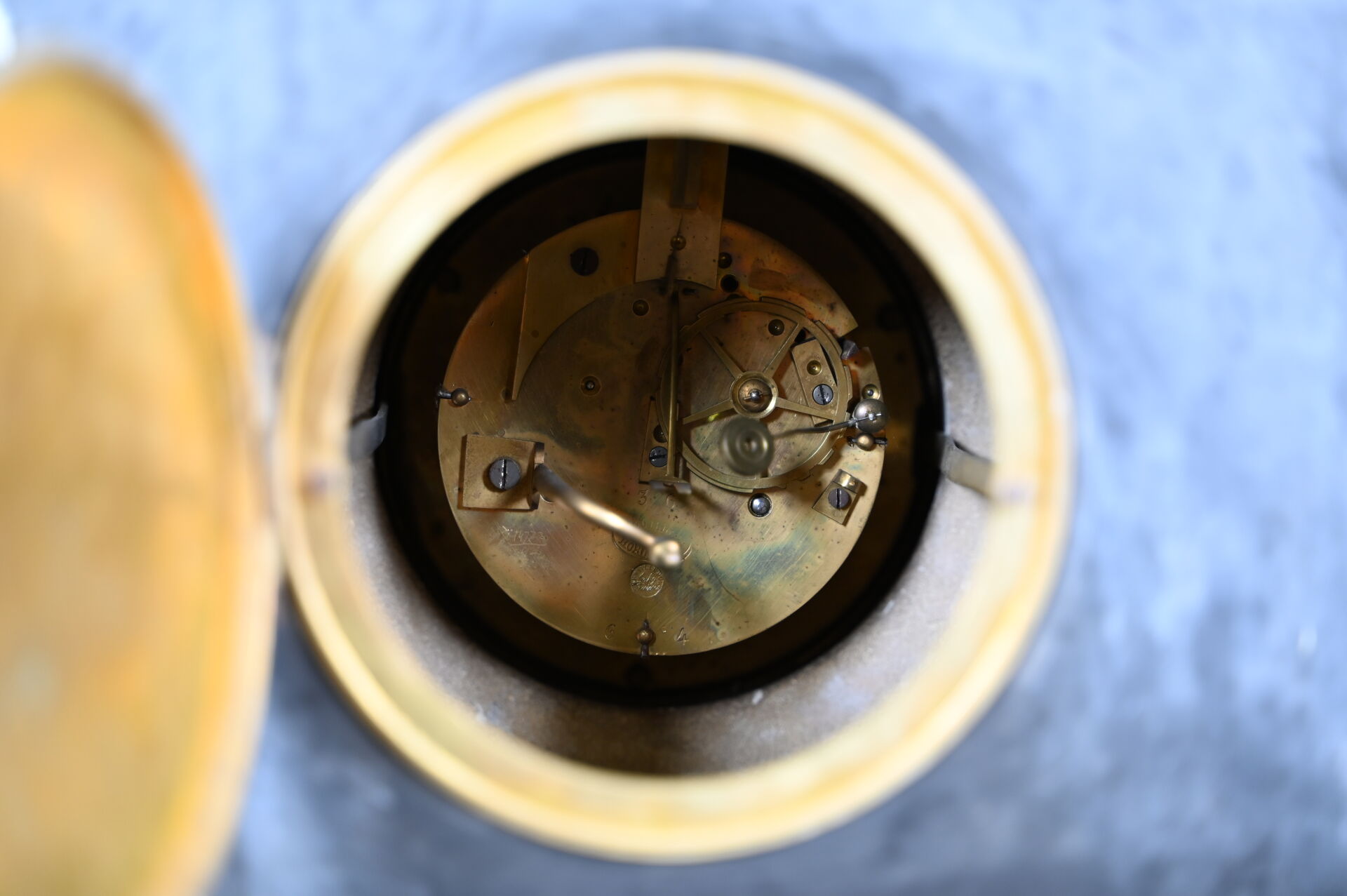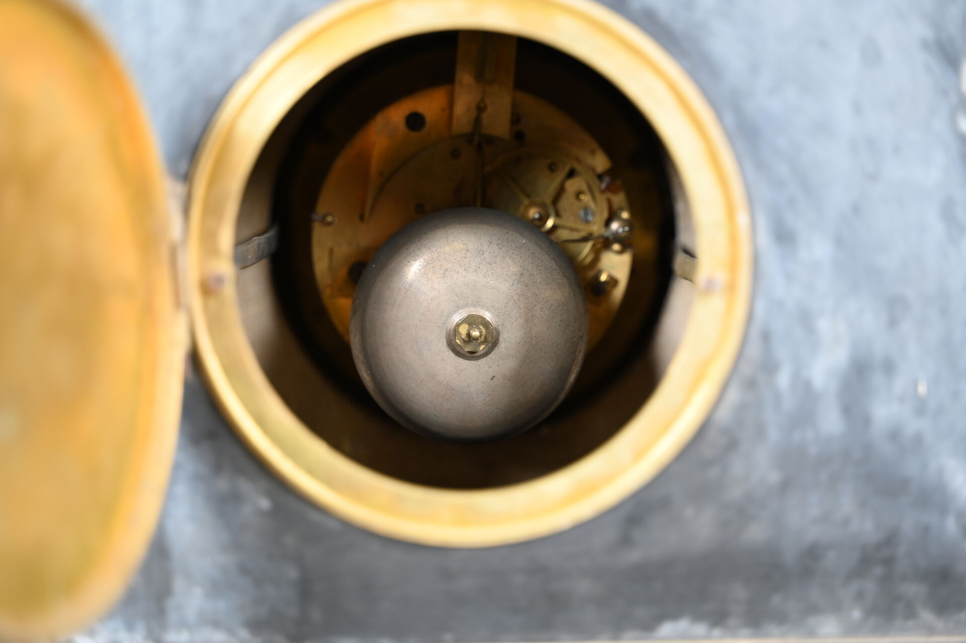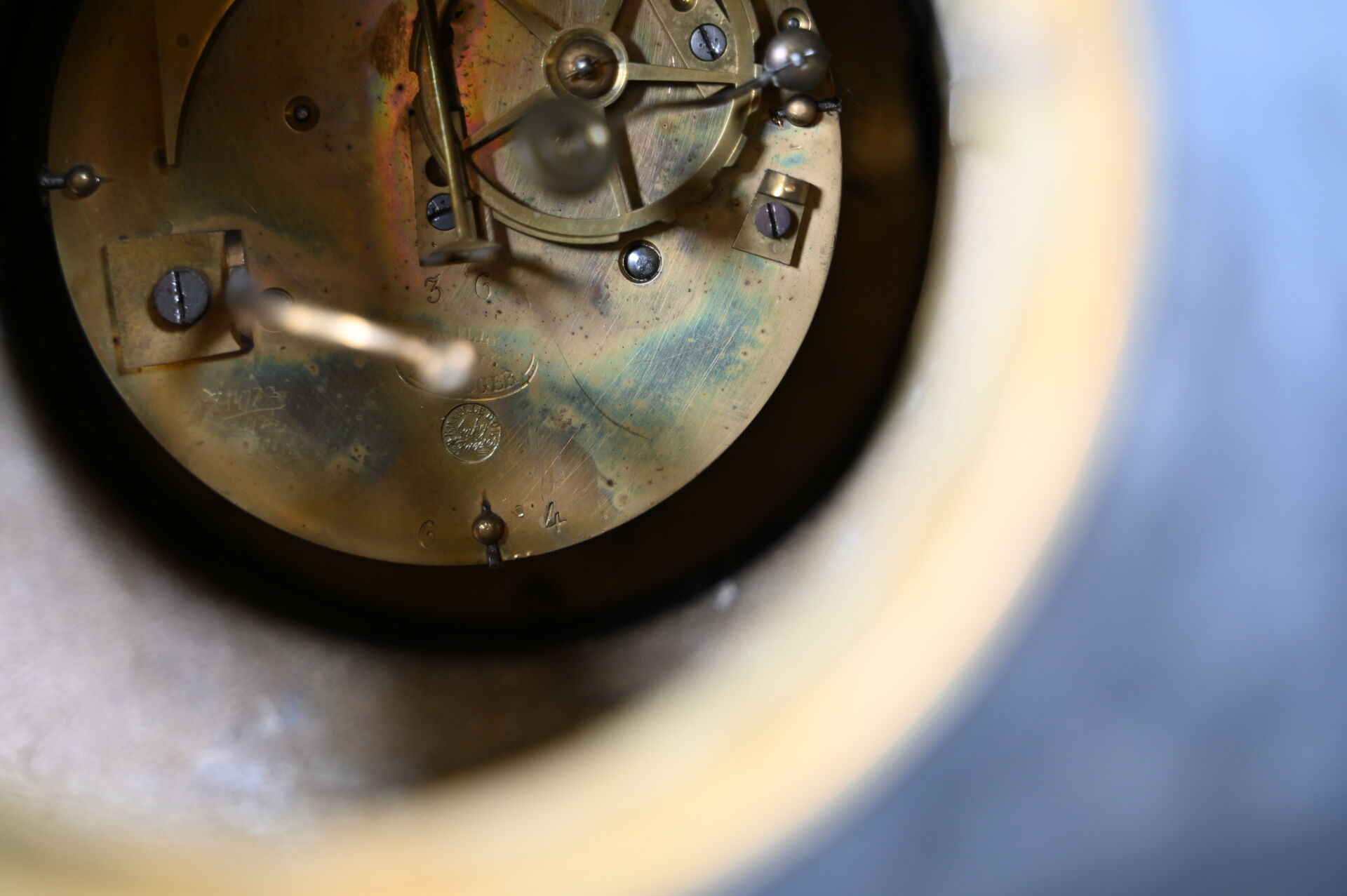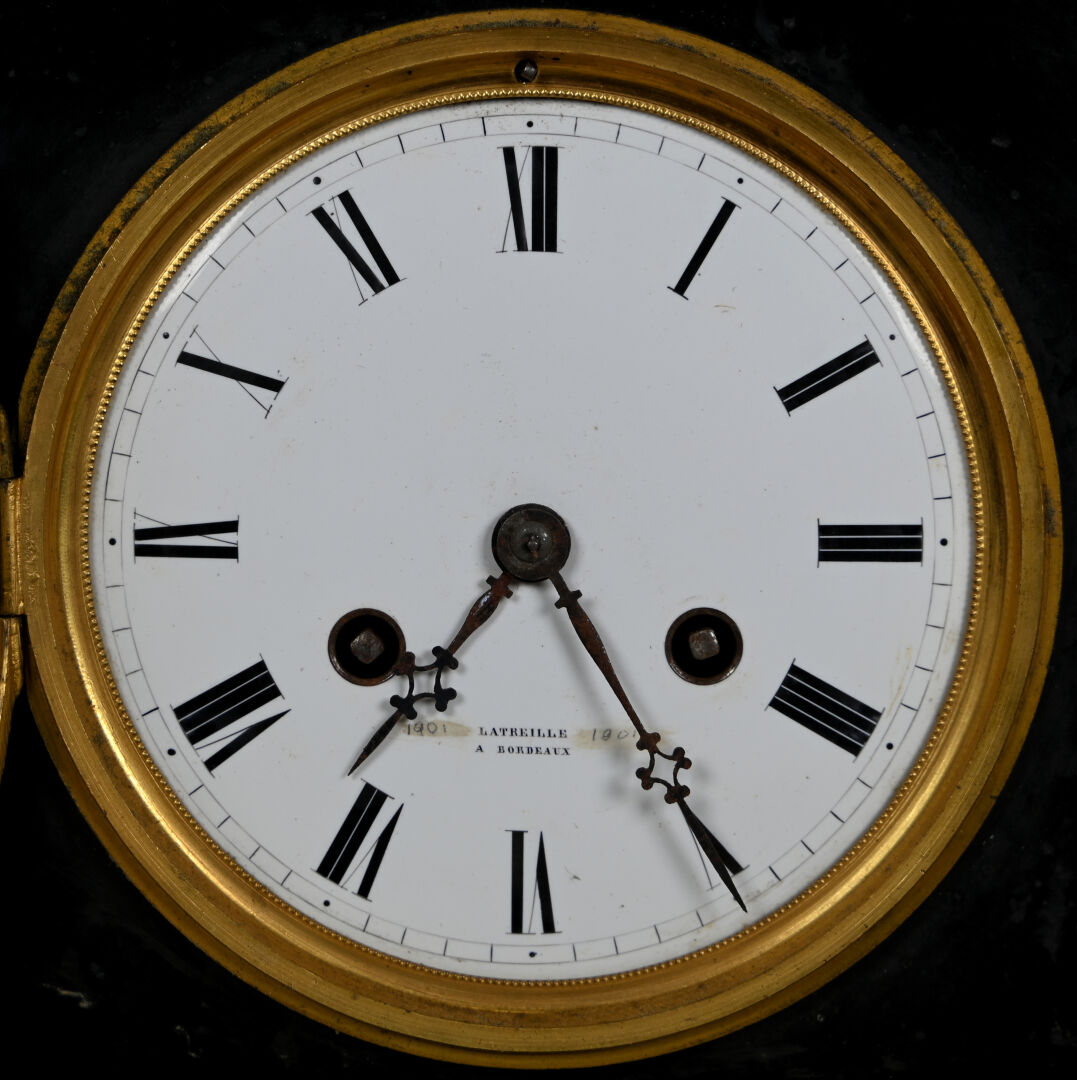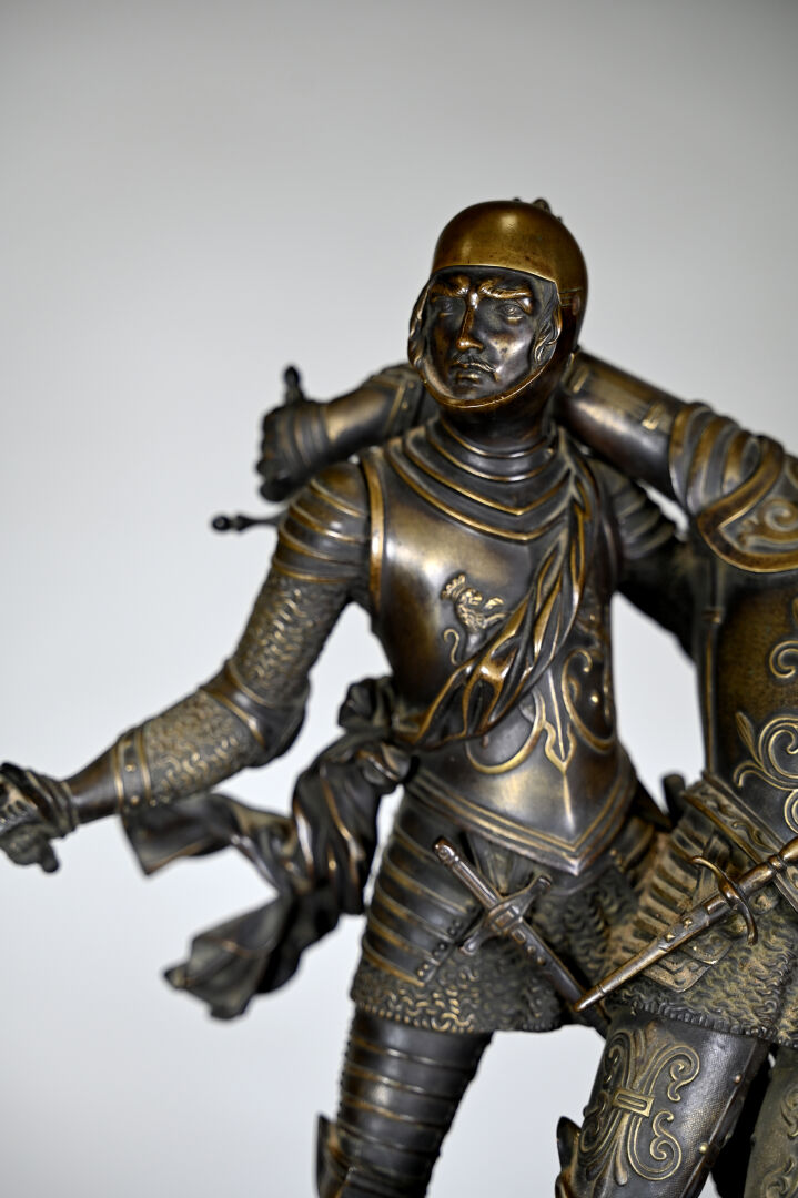 D’après Jean-François-Théodore GECHTER Paris, 1796 – 1844. Le prince Edouard sauvant la vie d’Henri III Plantagenêt. Bronze patiné brun (accident et manques), ornant une pendule borne en marbre noir. Haut. : 65 cm – Larg. : 38 cm – Prof. : 20 cm.