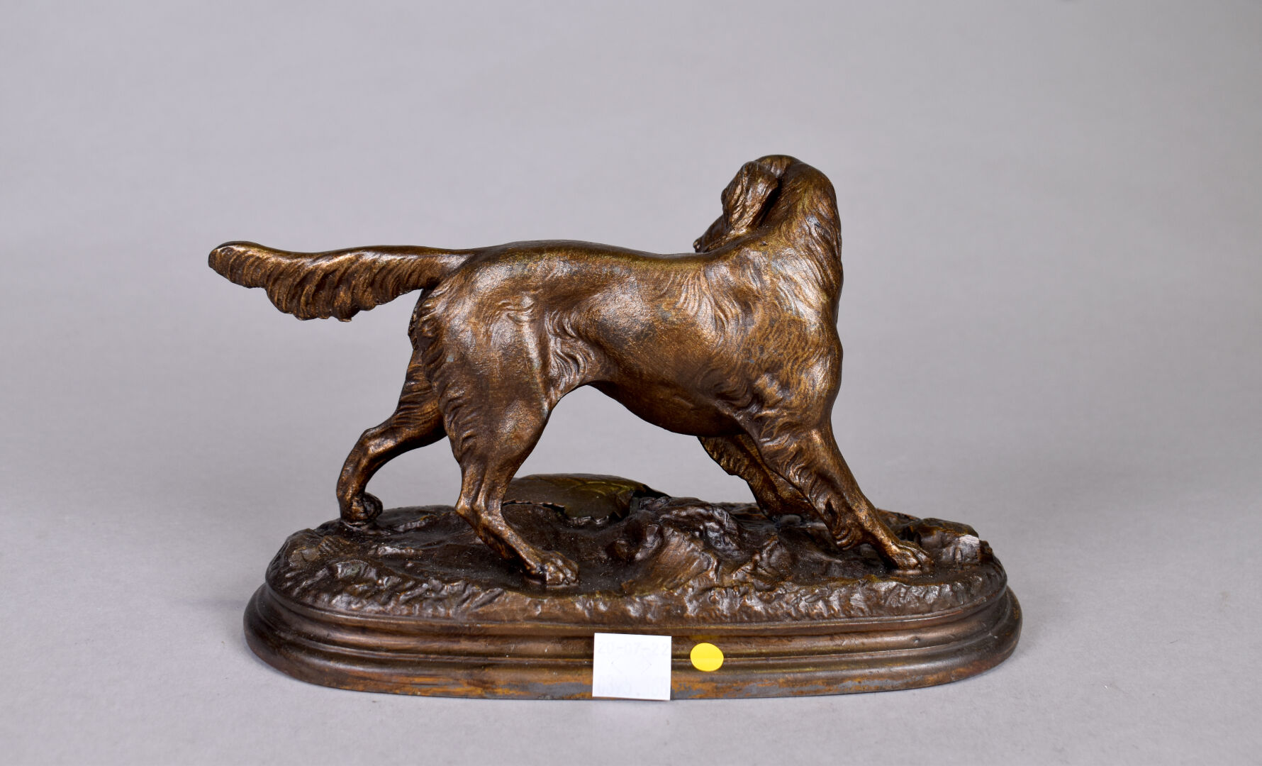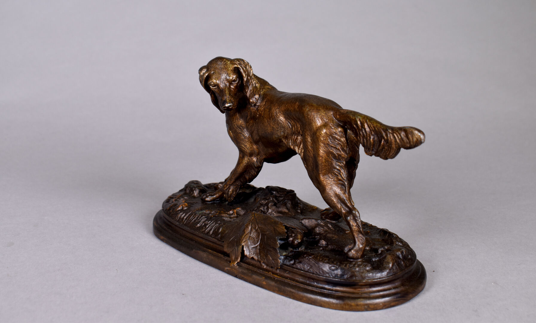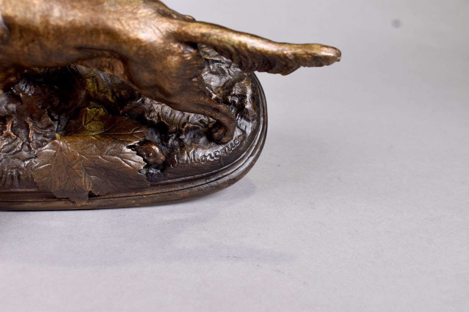 D’après Jules MOIGNEZ (1835-1894). Chien de chasse en régule patiné brun et or. Signé sur la base. Haut. : 14 cm.