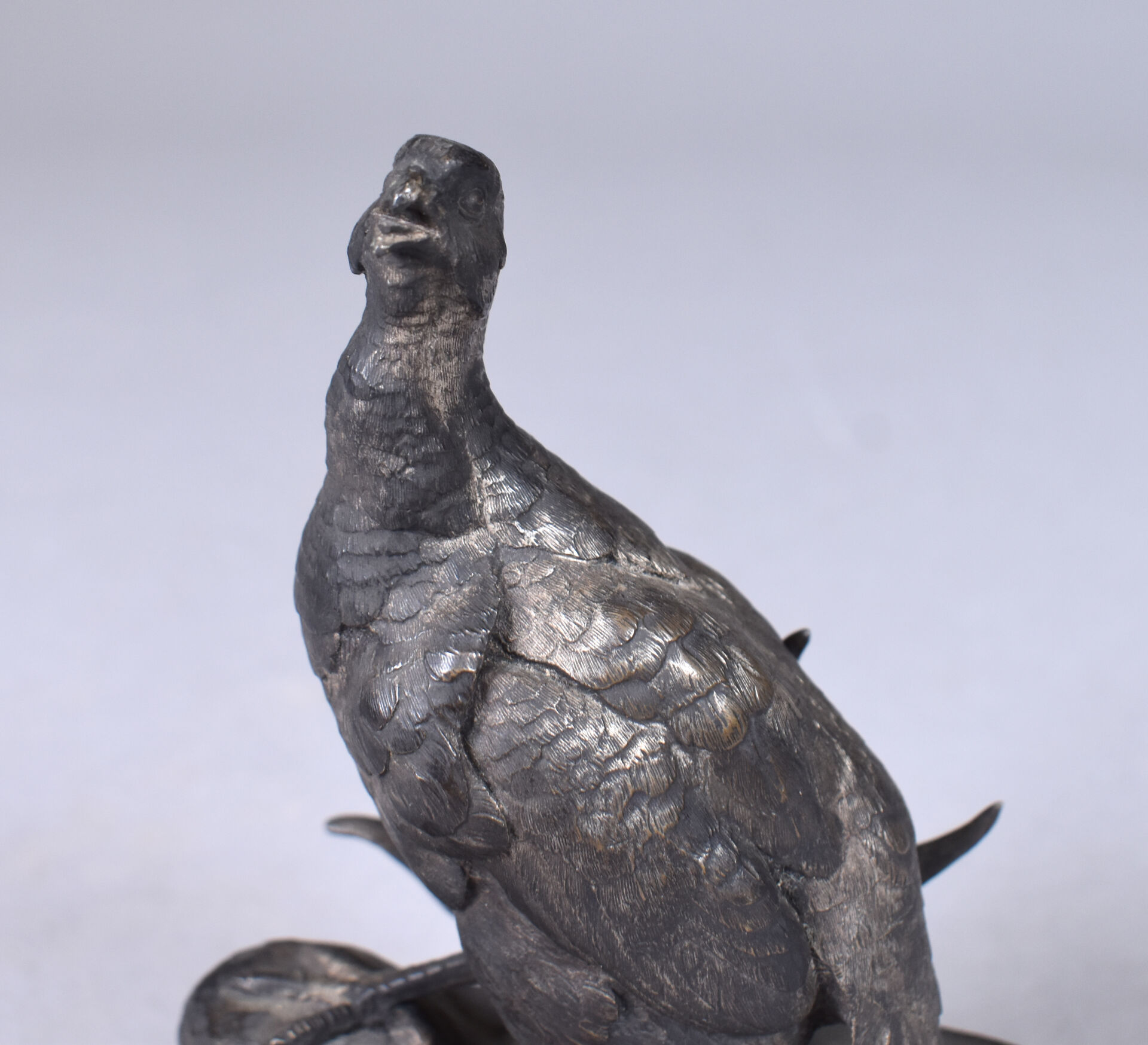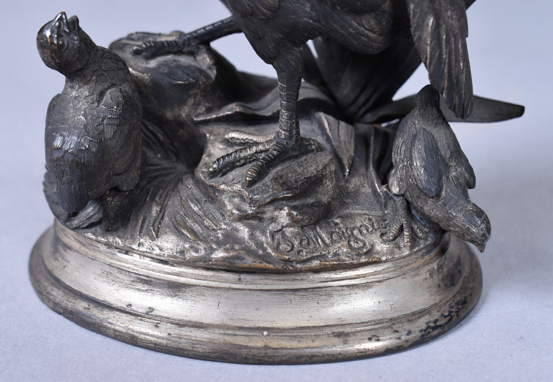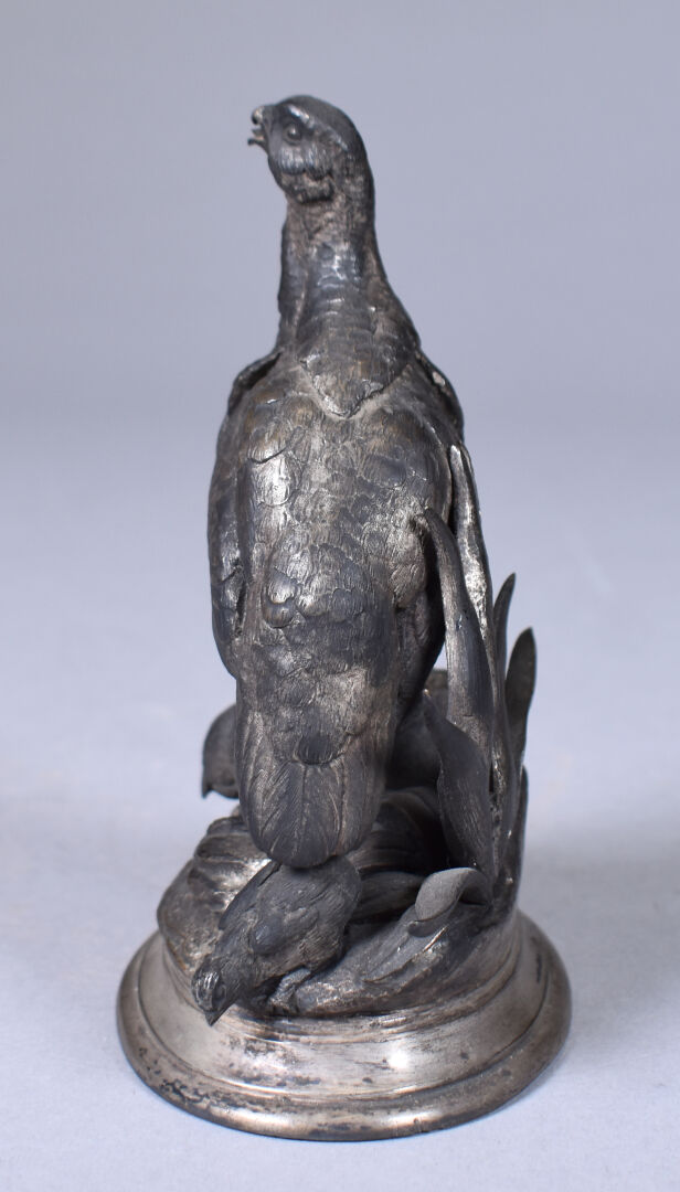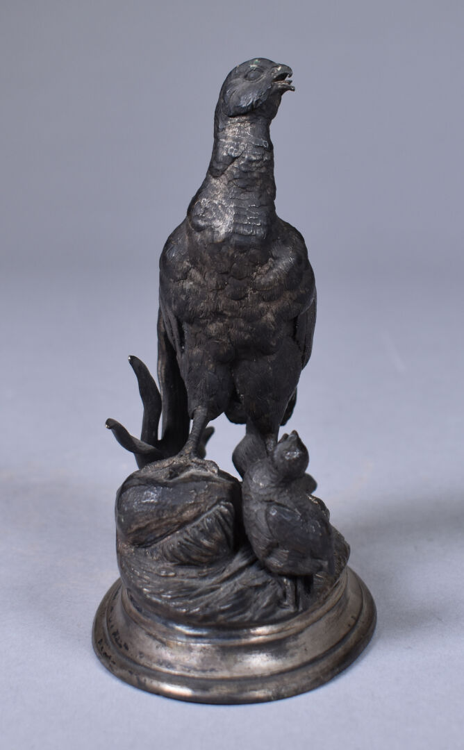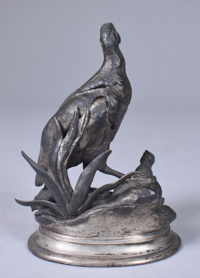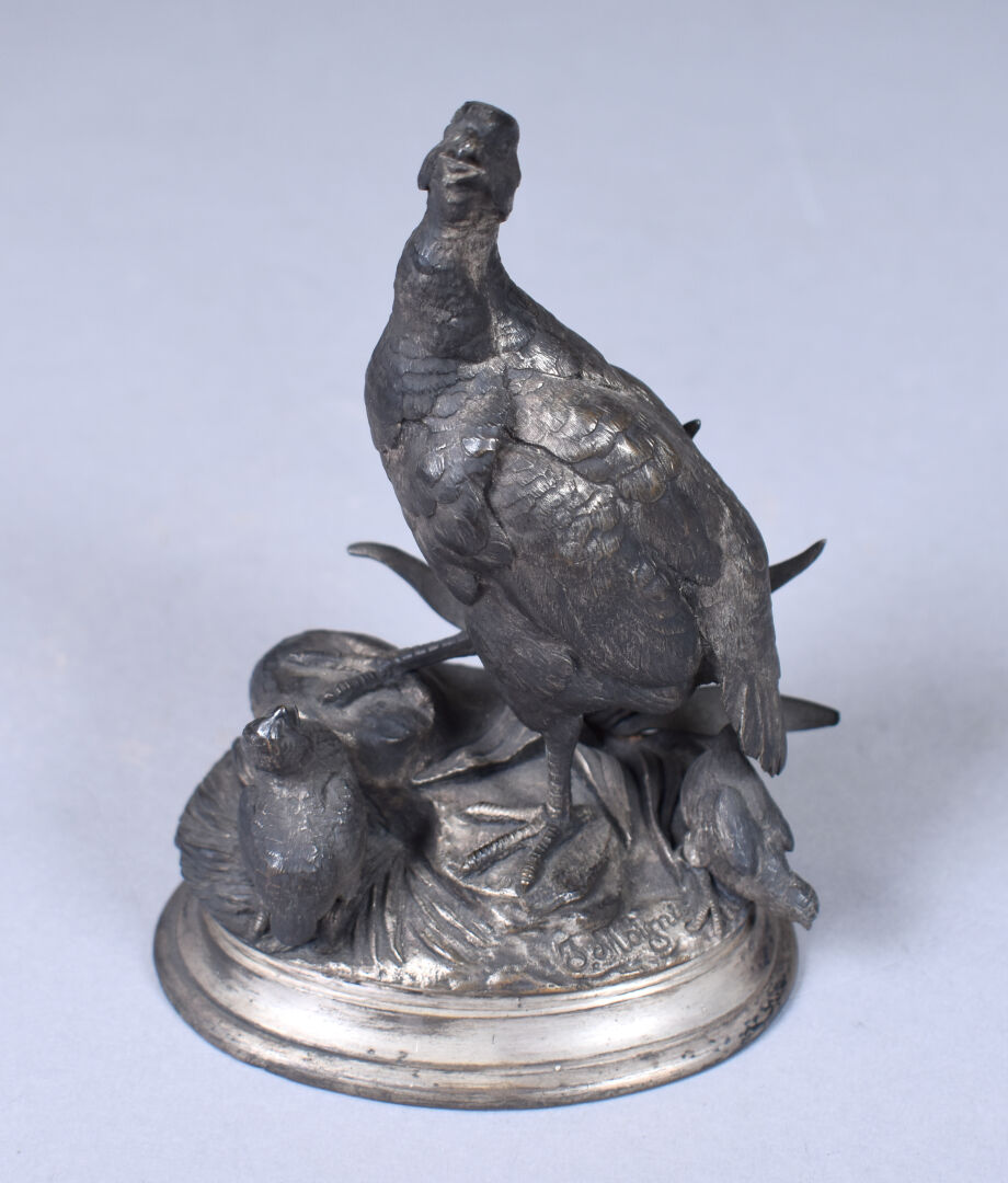 D’après Jules MOIGNIEZ (1835-1894). Perdrix et ses petits en bronze argenté. Signée à la pointe sur la terrasse. Haut. : 15 cm.