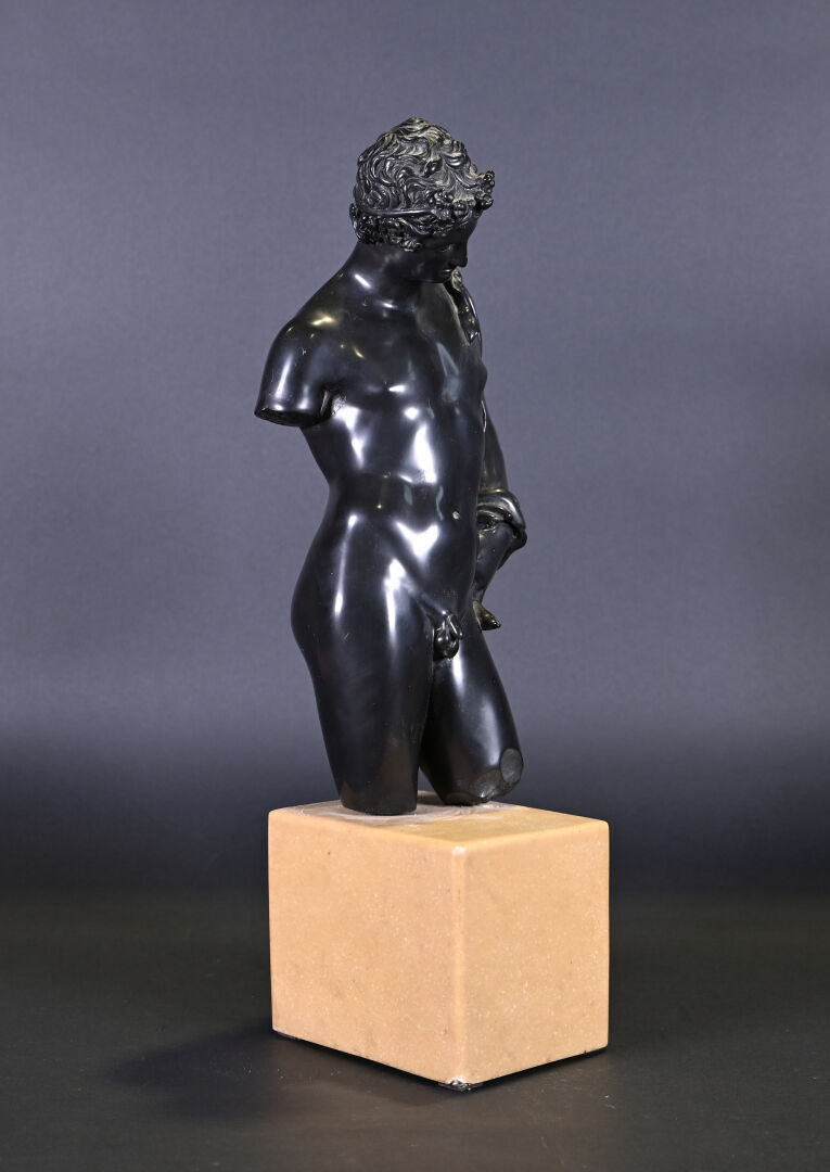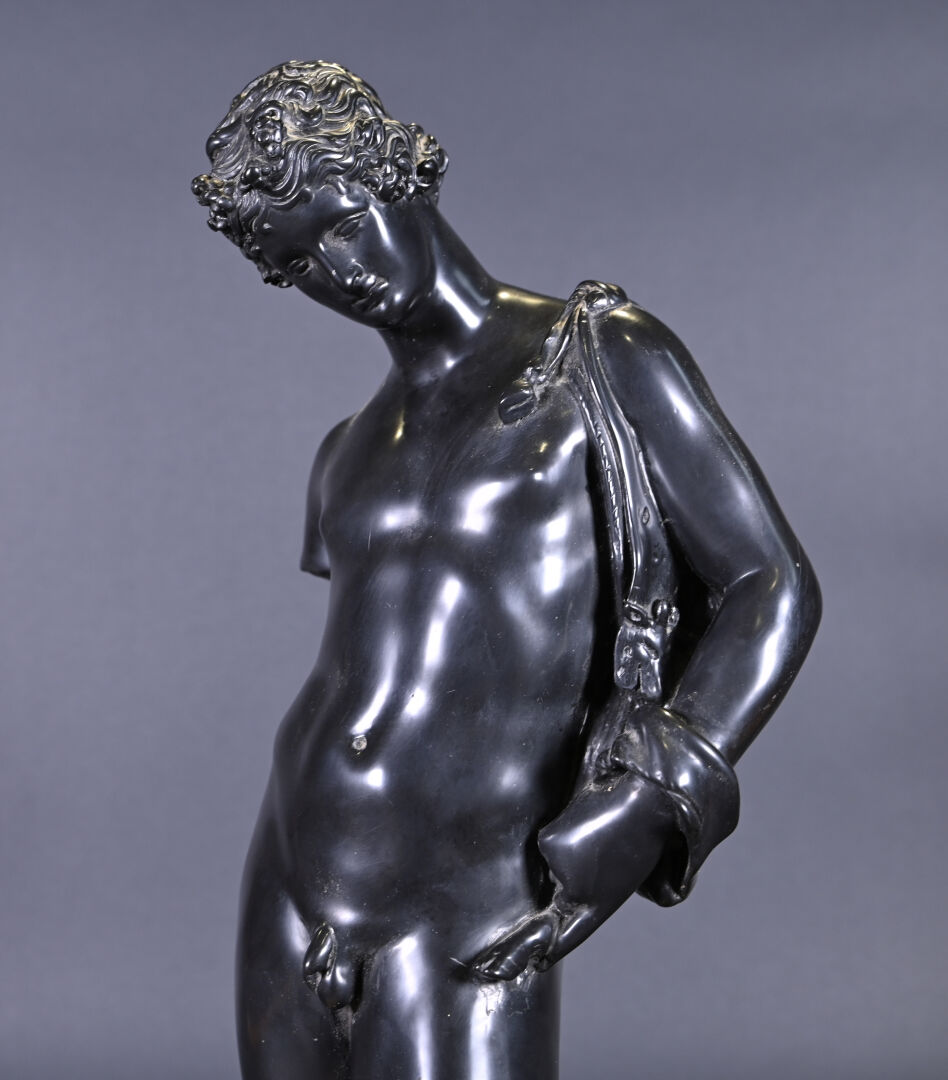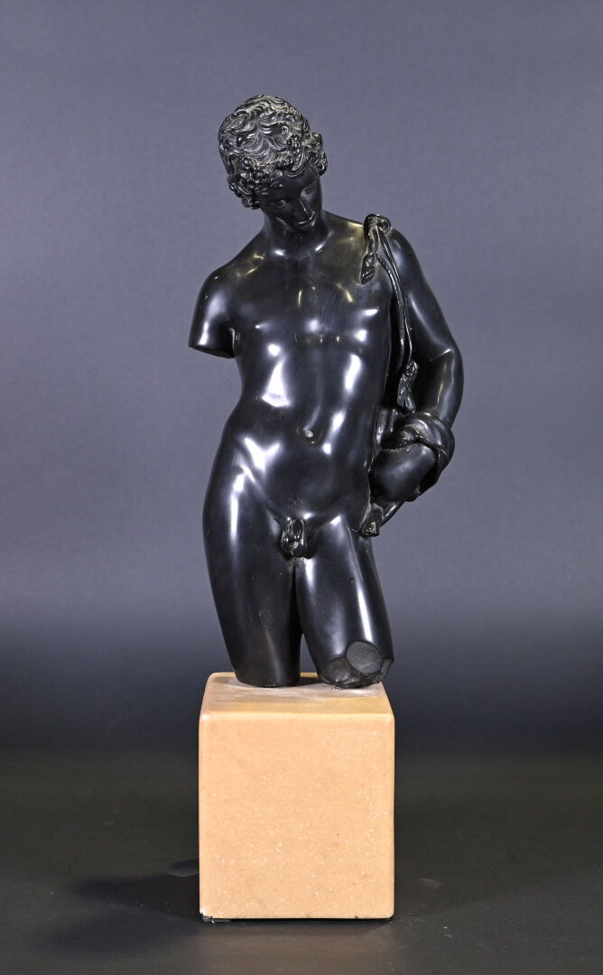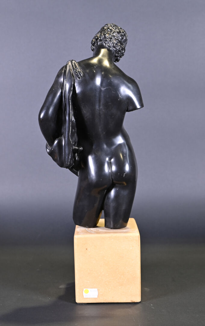 D’après l’Antique. Narcisse. Sujet en composition noire à l’imitation du bronze (petits frottements). Socle en matériau composite. XXe siècle. Haut. : 50 cm.