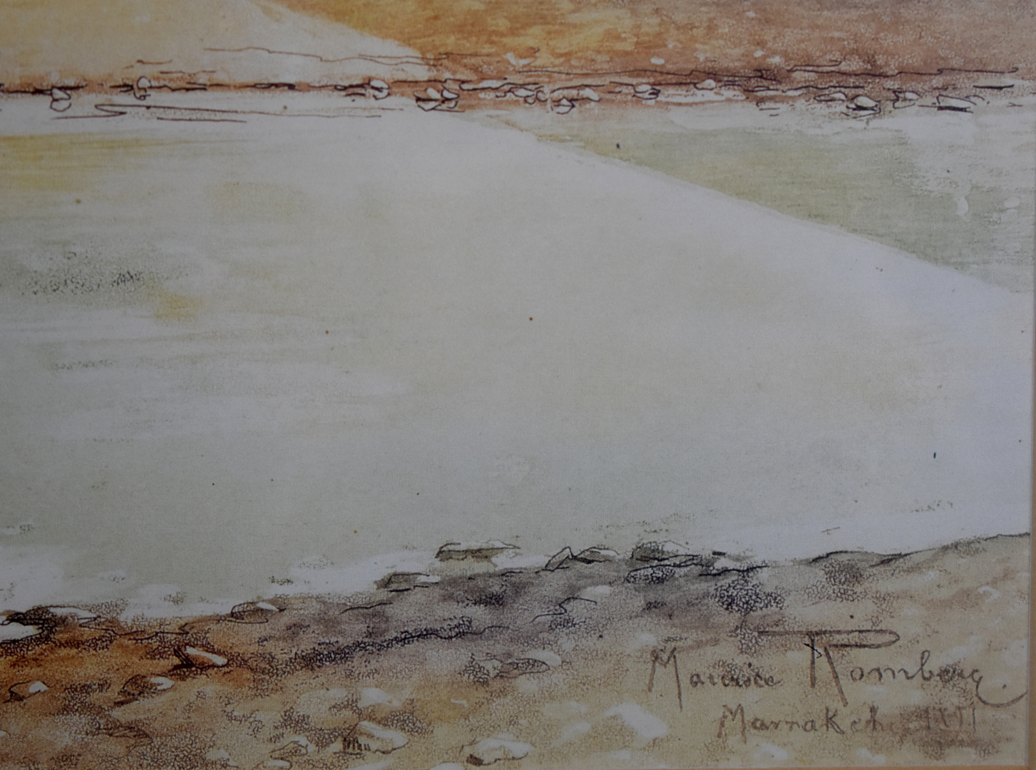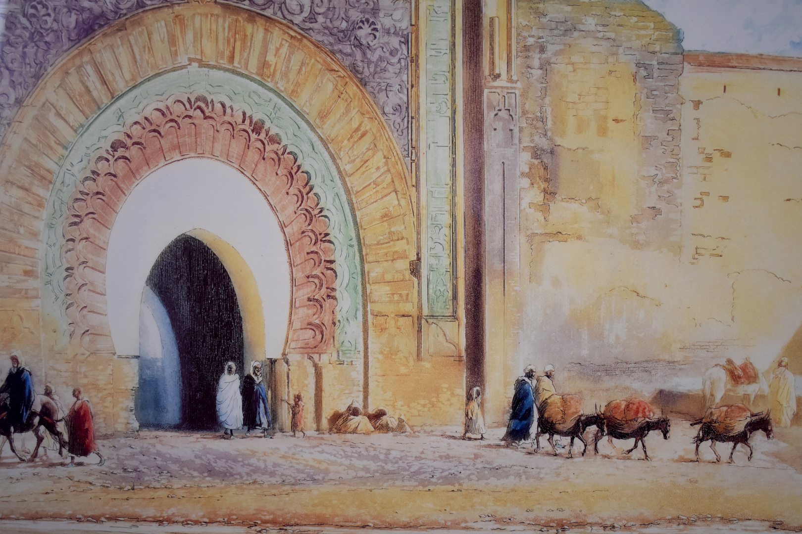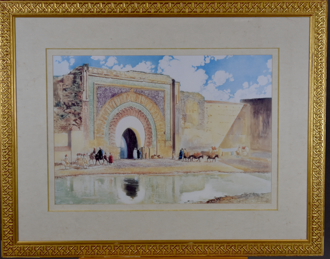 D’après Maurice ROMBERG DE VAUCORBEIL (1861-1943). Porte Bab Agnaou à Marrakech. Reproduction. 66,5 x 45,5 (à vue). Cadre en bois doré sculpté d’une frise géométrique à l’orientale.
