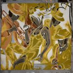 D’après Pierre FAREL (Né en 1957). Danseuse et musiciens de Jazz. Tenture signée en bas à gauche. 147 x 143 cm.