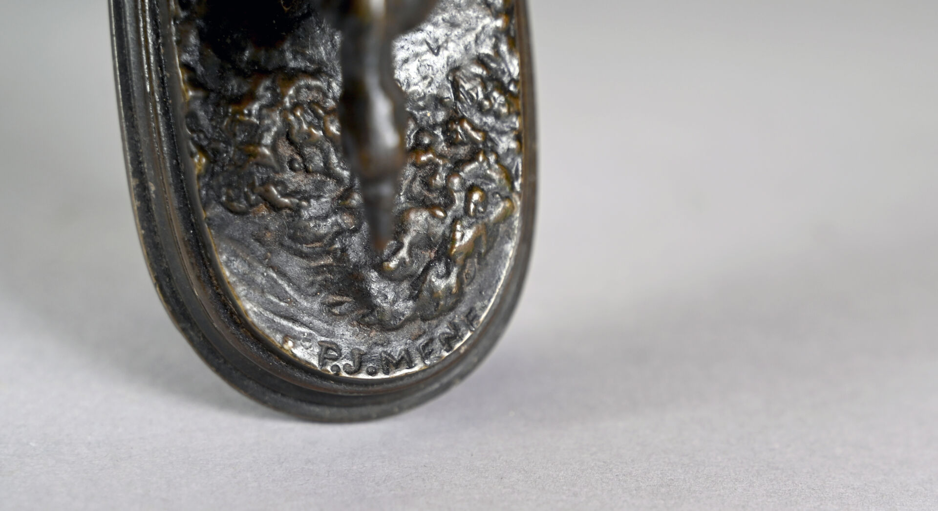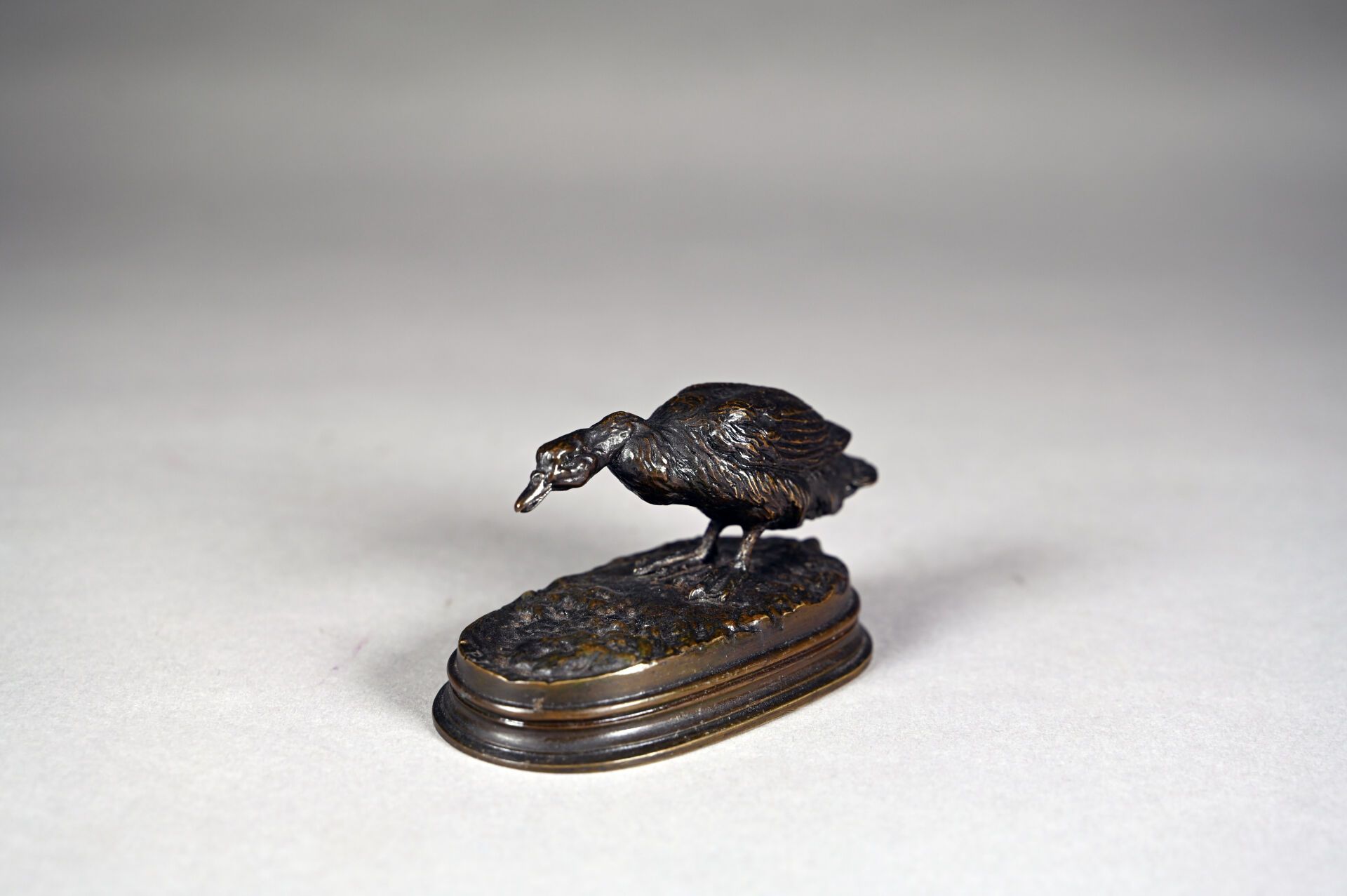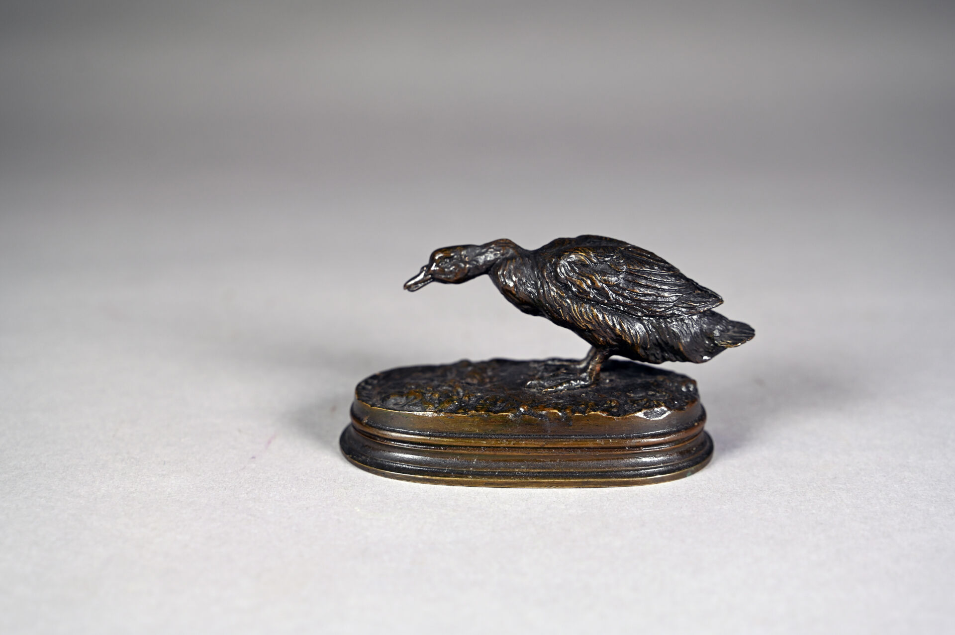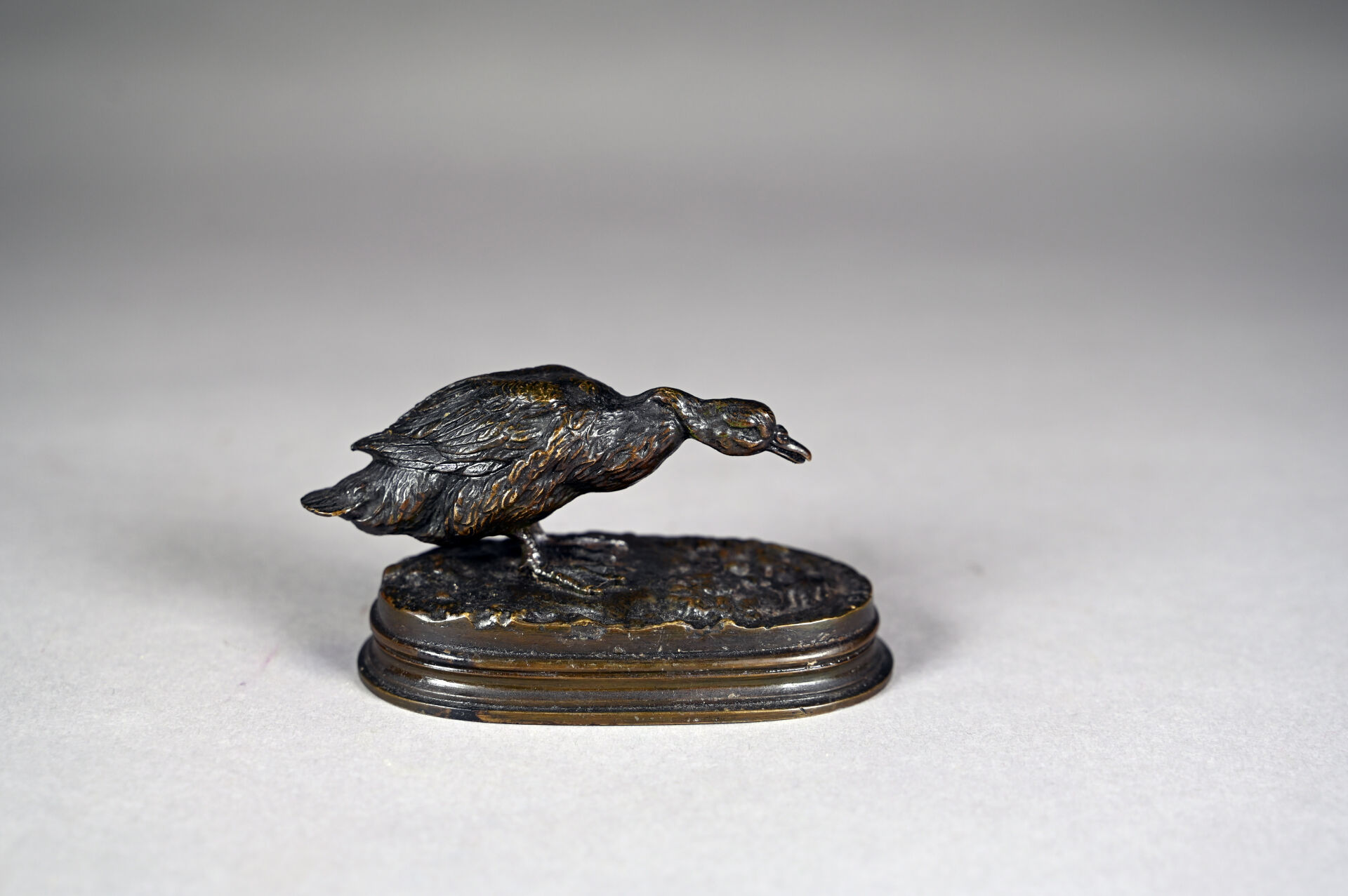 D’après Pierre Jules MENE (1810-1879). Canard en bronze patiné brun, signé sur la terrasse. Haut. : 7 cm.