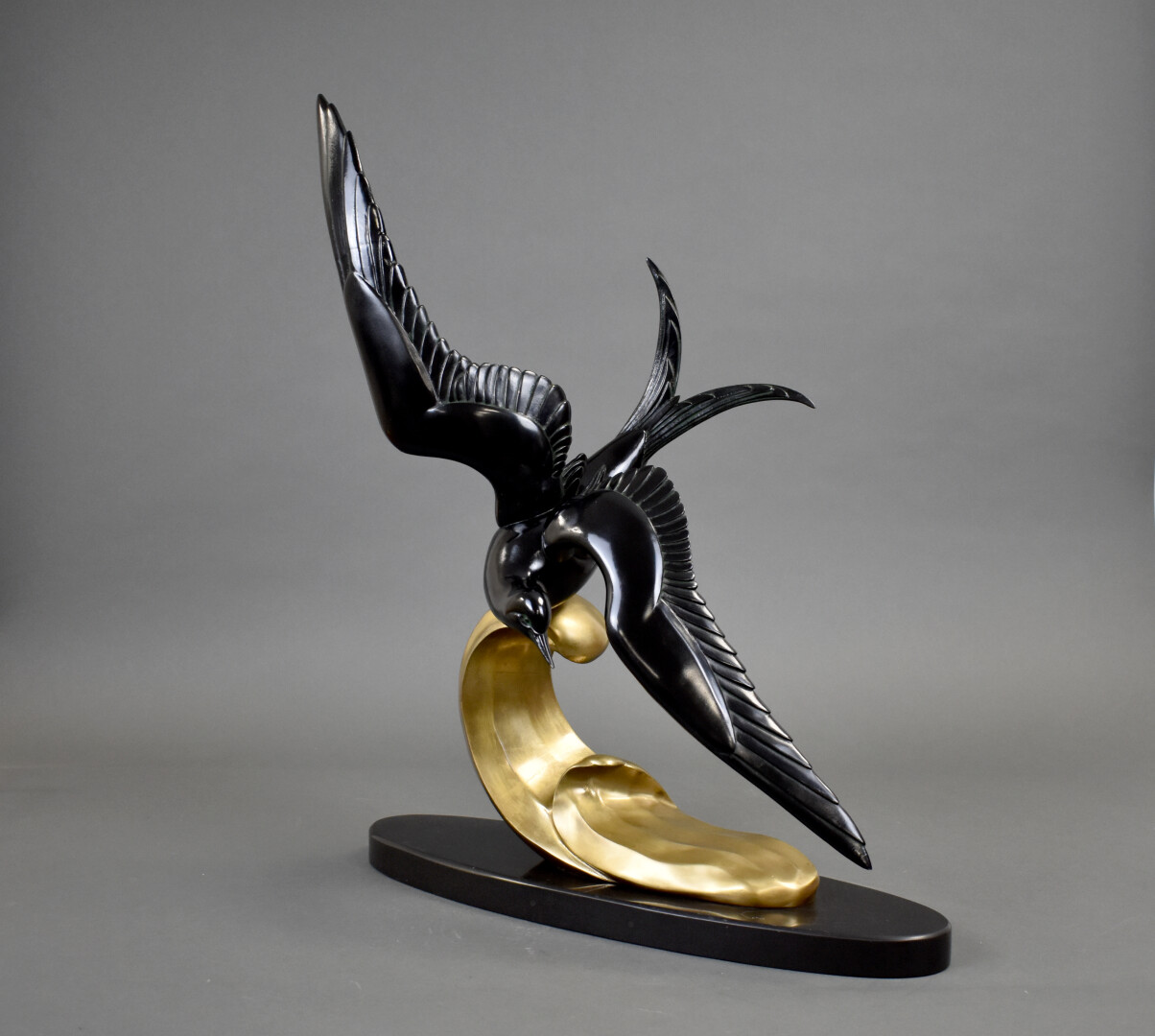D’après ROCHARD. Régule repatiné et relaqué noir et or représentant un oiseau survolant les flots. Haut. : 60,5 cm.