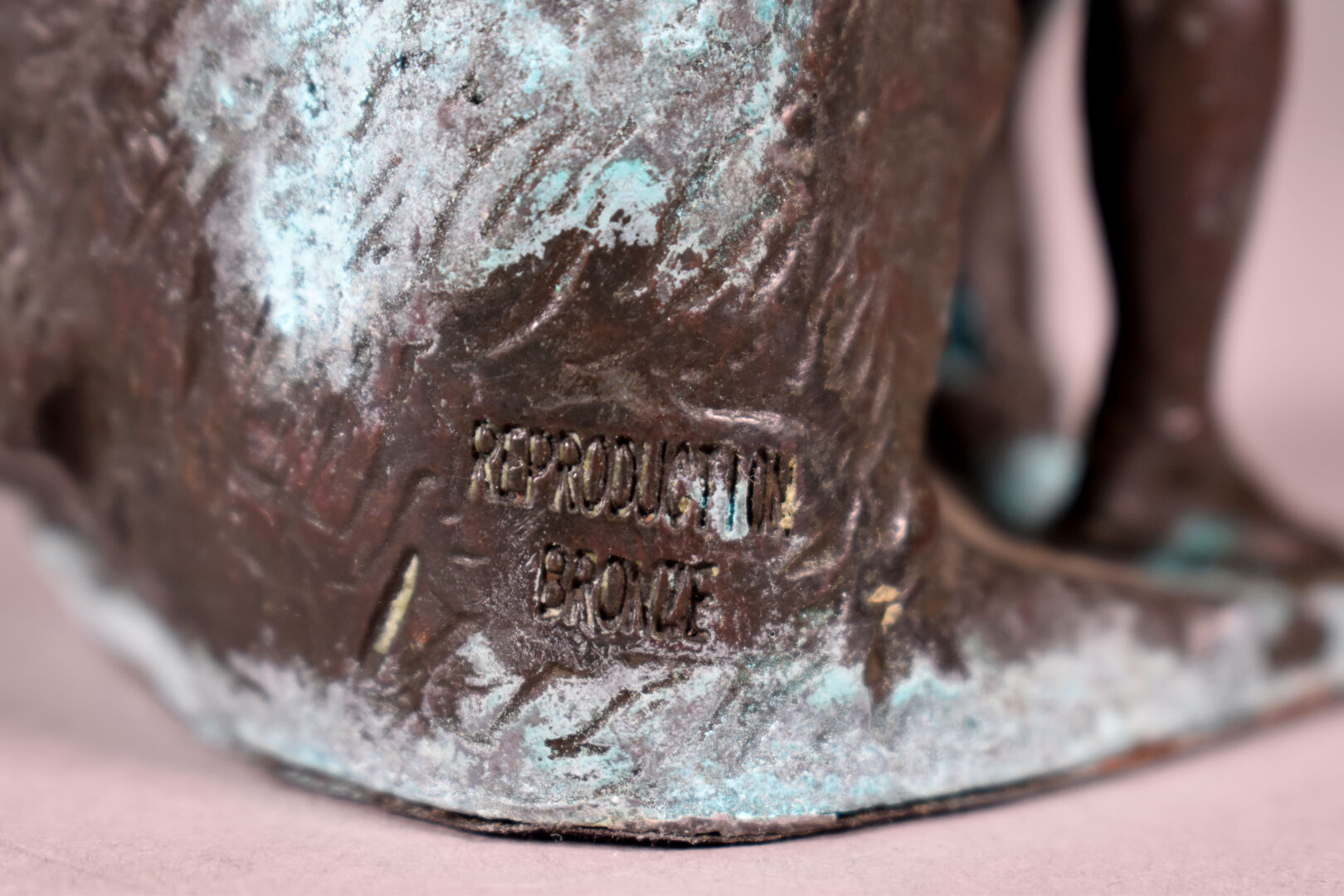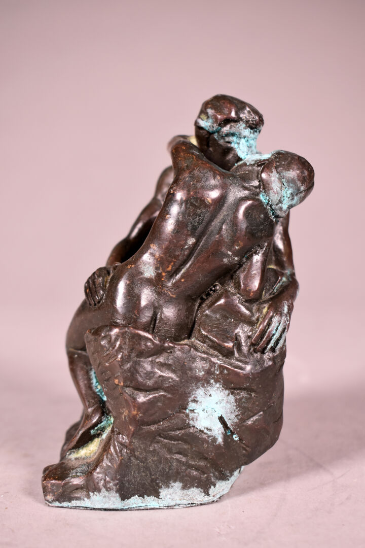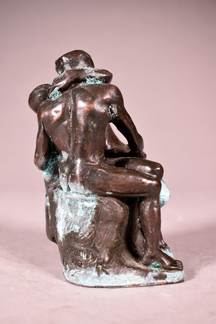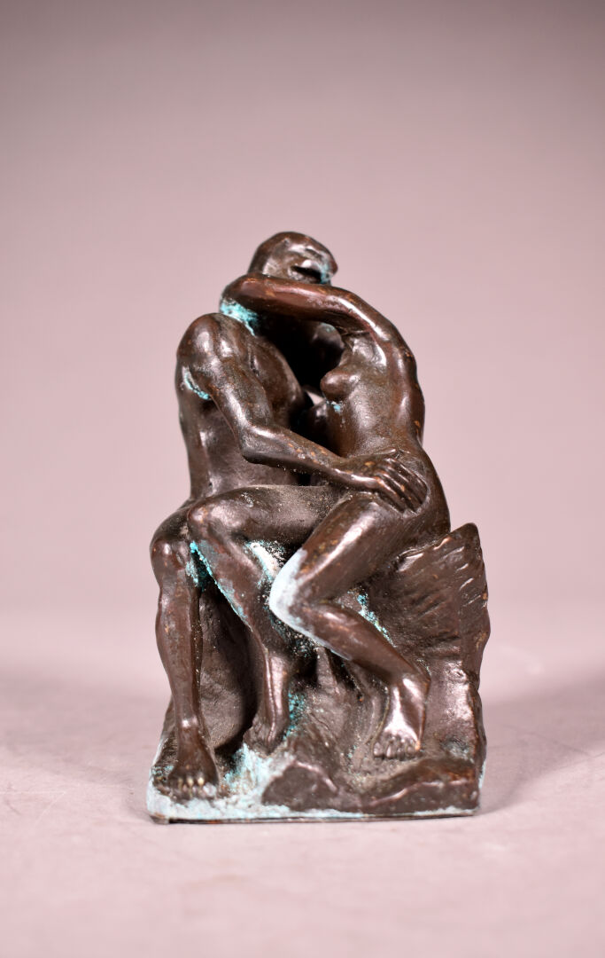 D’après RODIN. Le baiser. Reproduction mécanique en bronze (piqures au métal). Haut. : 13 cm.