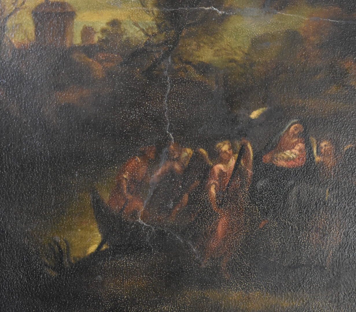D’après une école du XVIIe siècle. Nativité. Impression sur papier marouflée sur toile (craquelures). 34 x 31 cm.