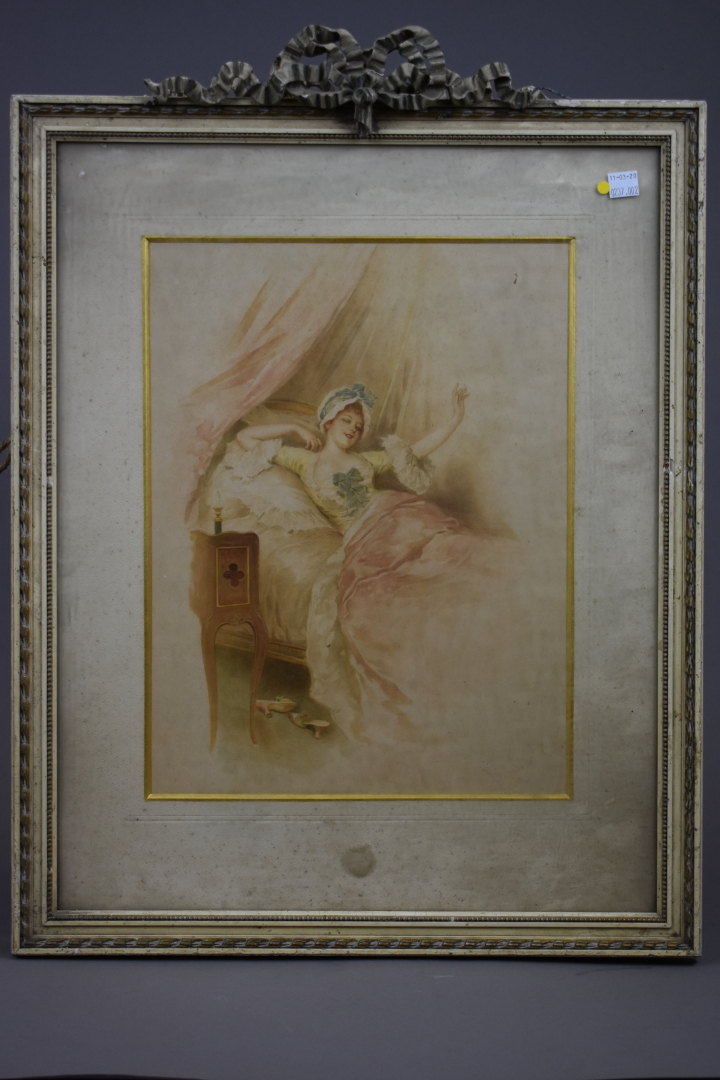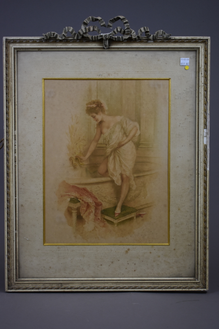 D’après une école vers 1900. Elegantes à la toilette. deux lithographies en couleurs. Cadre de bois laqué crème, le fronton à ruban.