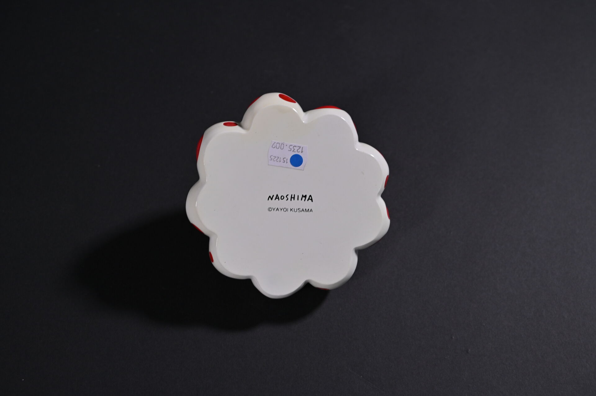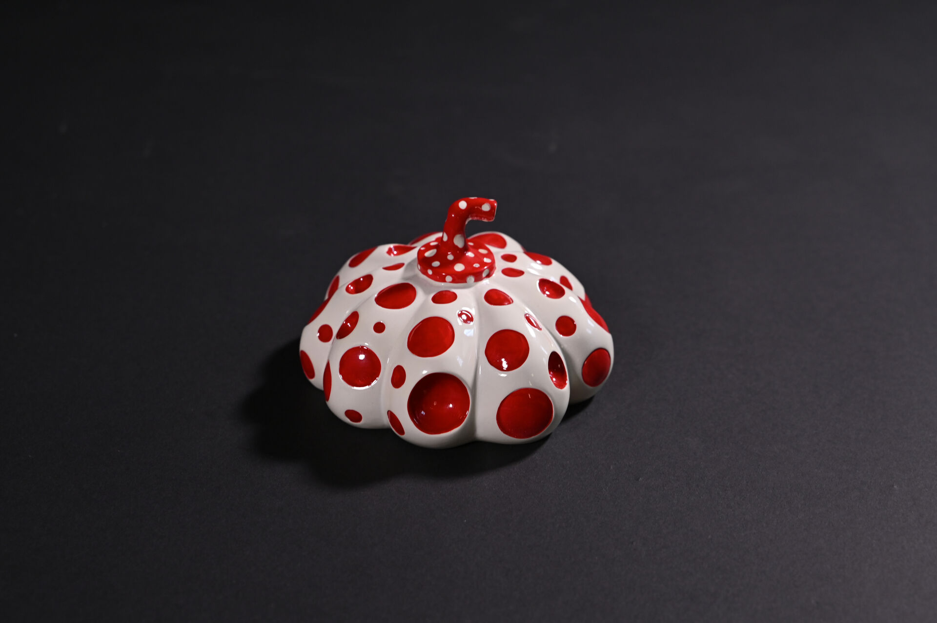 D’après Yayoi KUSAMA ( Née en 1929-). Naoshima Red Pumpkin. Sculpture en résine peinte blanc et rouge. Signée au dessous. Boite. Haut. :.8,5 cm. Diam. : 14 cm.