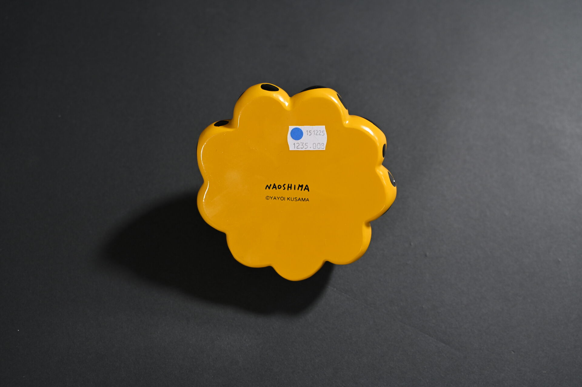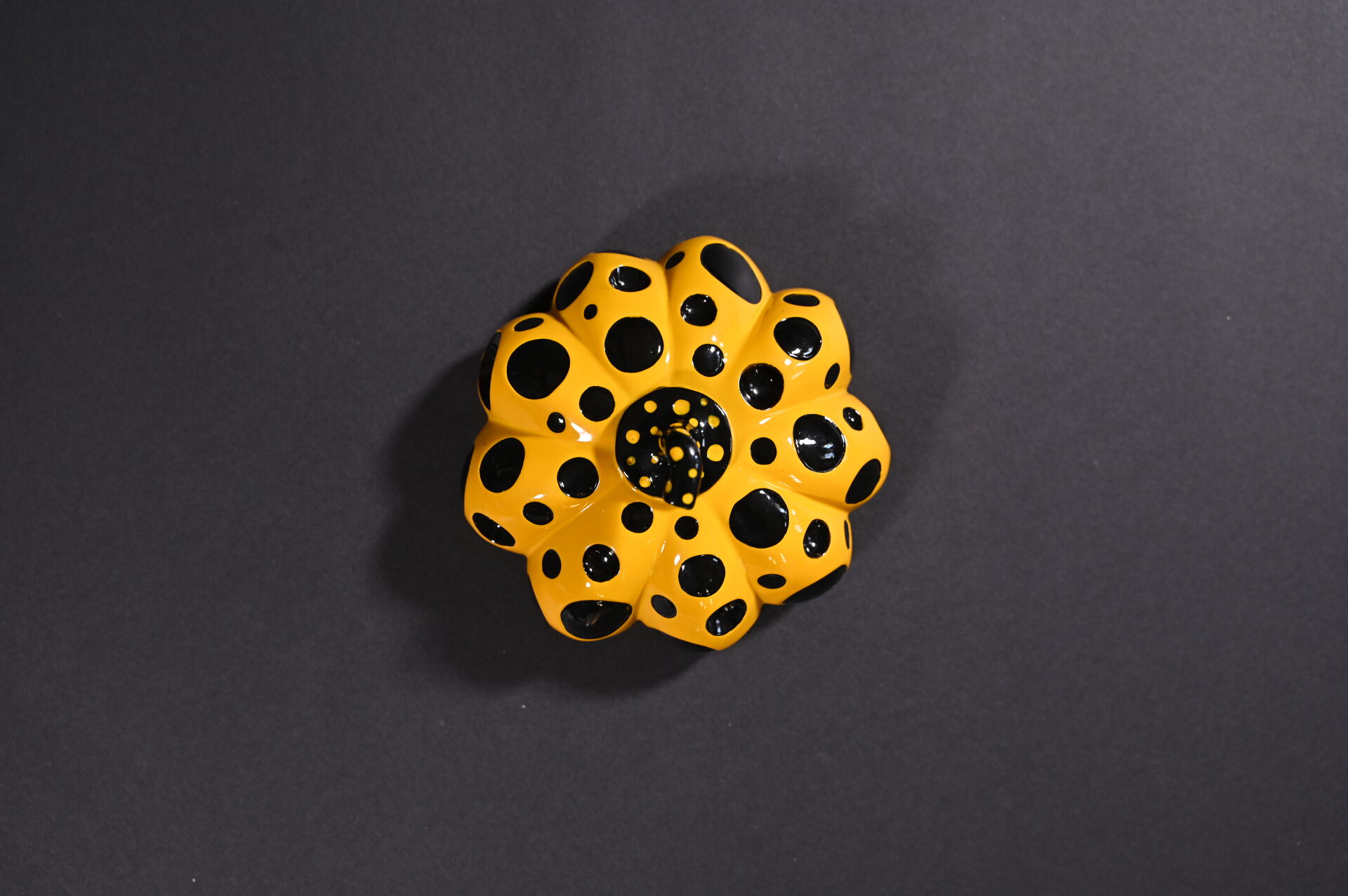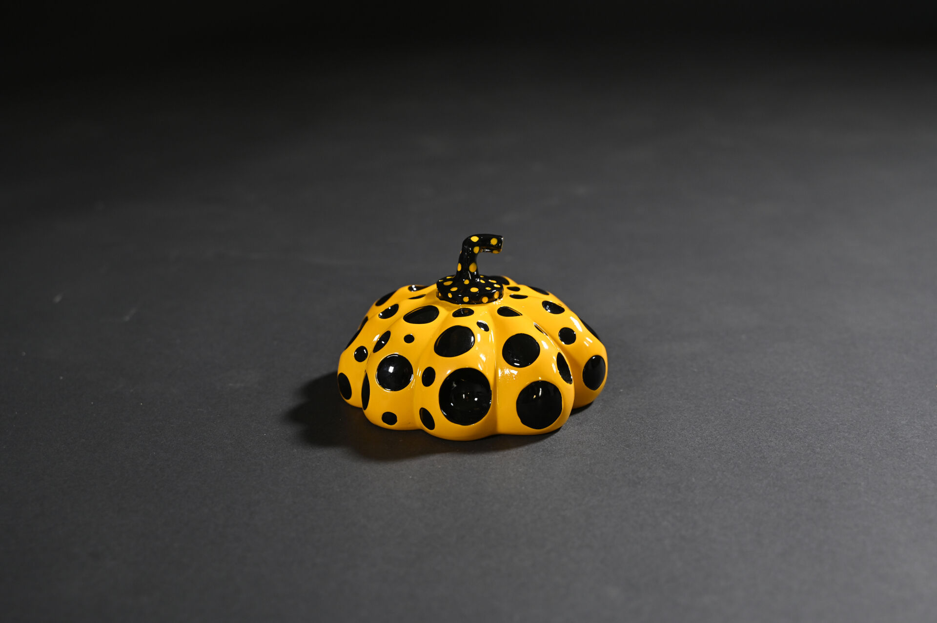 D’après Yayoi KUSAMA ( Née en 1929-). Naoshima Red Pumpkin. Sculpture en résine peinte jaune et noire. Signée au dessous. Boite. Haut. :.8,5 cm. Diam. : 14 cm.