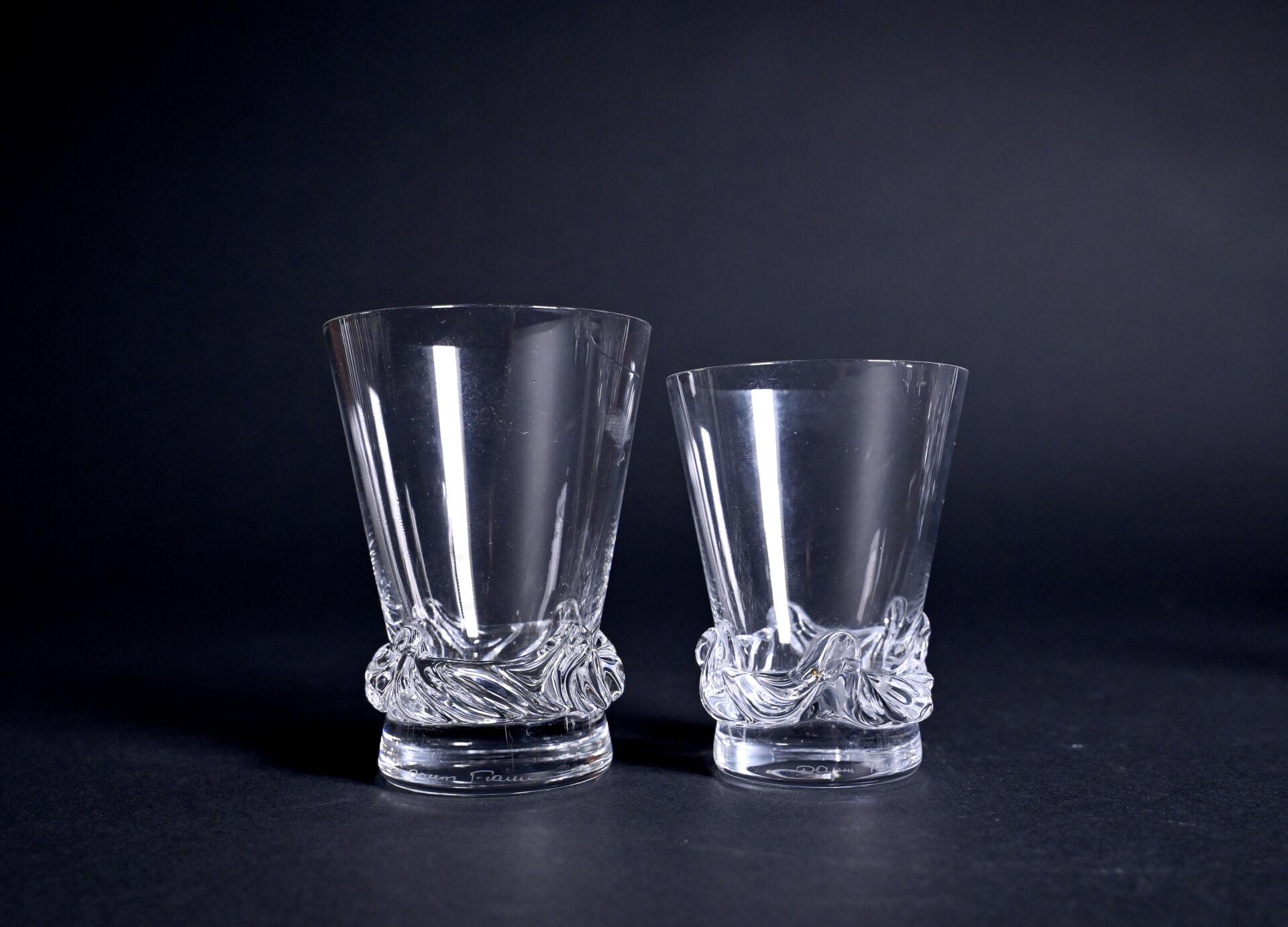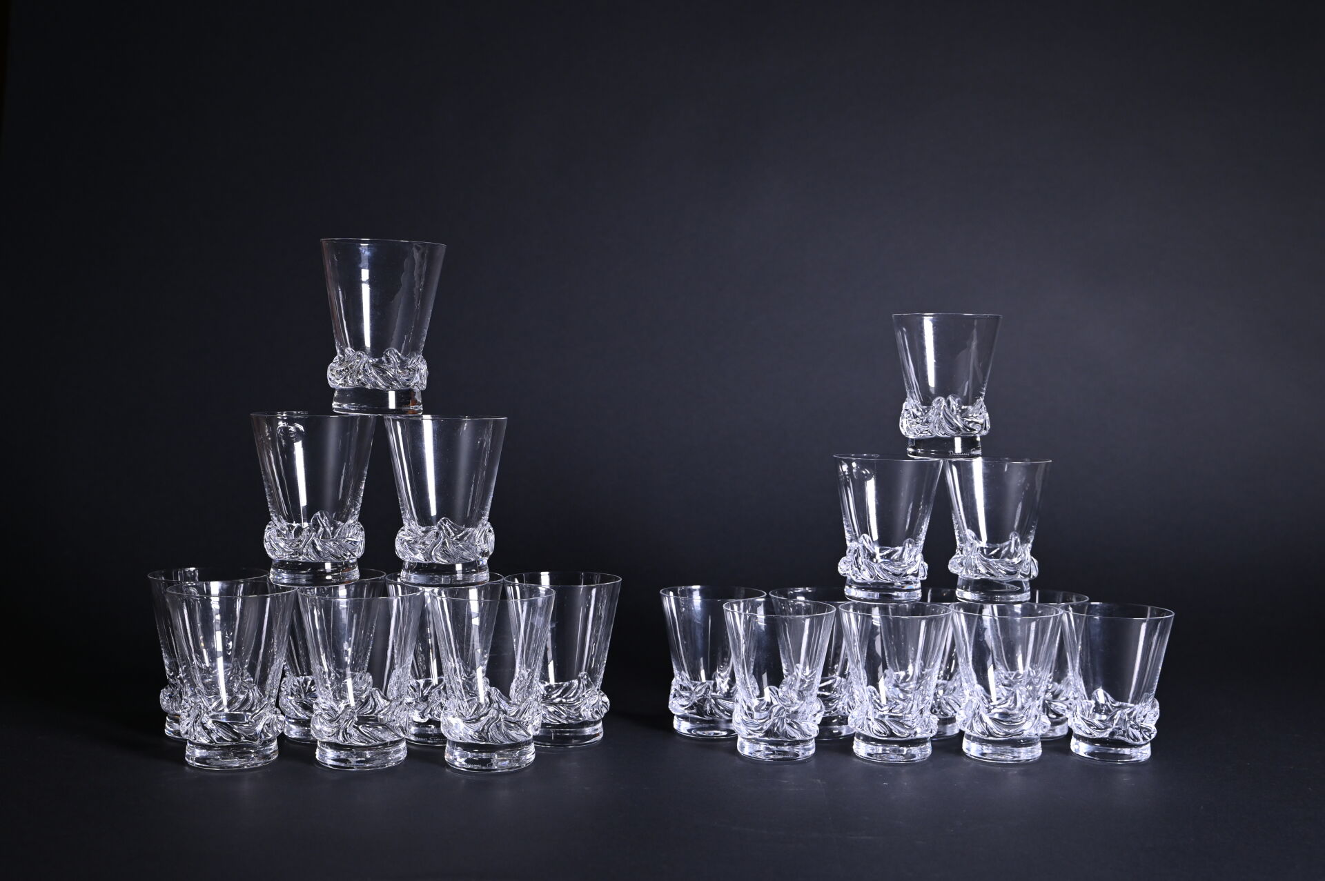 DAUM FRANCE. Partie de service de verres à pied en cristal modèle Sorcy comprenant 11 à verres à vin ? et 11 verres à liqueur. Haut. : 10 cm et Haut. : 9 cm. Marqués.