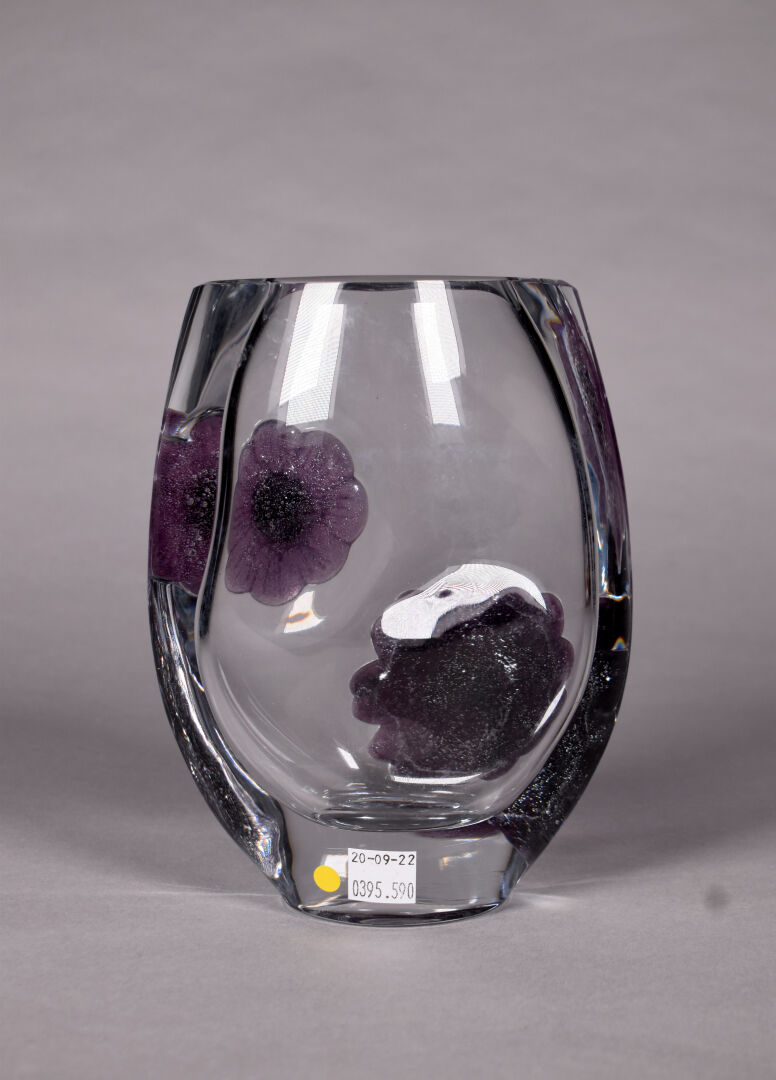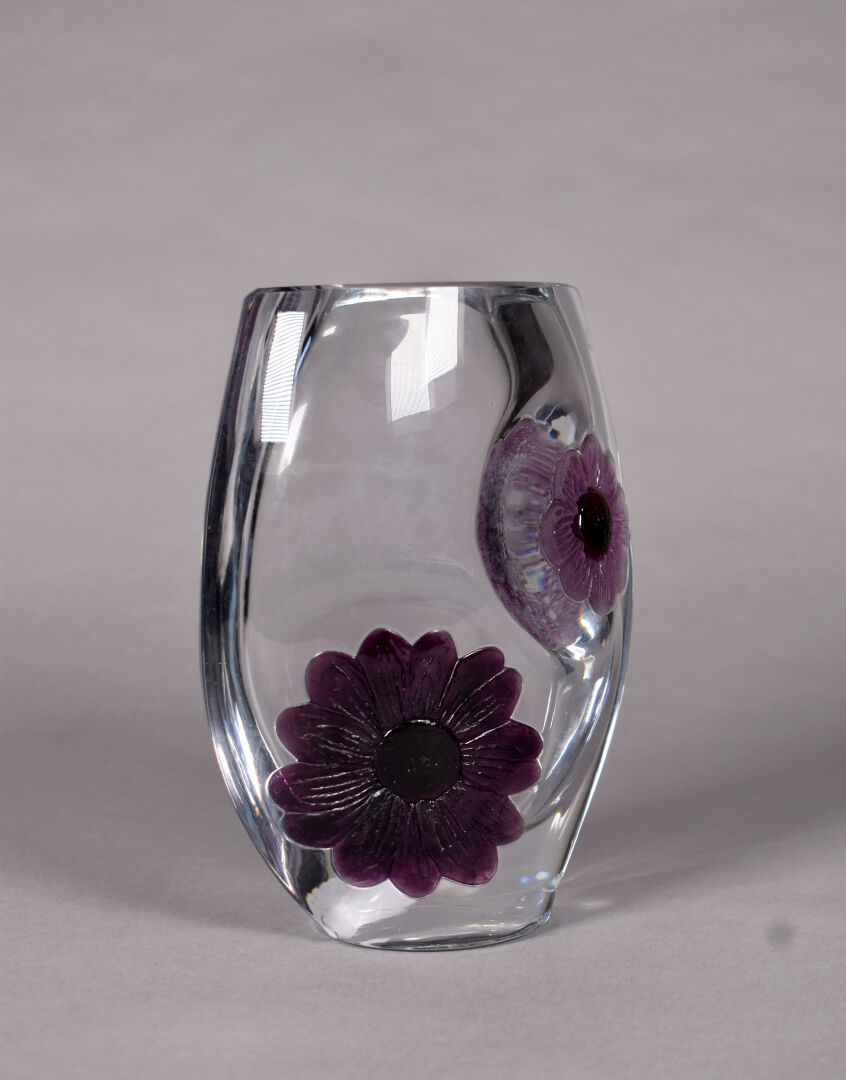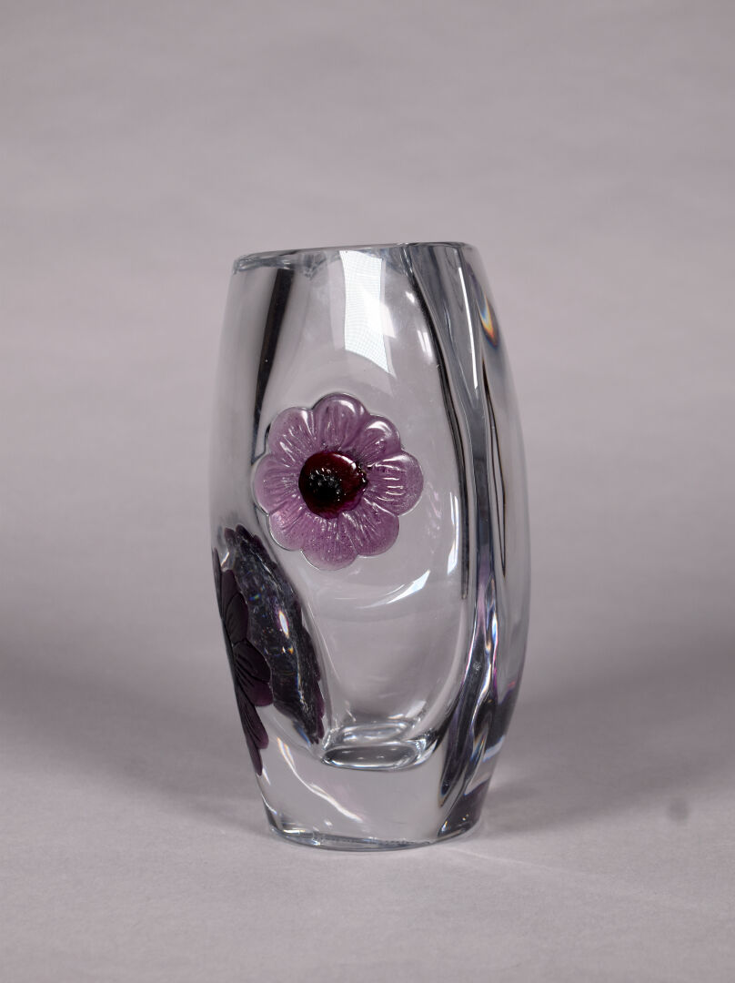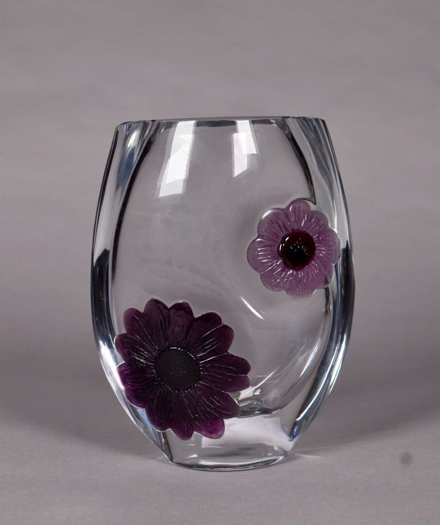 DAUM FRANCE. Vase oblong en cristal moulé à décor de fleurs en pâte de verre mauve. Signé. Haut. : 19 cm.