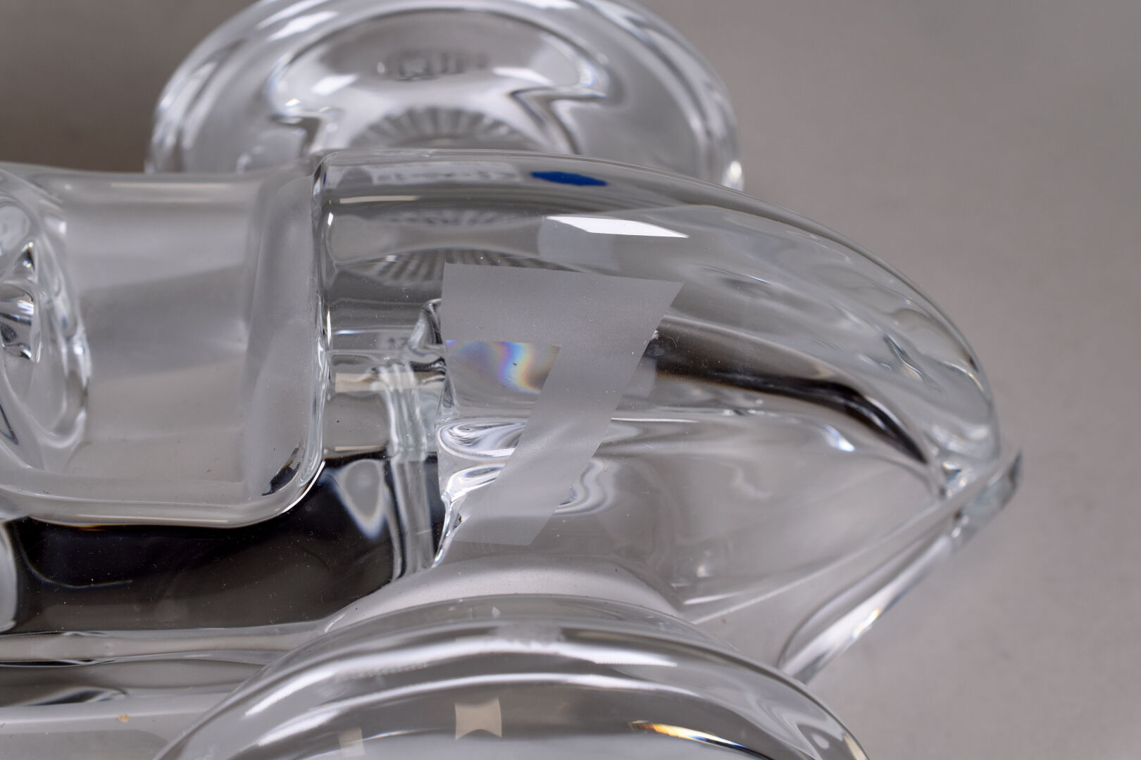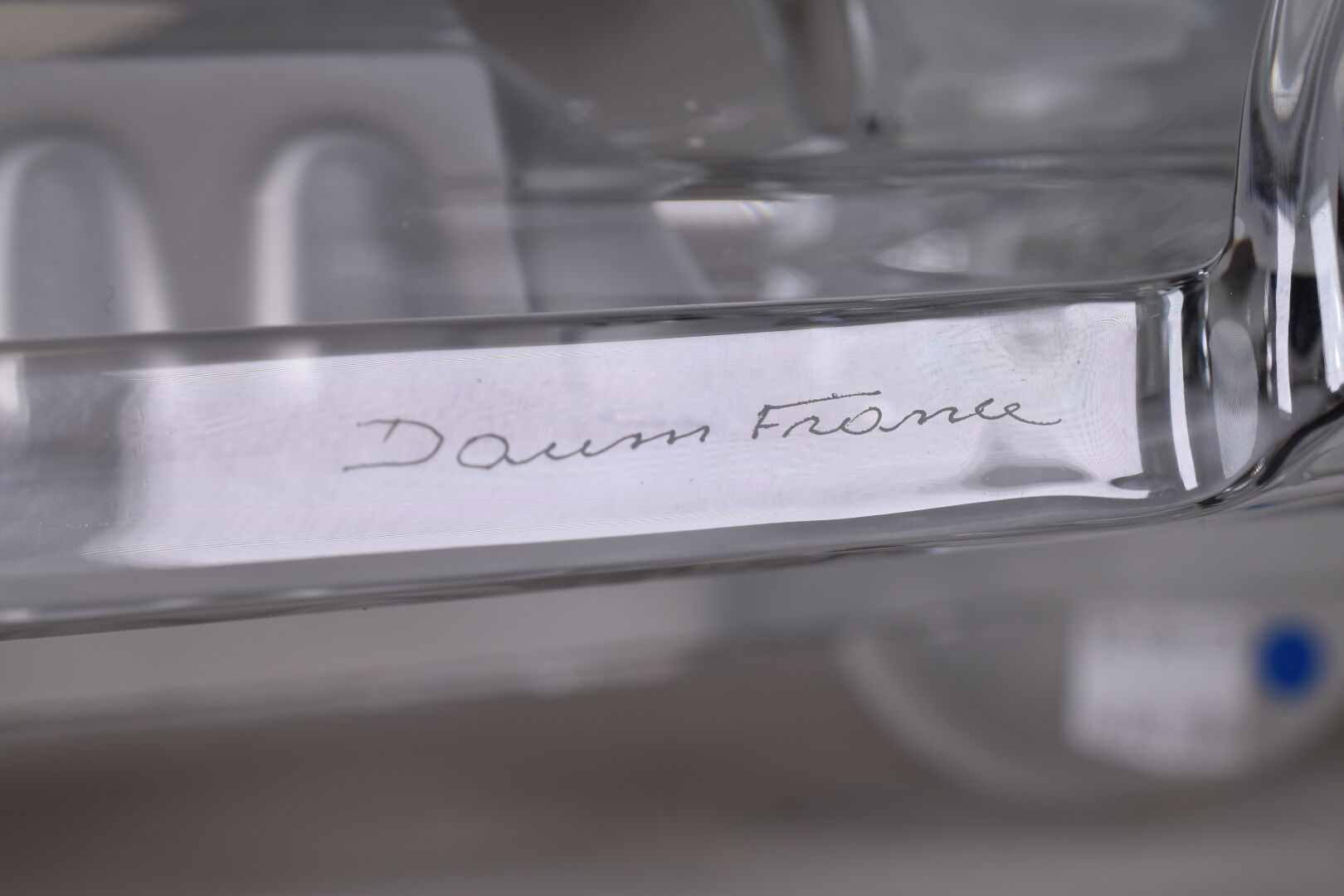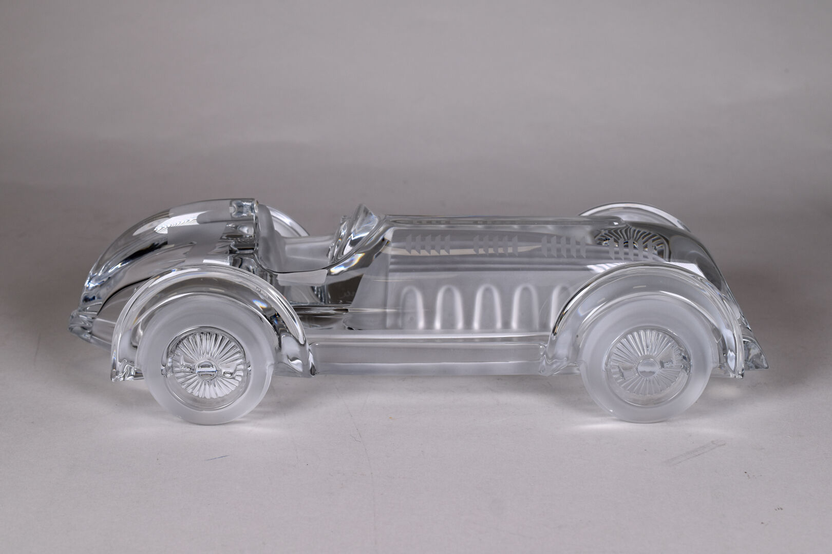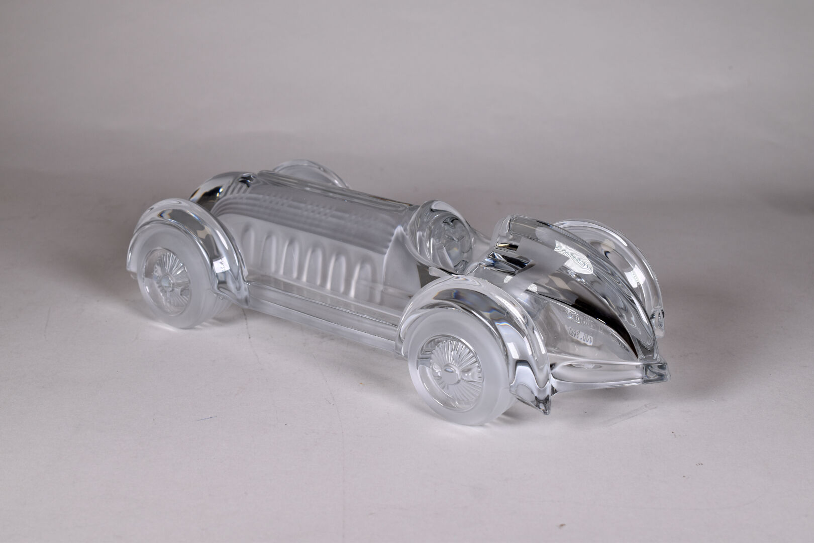 DAUM FRANCE. Voiture de course type monoplace course du Mans en cristal moulé. Signée. Quelques égrenures au niveau des roues. Haut. : 10,5 cm – Larg. : 37 cm.