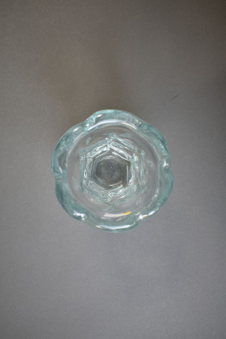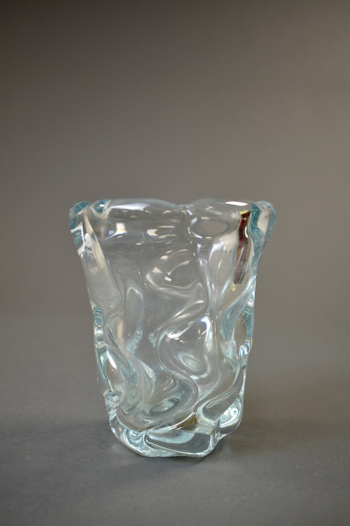 DAUM NANCY FRANCE. Vase en cristal moulé légèrement bleuté. Marqué à la base à la croix de Lorraine. Haut. : 15 cm – Diam. : 12,5 cm.