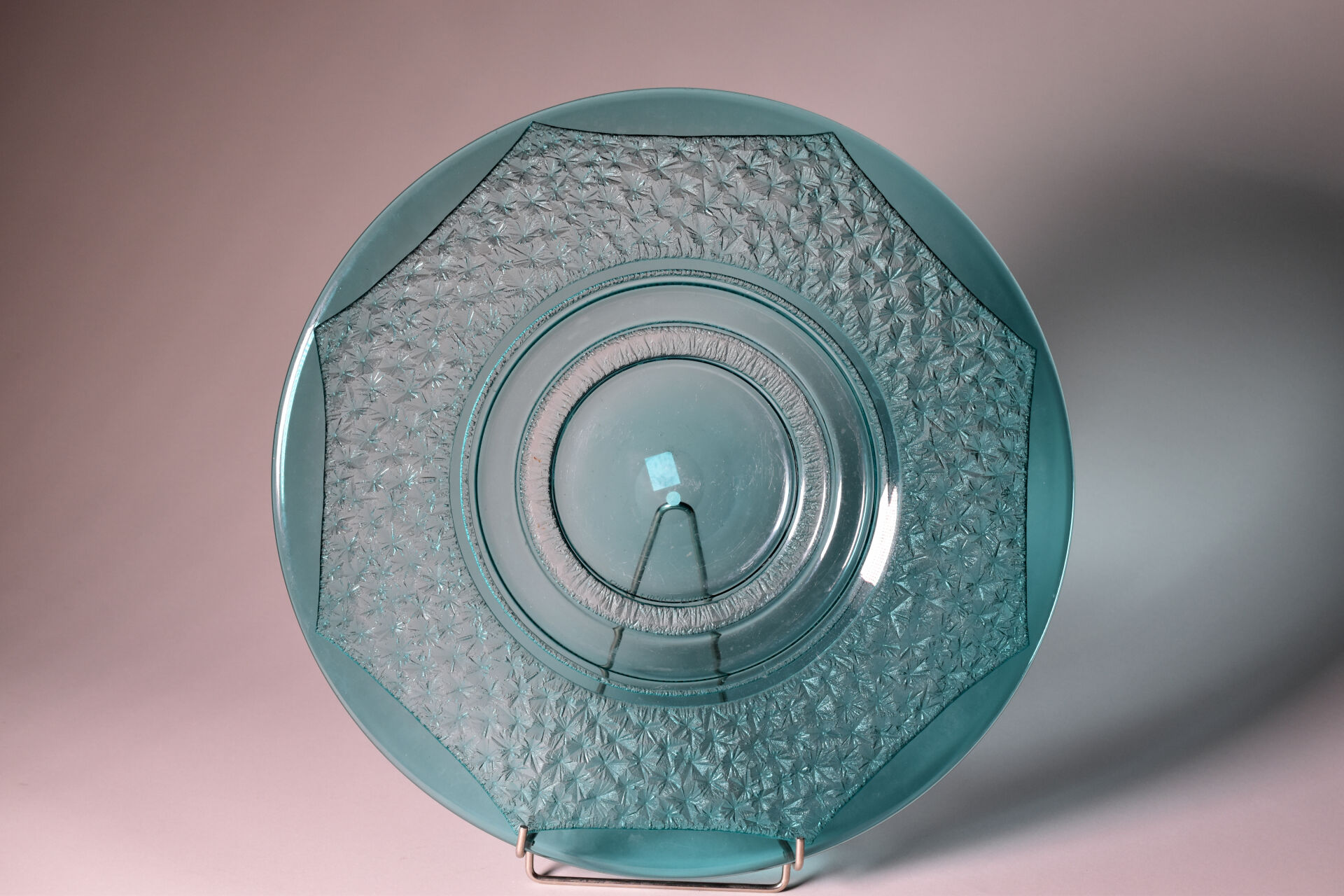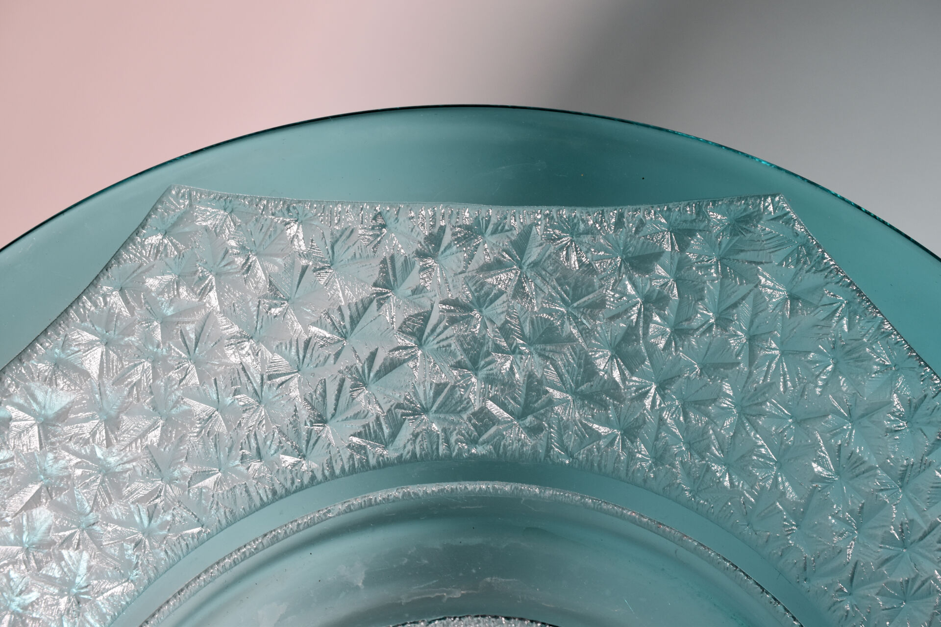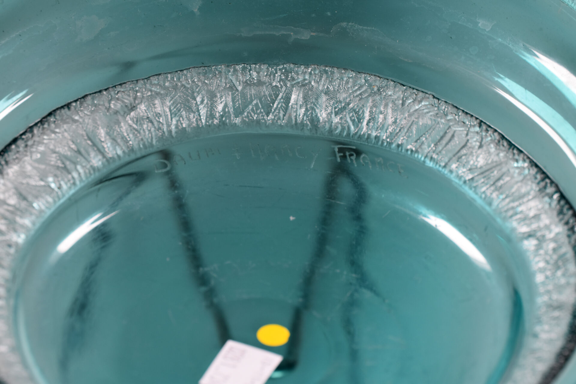 DAUM NANCY. Grande coupe en verre moulé bleuté à décor de fleurs dépolies (rayures d’usage). Signée. Diam. : 45 cm.