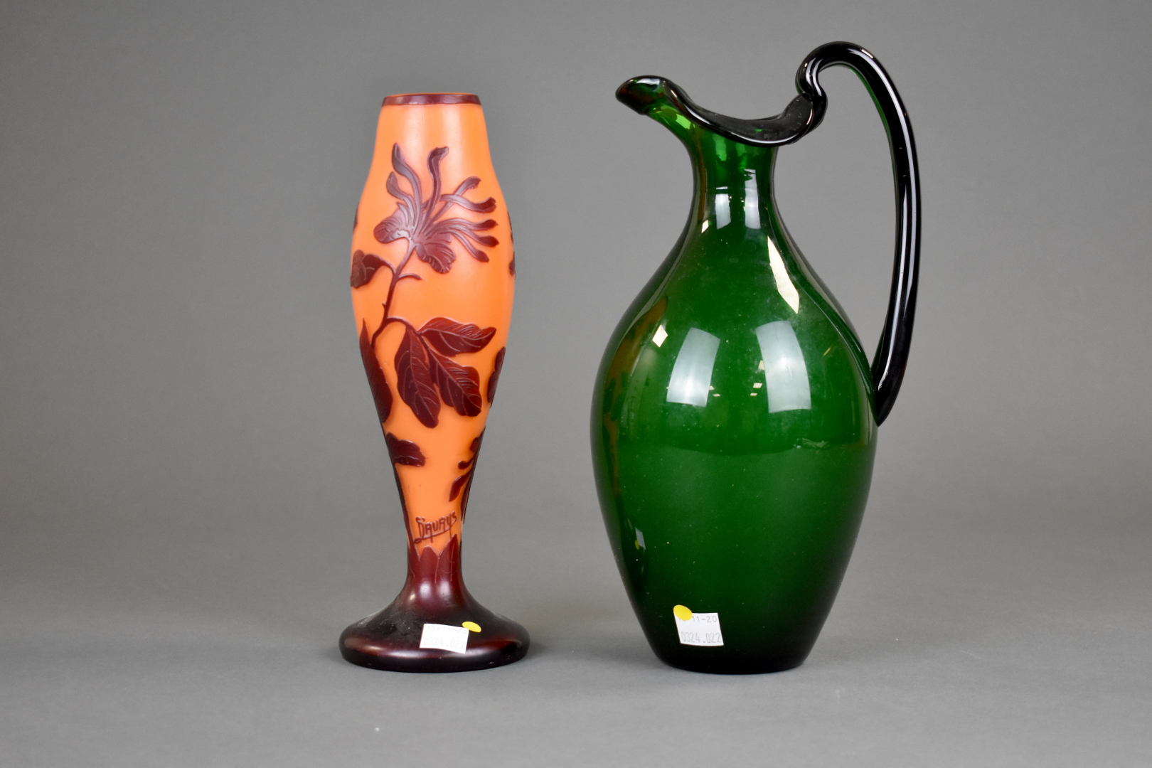 DAURYS. Vase balustre en verre multicouche à décor dégagé à l’acide de fleurs en rouge sur fond orangé. Signé. Haut. : 25,5 cm.On joint une verseuse en verre vert.