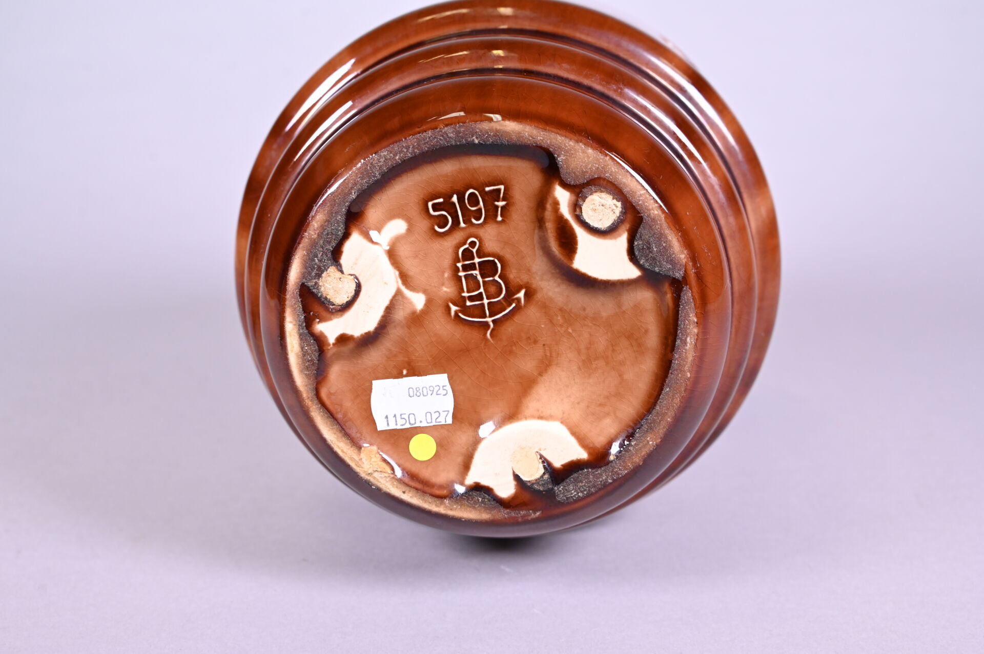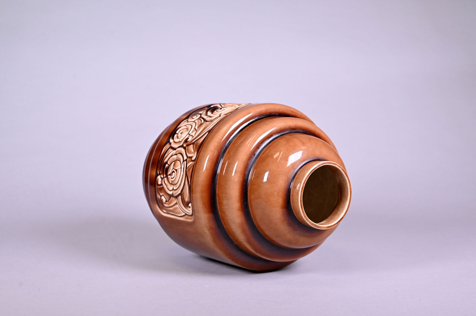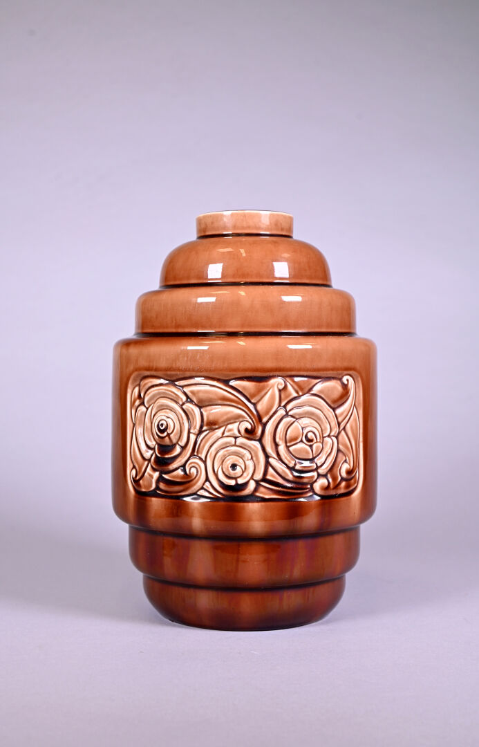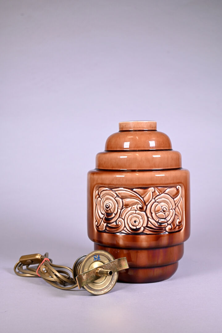 DEBRUYNE – FIVE LILLE. Vase à gradins en céramique émaillée chocolat à décor en relief d’une frise de roses. Marqué au dessous. Haut. : 29,5 cm. Monté en lampe (amovible).