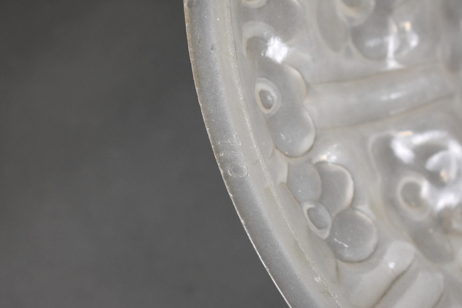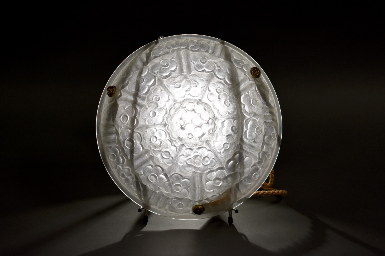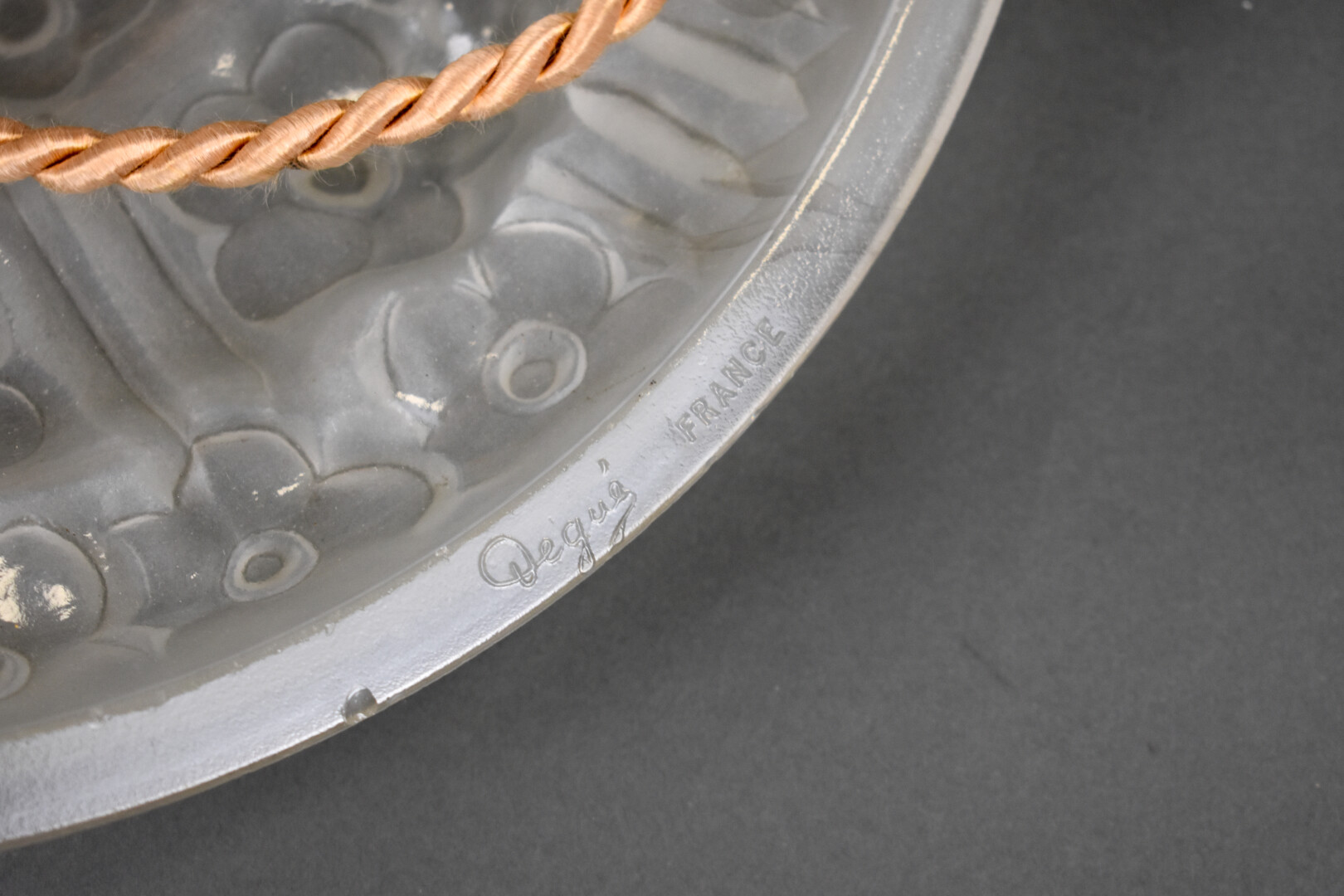DEGUE. Suspension à vasque en verre moulé de fleurs (quelques égrenures). Signée. Haut. : 54 cm – Diam. : 35 cm.