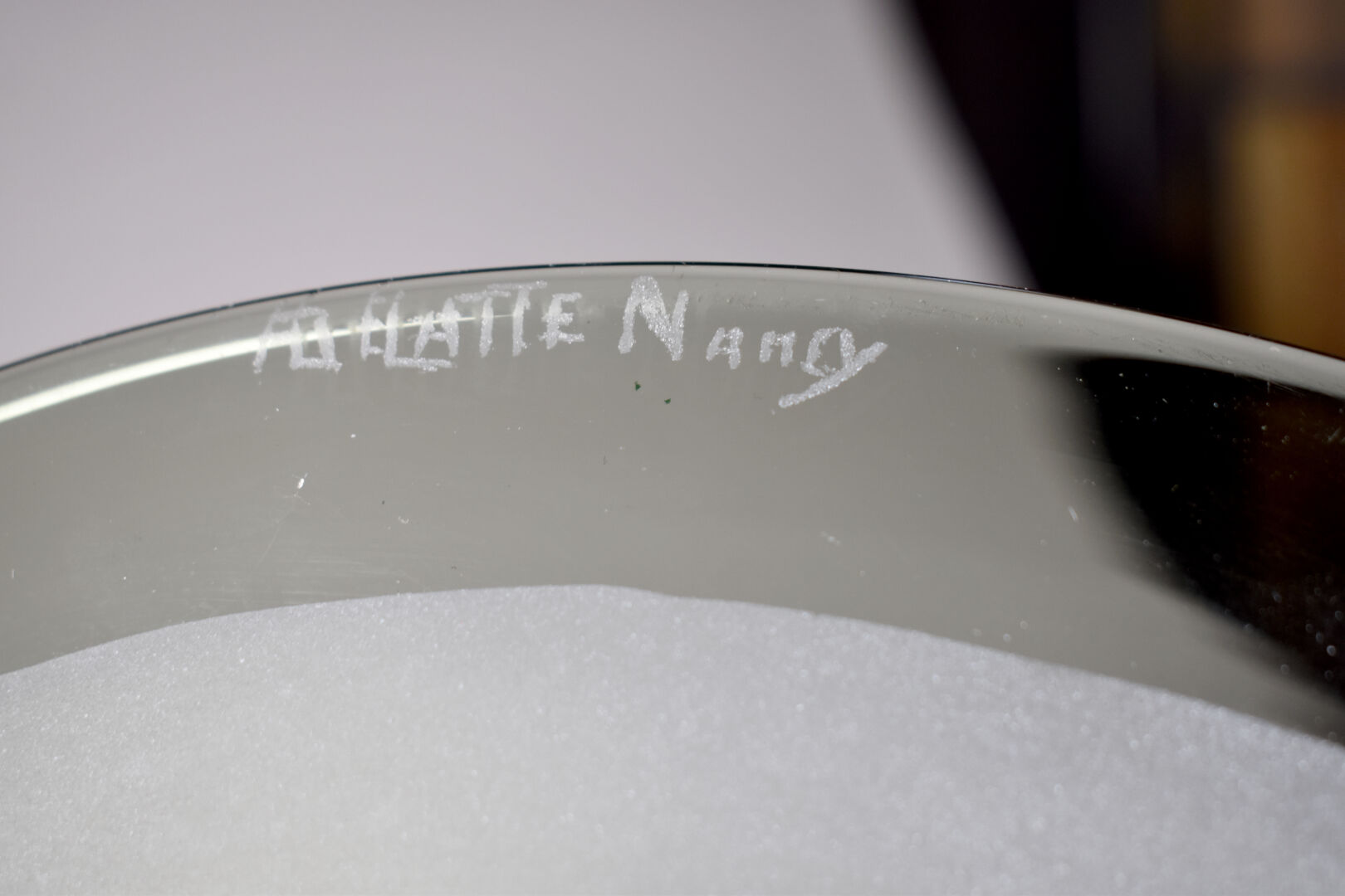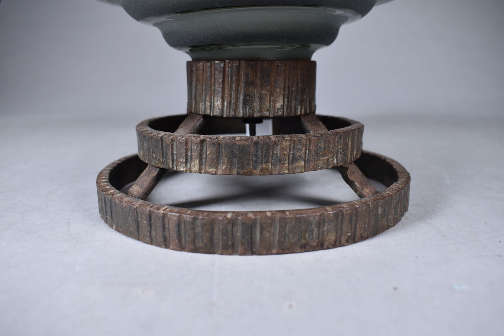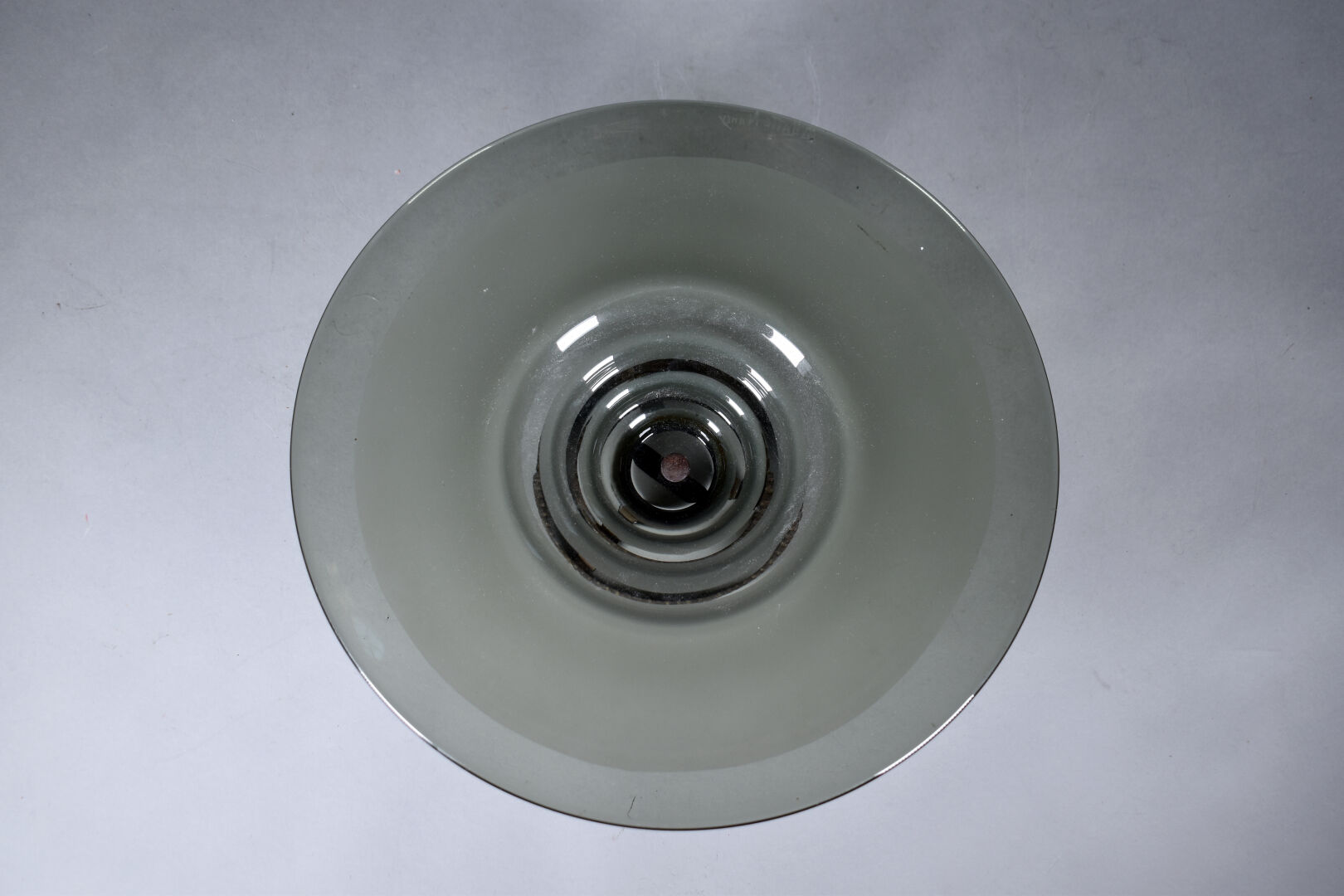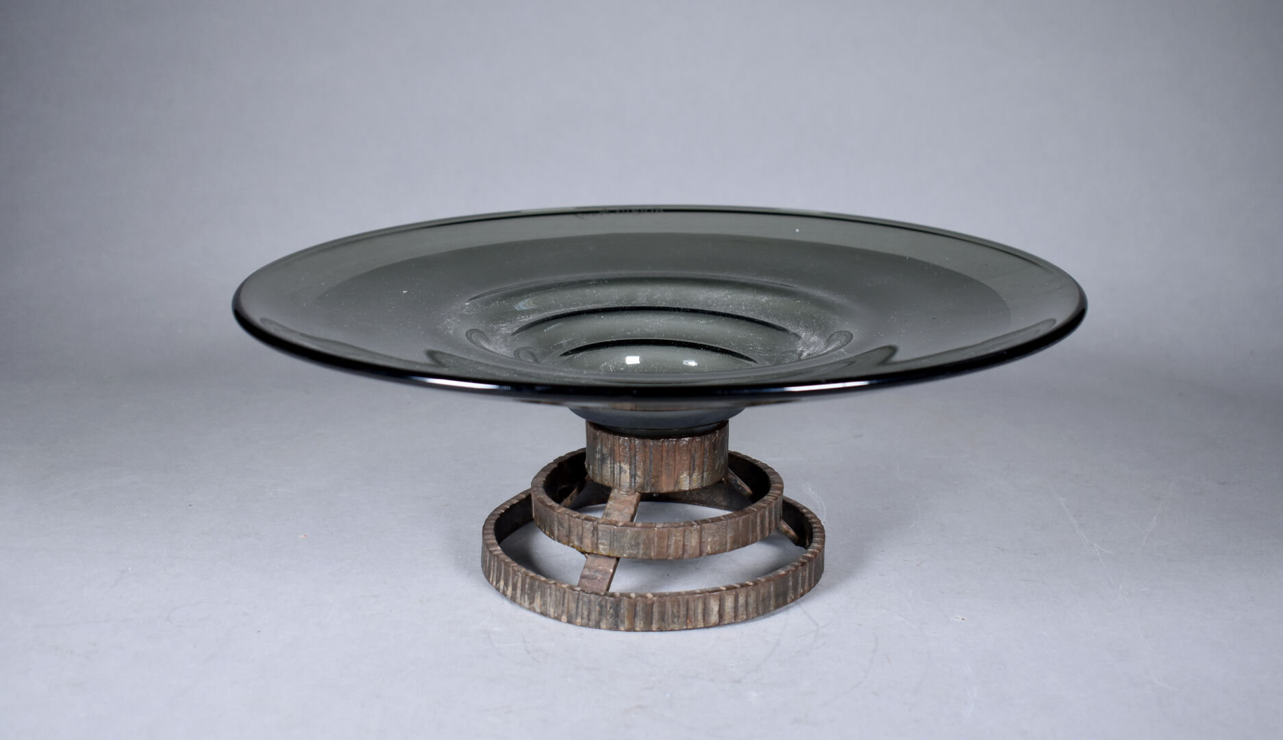 DELATTE NANCY. Coupe à fruit en verre fumé et sablé reposant sur un pied en fer martelé. Marquée. Diam. : 37 cm – Haut. : 13.5 cm.