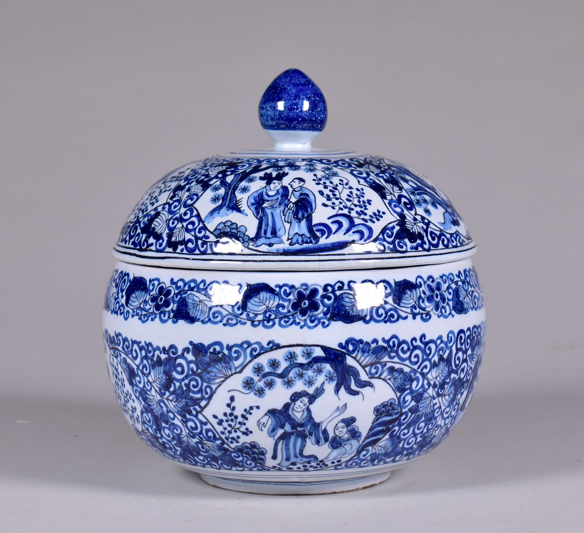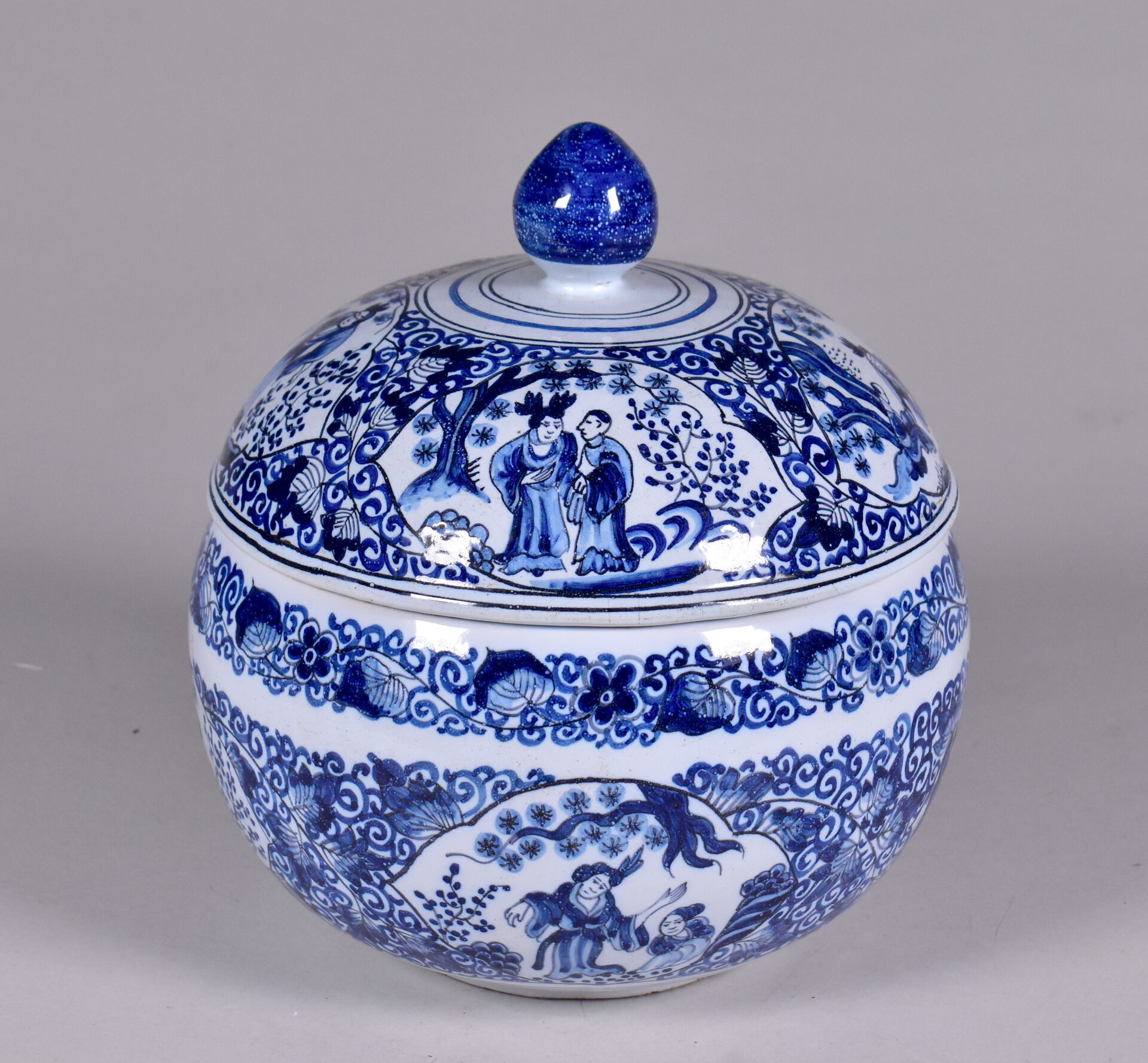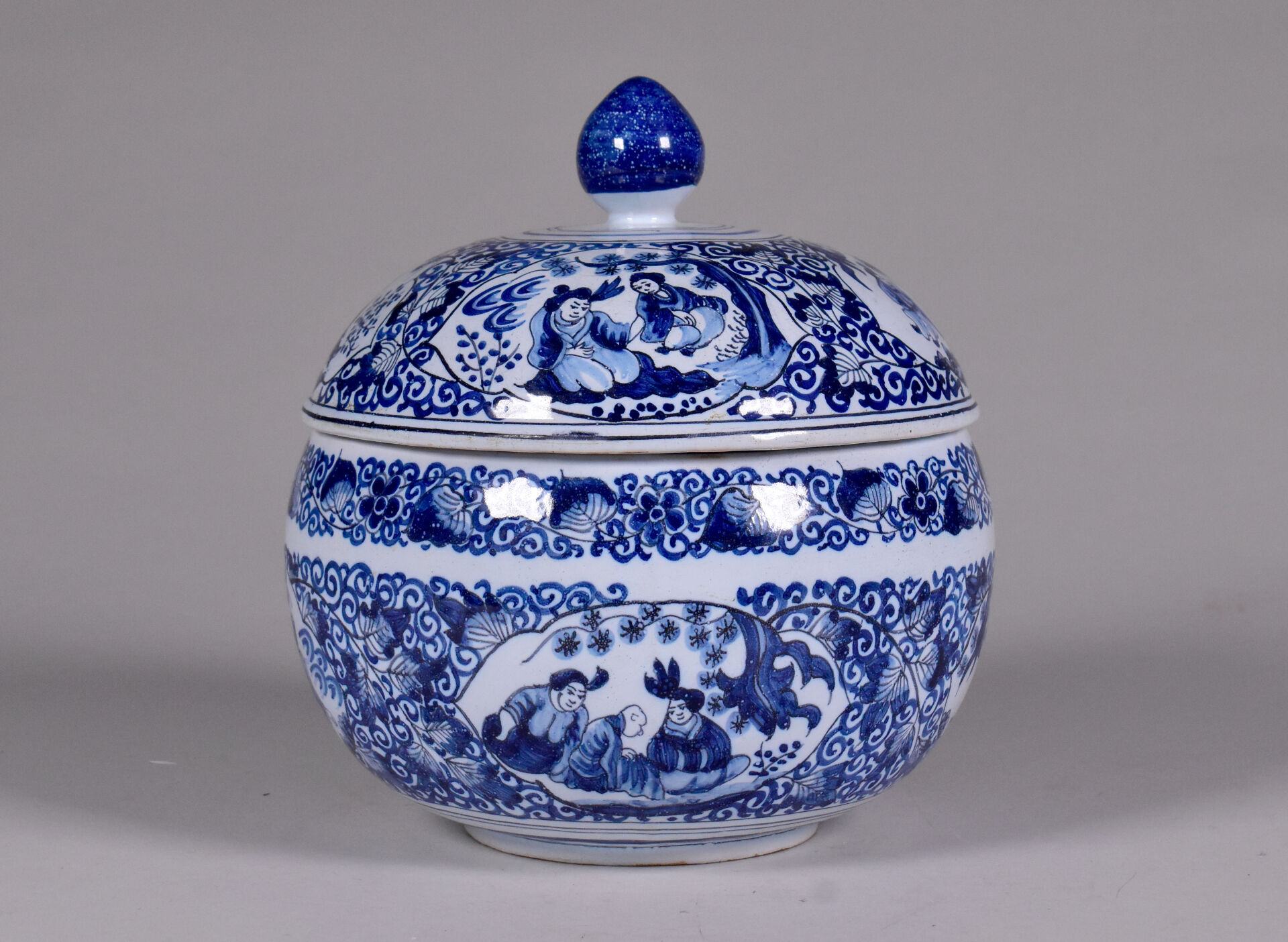 DELFT – La Griffe. Pot couvert en faïence à décor de Chinois en bleu. Marqué au dessous. XXe siècle. Haut. : 19 cm.