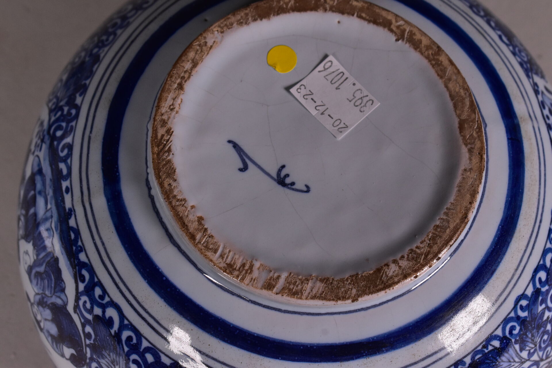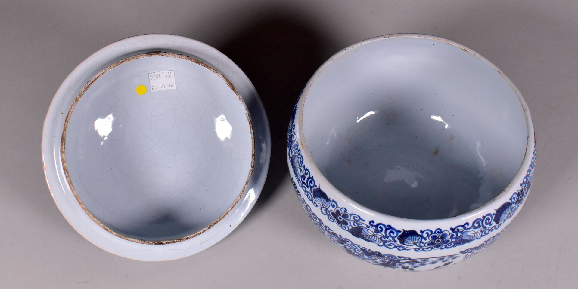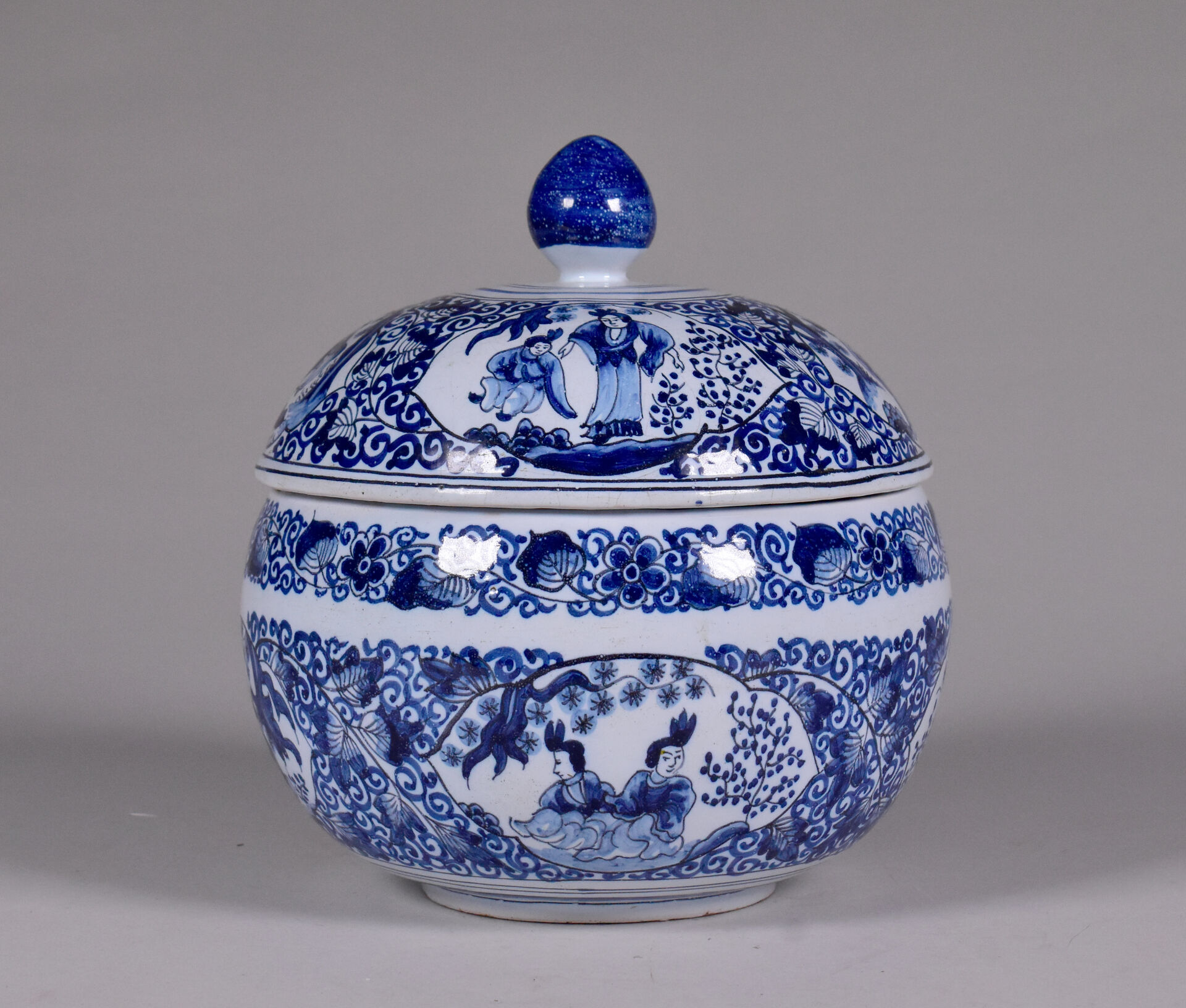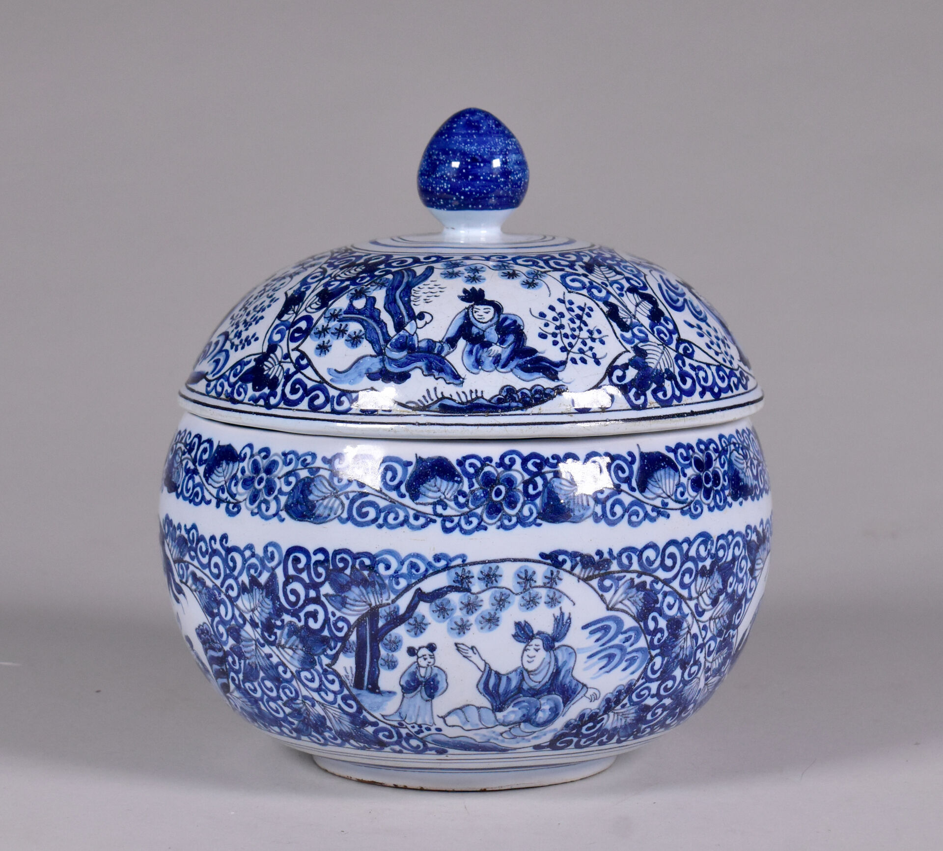 DELFT – La Griffe. Pot couvert en faïence à décor de Chinois en bleu. Marqué au dessous. XXe siècle. Haut. : 19 cm.