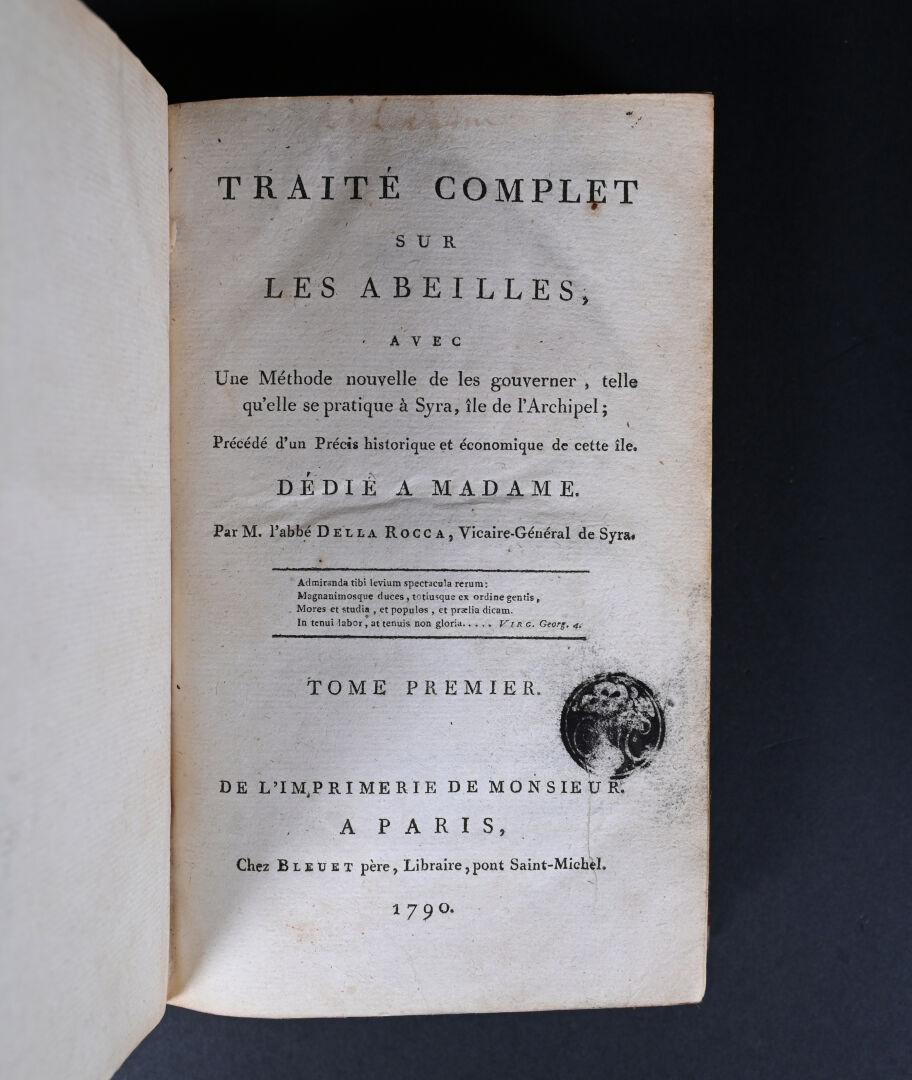 DELLA ROCA (Stefano). TRAITÉ COMPLET SUR LES ABEILLES, avec une Méthode nouvelle de les gouverner, telle qu’elle se pratique à Syra, île de l’Archipel ; précédé d’un Précis historique et économique de cette île. P., Bleuet père, 1790. Trois volumes basane fauve marbrée, dos à nerfs orné de fers et fleurons dorés, pièces de titre et de tomaison maroquin vert bronze (Reliure de l’époque). Coiffes arasées, coins élimés, manques de cuir sur 3 plats, fentes aux mors mais coutures solides. Ex-libris monogrammé (cachet encre noire) en marge des pages de titre. ÉDITION ORIGINALE de ce RARE OUVRAGE D’APICULTURE qui contient 5 PLANCHES dépliantes gravées sur cuivre dont une VUE de l’île de Syra et des représentations de ruches, matériel d’apiculteur, etc. Les 290 premières pages du tome 1 concernent l’île de Syros (« Syra » en français), centre administratif et capitale des Cyclades (Grèce).