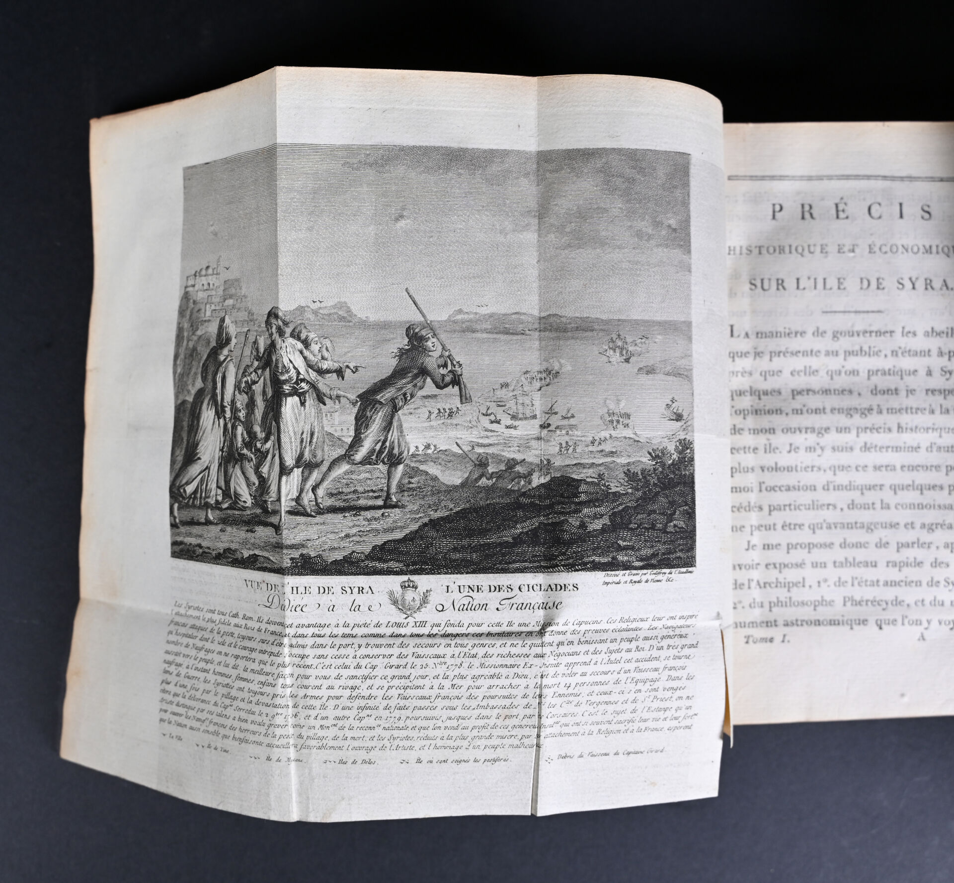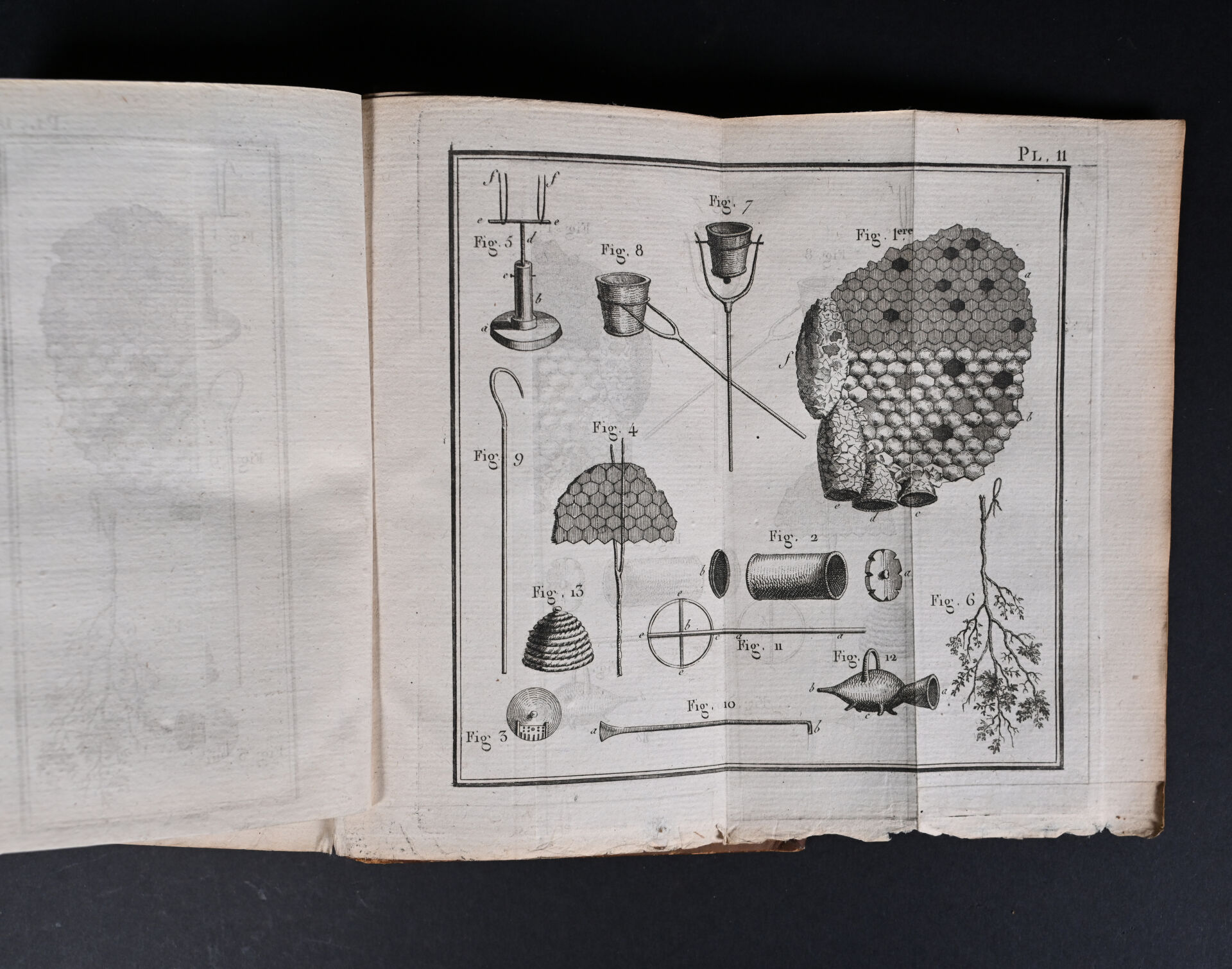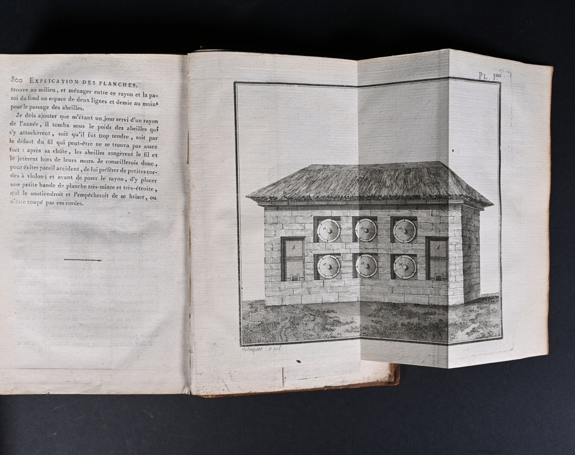 DELLA ROCA (Stefano). TRAITÉ COMPLET SUR LES ABEILLES, avec une Méthode nouvelle de les gouverner, telle qu’elle se pratique à Syra, île de l’Archipel ; précédé d’un Précis historique et économique de cette île. P., Bleuet père, 1790. Trois volumes basane fauve marbrée, dos à nerfs orné de fers et fleurons dorés, pièces de titre et de tomaison maroquin vert bronze (Reliure de l’époque). Coiffes arasées, coins élimés, manques de cuir sur 3 plats, fentes aux mors mais coutures solides. Ex-libris monogrammé (cachet encre noire) en marge des pages de titre. ÉDITION ORIGINALE de ce RARE OUVRAGE D’APICULTURE qui contient 5 PLANCHES dépliantes gravées sur cuivre dont une VUE de l’île de Syra et des représentations de ruches, matériel d’apiculteur, etc. Les 290 premières pages du tome 1 concernent l’île de Syros (« Syra » en français), centre administratif et capitale des Cyclades (Grèce).