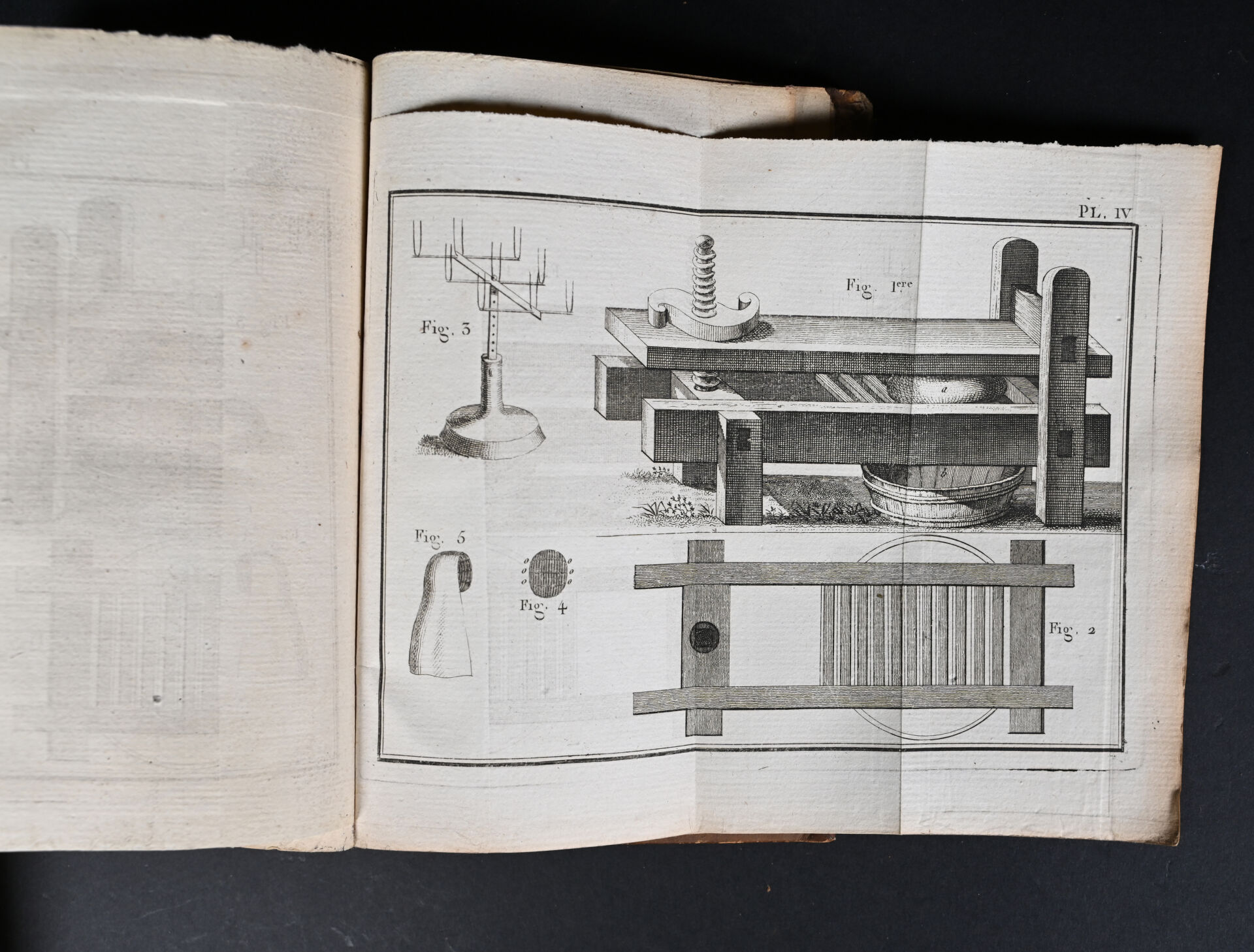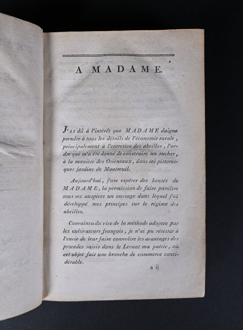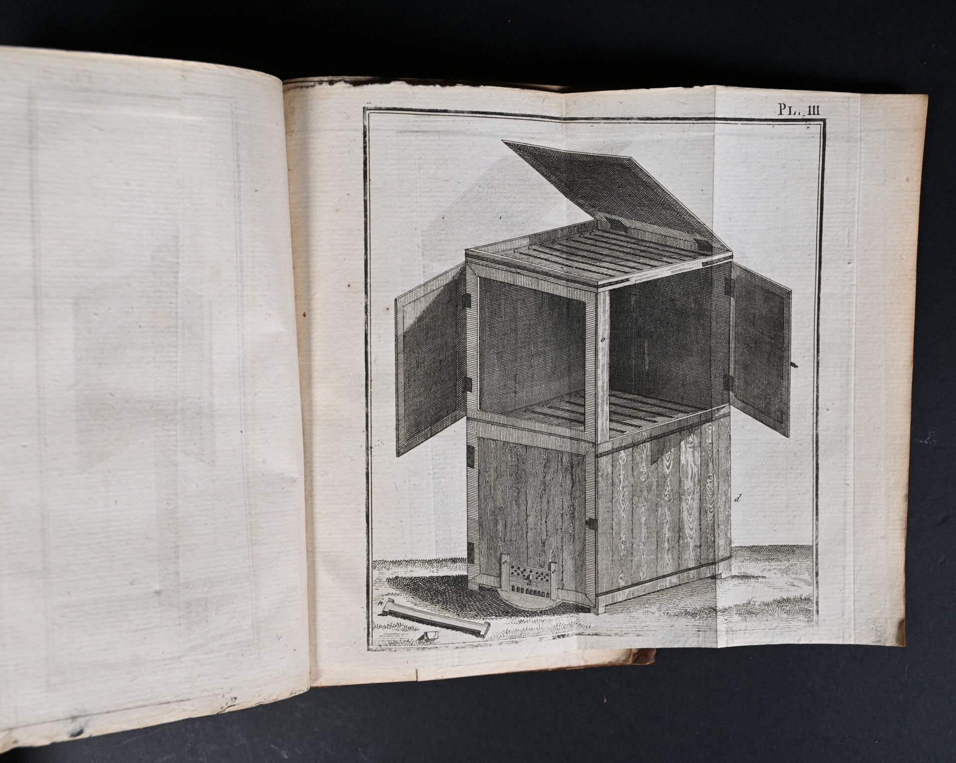 DELLA ROCA (Stefano). TRAITÉ COMPLET SUR LES ABEILLES, avec une Méthode nouvelle de les gouverner, telle qu’elle se pratique à Syra, île de l’Archipel ; précédé d’un Précis historique et économique de cette île. P., Bleuet père, 1790. Trois volumes basane fauve marbrée, dos à nerfs orné de fers et fleurons dorés, pièces de titre et de tomaison maroquin vert bronze (Reliure de l’époque). Coiffes arasées, coins élimés, manques de cuir sur 3 plats, fentes aux mors mais coutures solides. Ex-libris monogrammé (cachet encre noire) en marge des pages de titre. ÉDITION ORIGINALE de ce RARE OUVRAGE D’APICULTURE qui contient 5 PLANCHES dépliantes gravées sur cuivre dont une VUE de l’île de Syra et des représentations de ruches, matériel d’apiculteur, etc. Les 290 premières pages du tome 1 concernent l’île de Syros (« Syra » en français), centre administratif et capitale des Cyclades (Grèce).