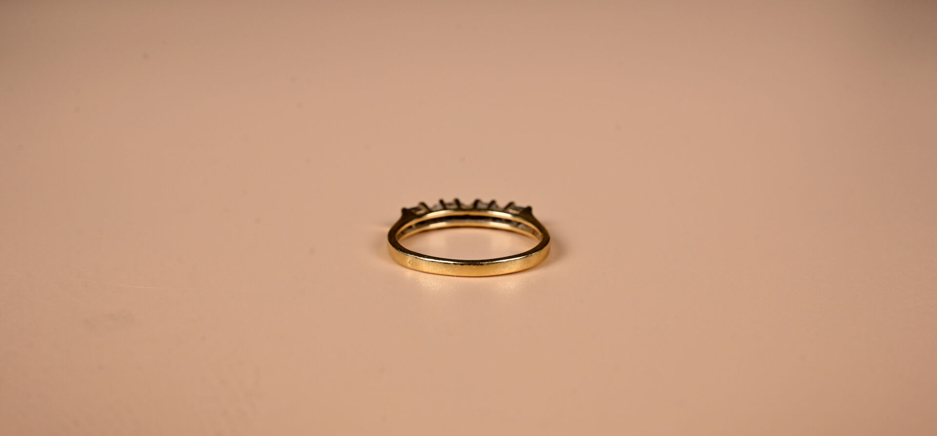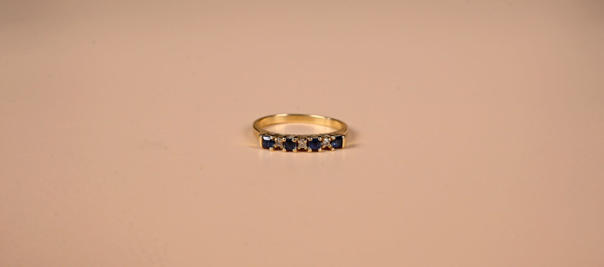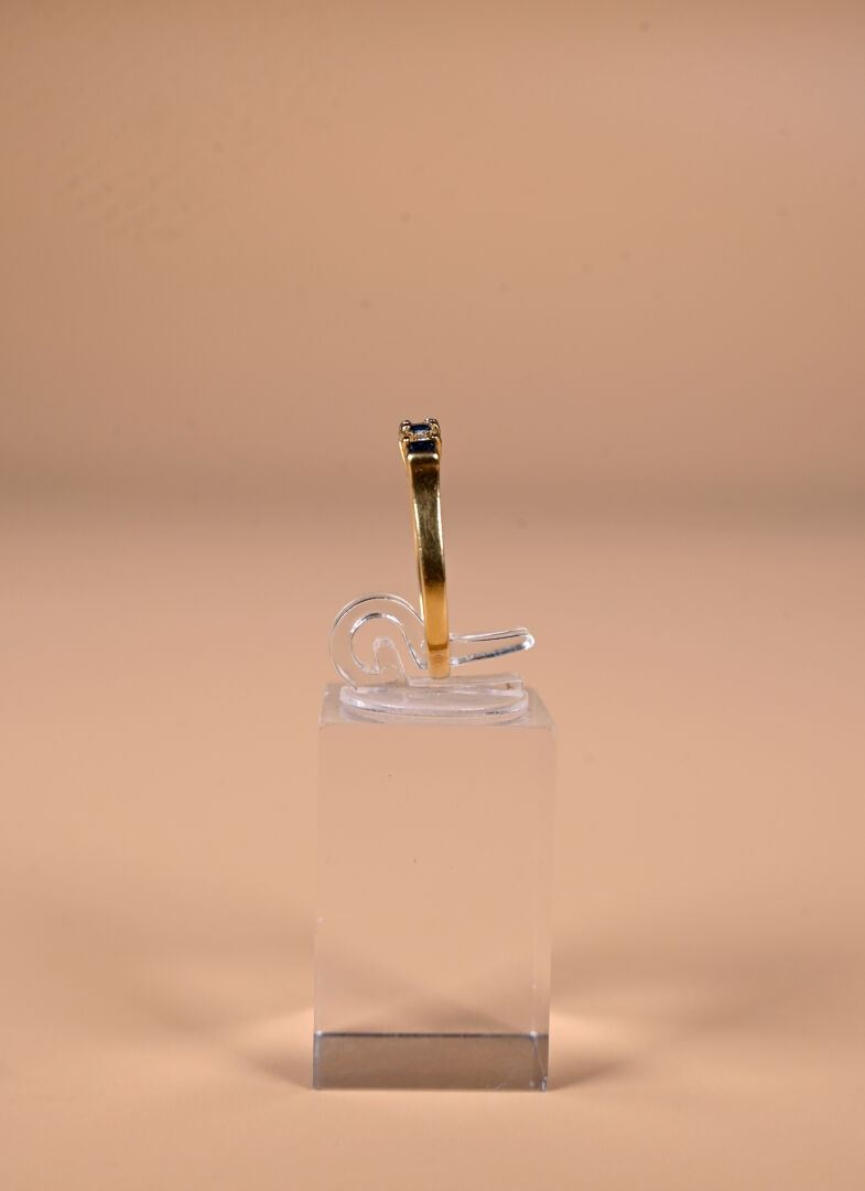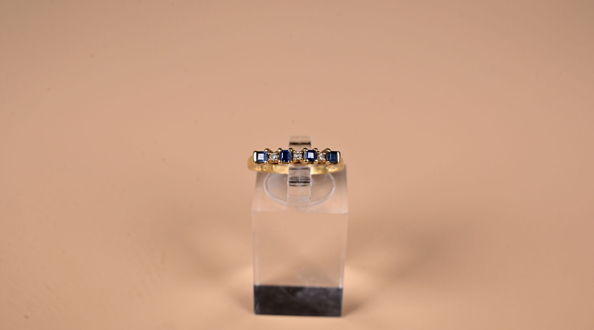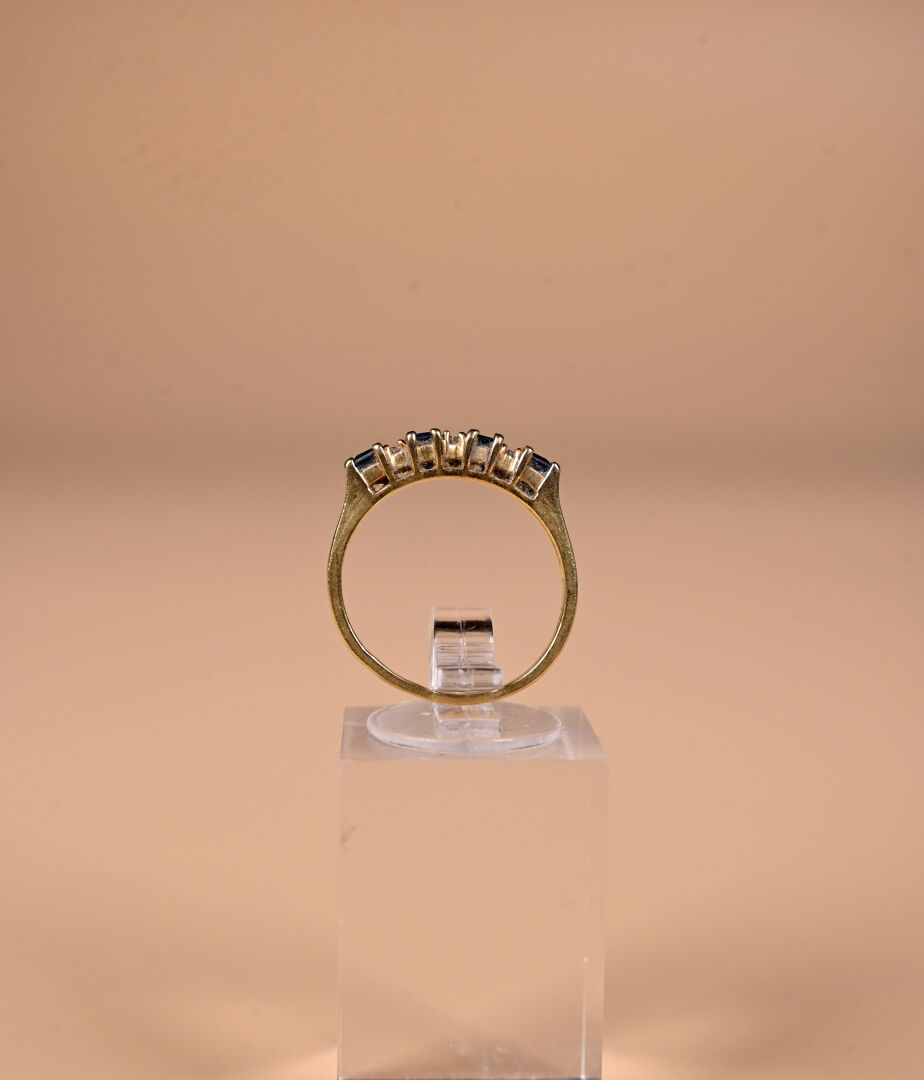 Demi-anneau en or jaune 18K 750/1000e serti de saphirs calibrés et de petits diamants. TDD 53 (tordue). Poids brut. : 2,7 g.