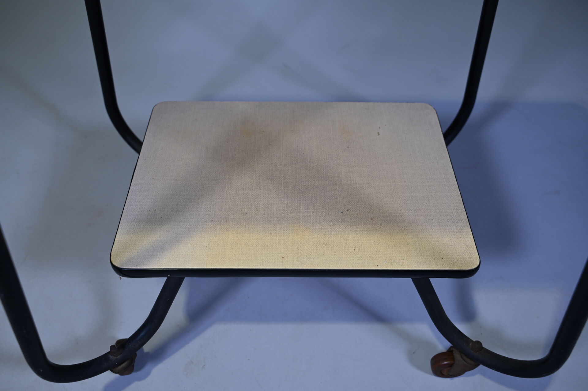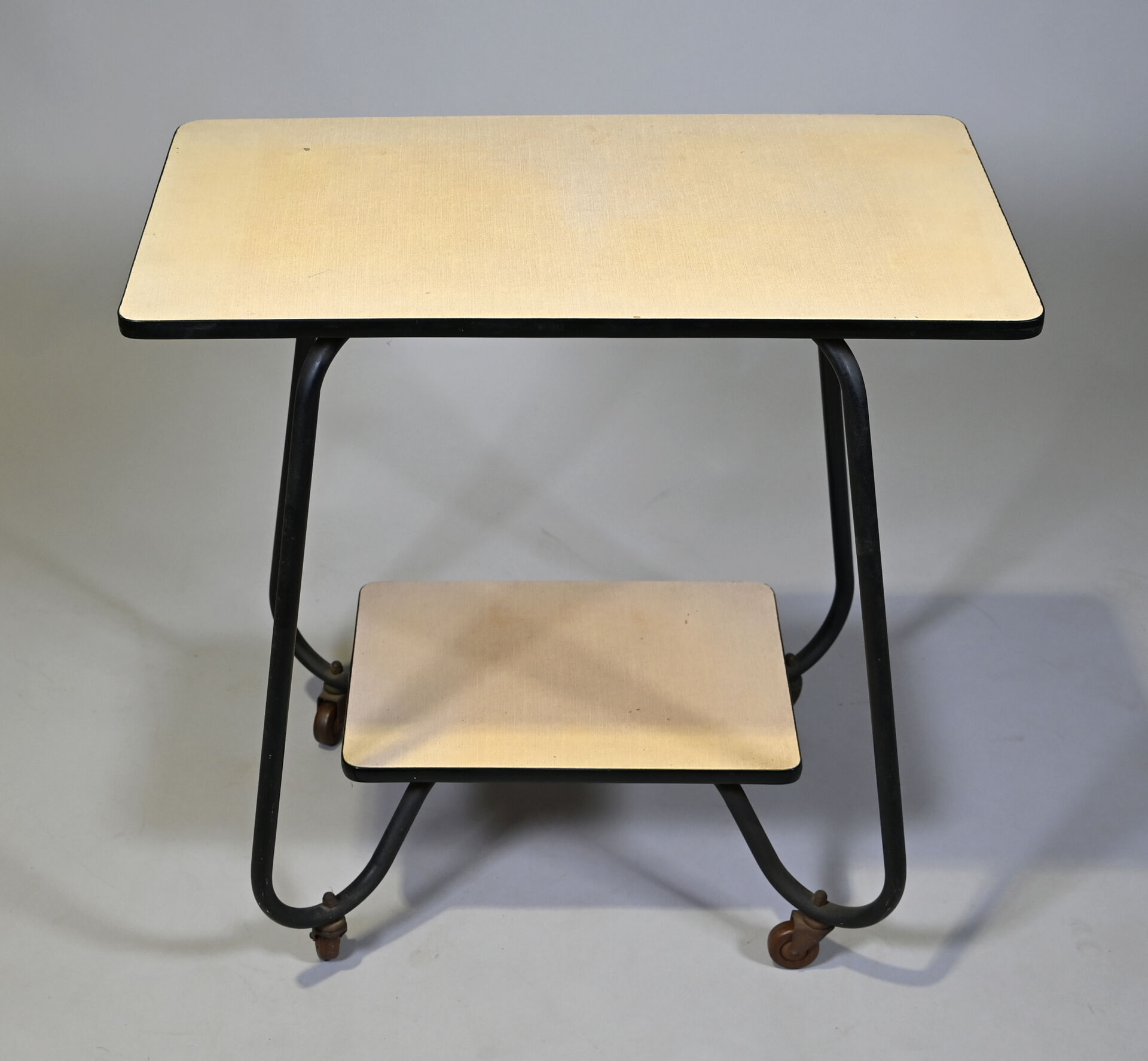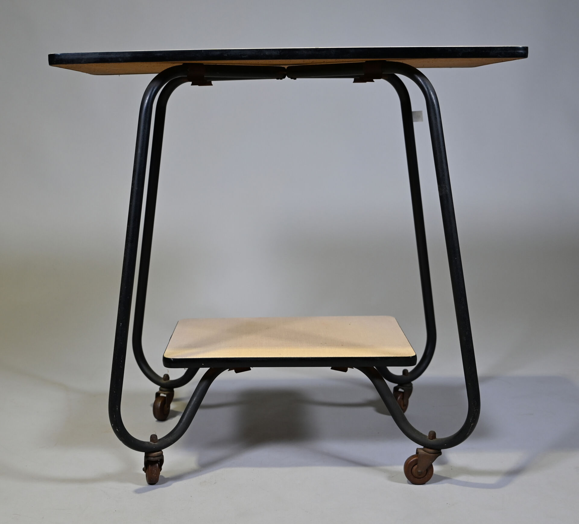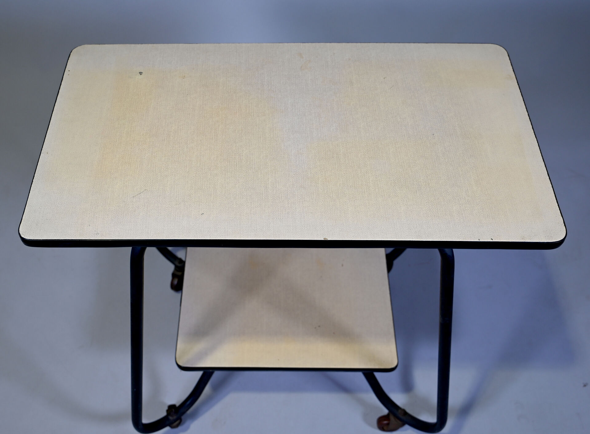 Desserte à double plateau en formica, la structure en métal tubulaire noir à roulettes (quelques piqures). Vers 1950. Haut. : 70,5 cm. – Larg. : 73, 5 cm. – Prof. : 41 cm.
