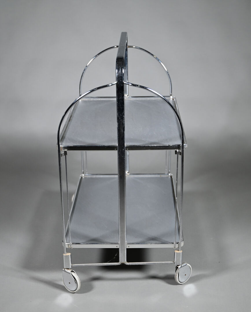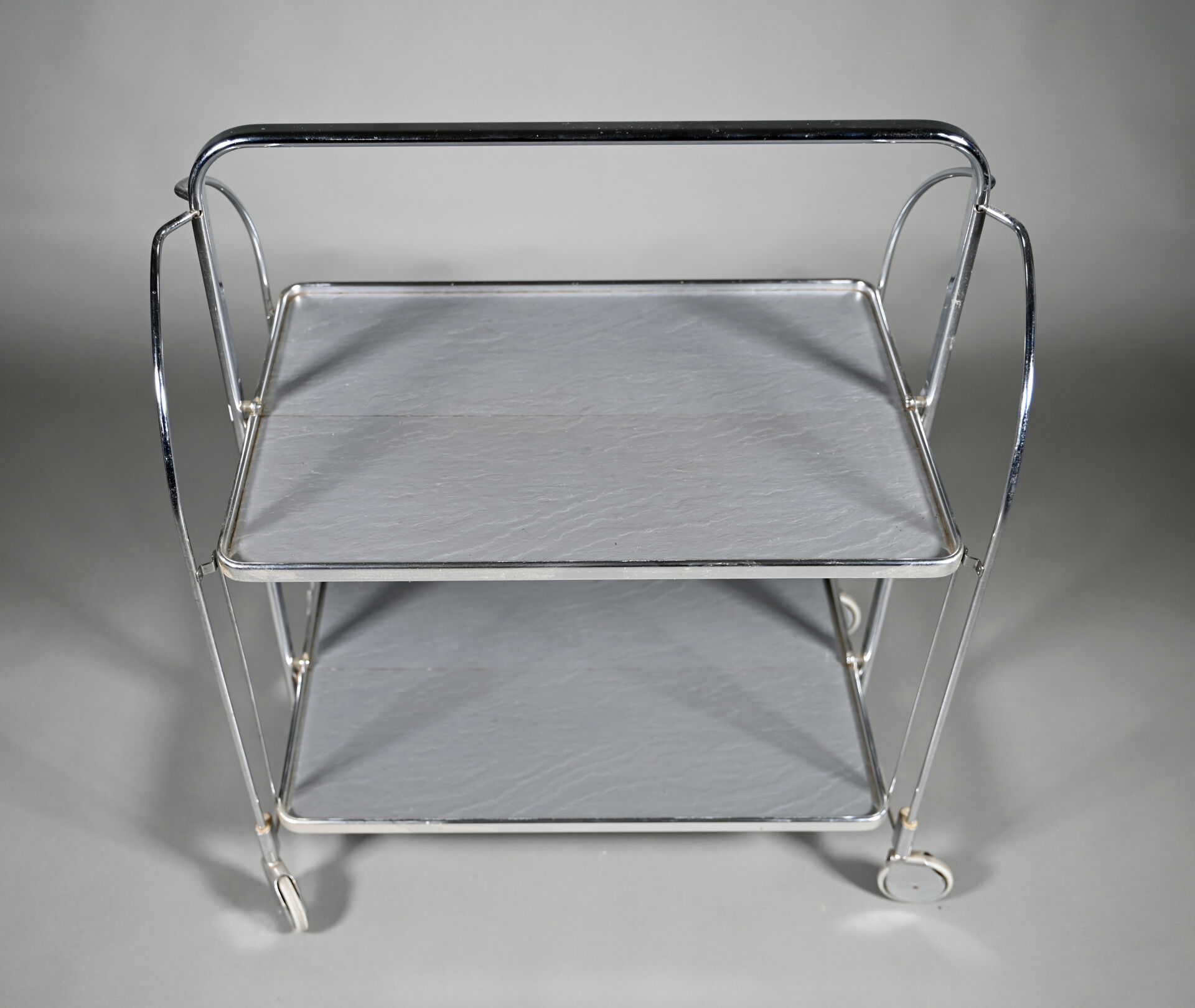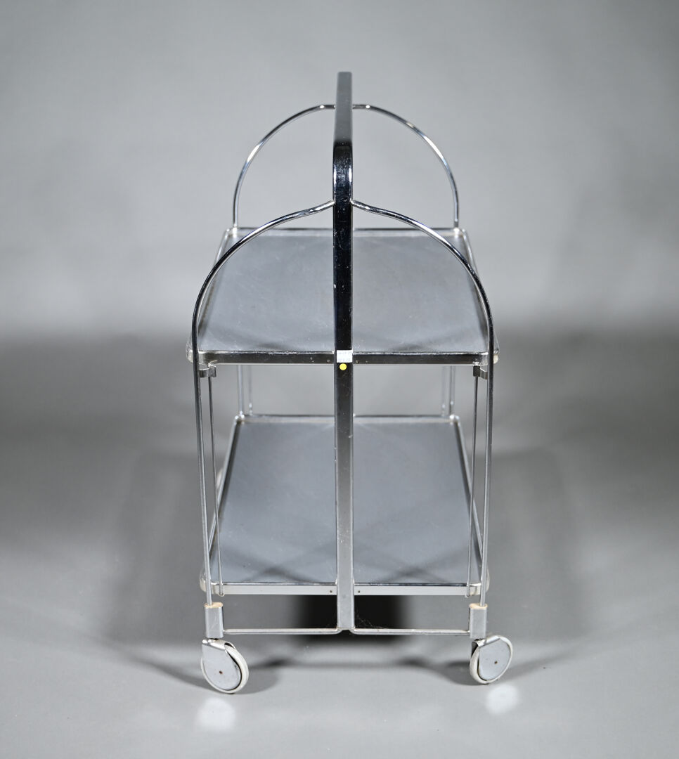Desserte pliante en métal chromé à deux plateaux à l’imitation de l’ardoise. Vers 1970. Dimensions ouverte : Haut. : 79 cm – Larg. : 68 cm – Prof. : 42 cm.