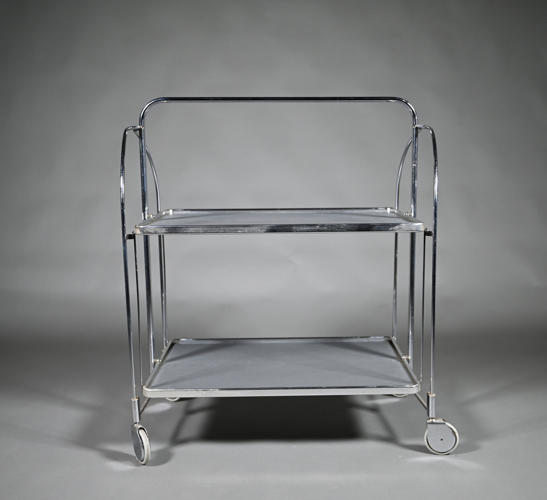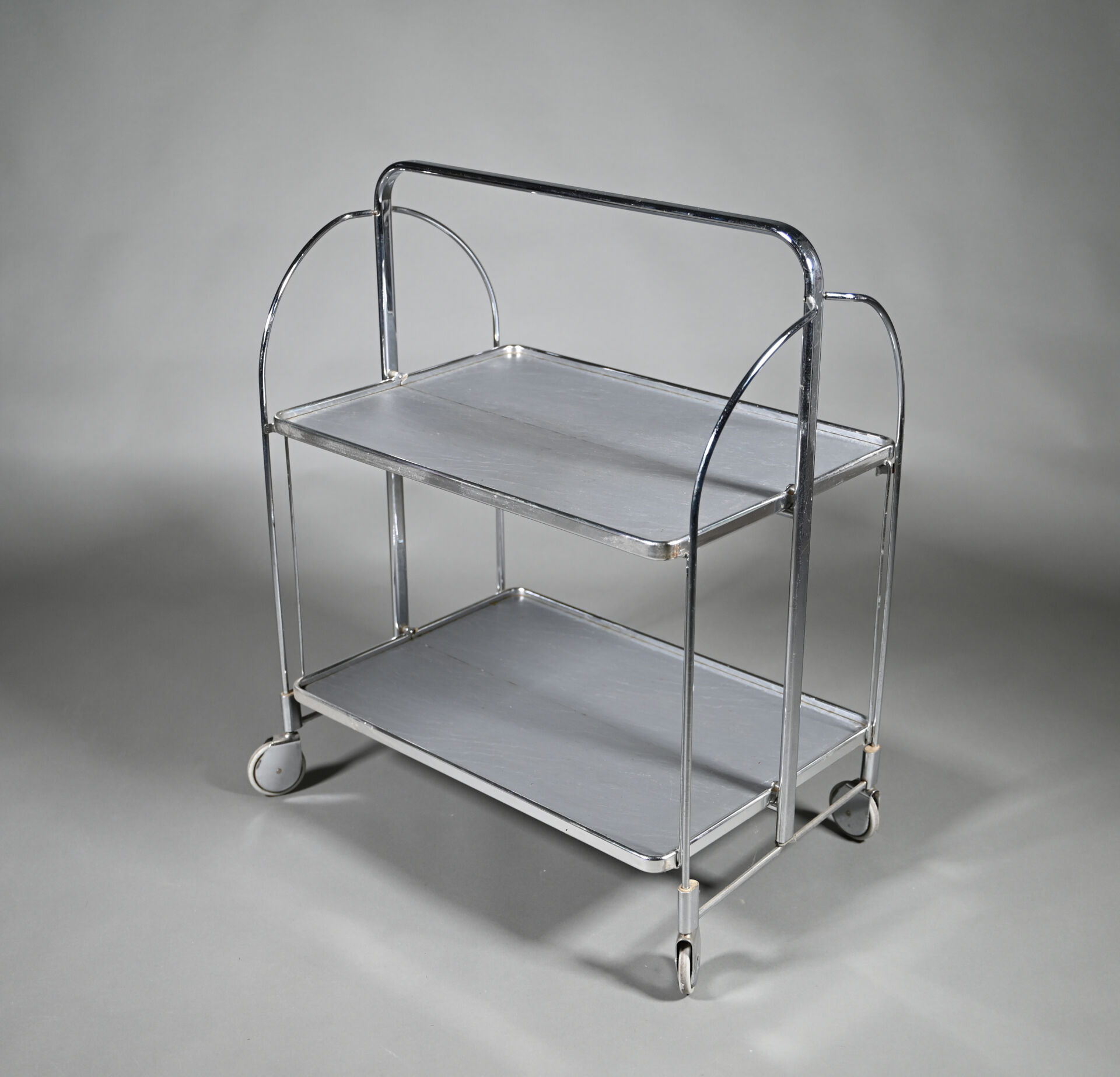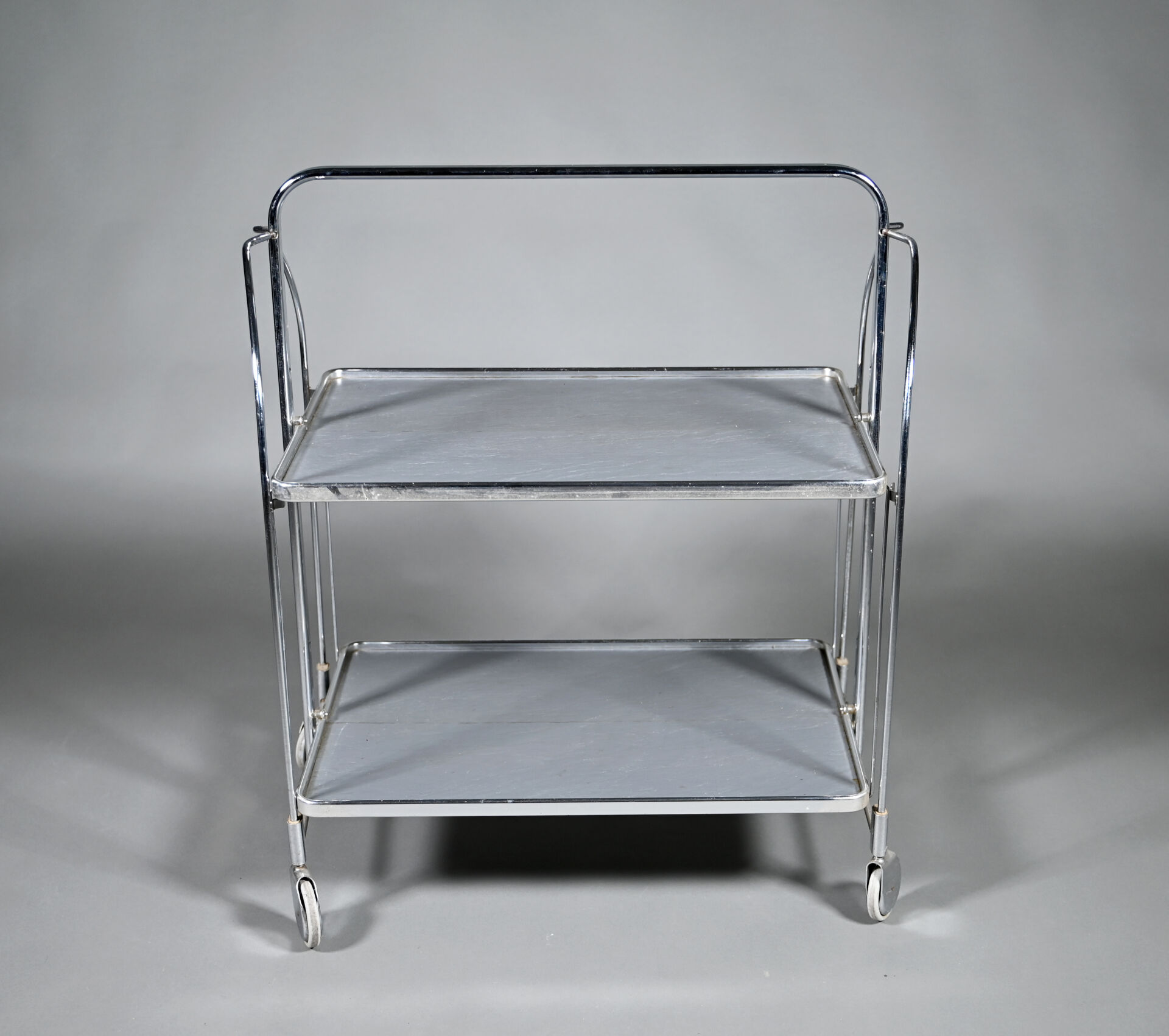 Desserte pliante en métal chromé à deux plateaux à l’imitation de l’ardoise. Vers 1970. Dimensions ouverte : Haut. : 79 cm – Larg. : 68 cm – Prof. : 42 cm.