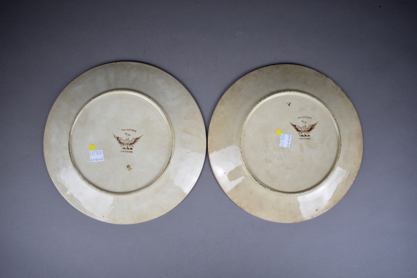 Deux assiettes en faïence à décor en brun de paysages d’inspiration asiatique. Marquées IRONSTONE CHUSAN. Travail chinois pour le marché européen. Vers 1900. Diam. : 25 cm.