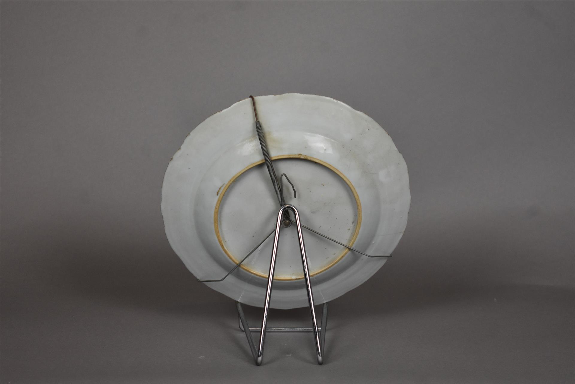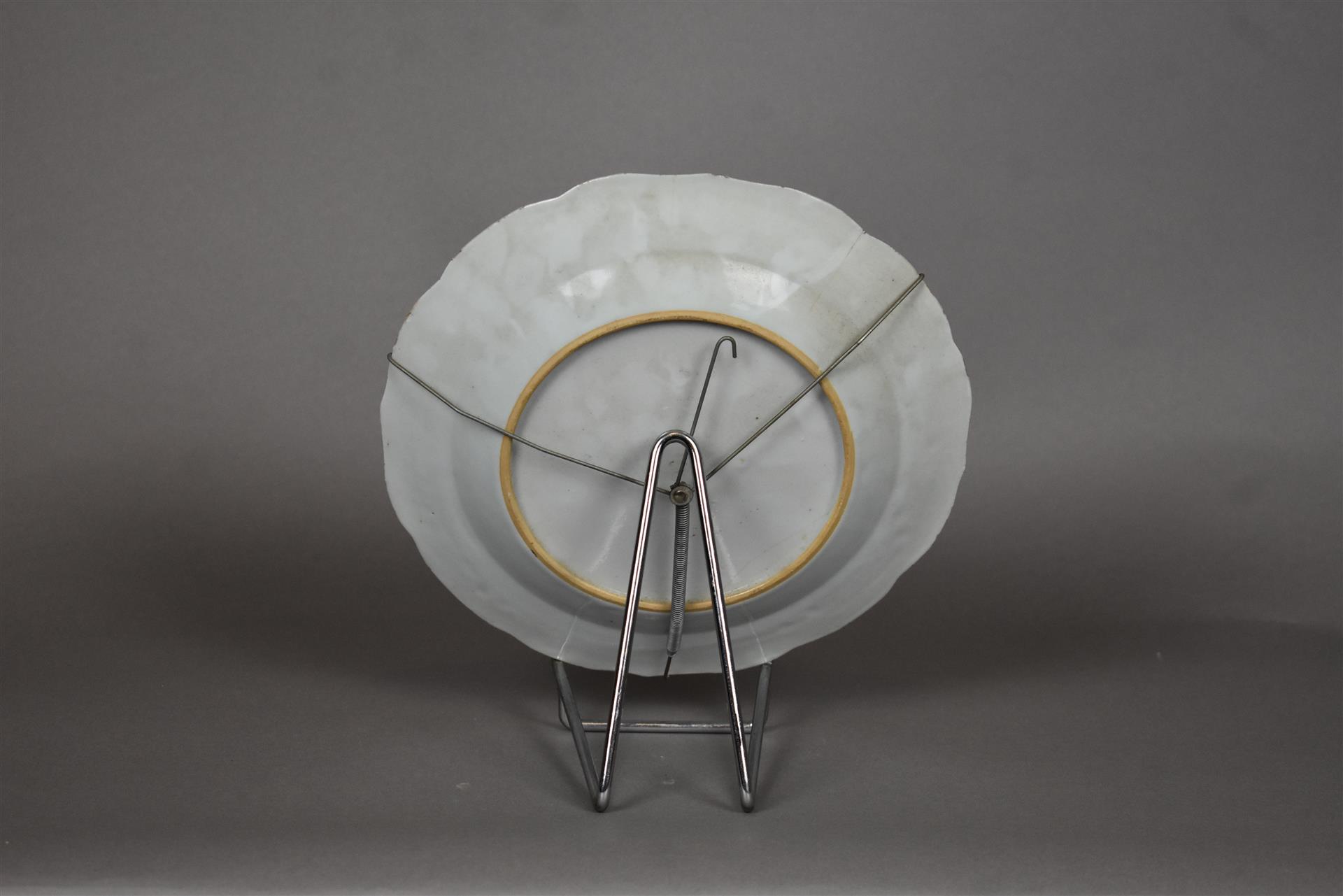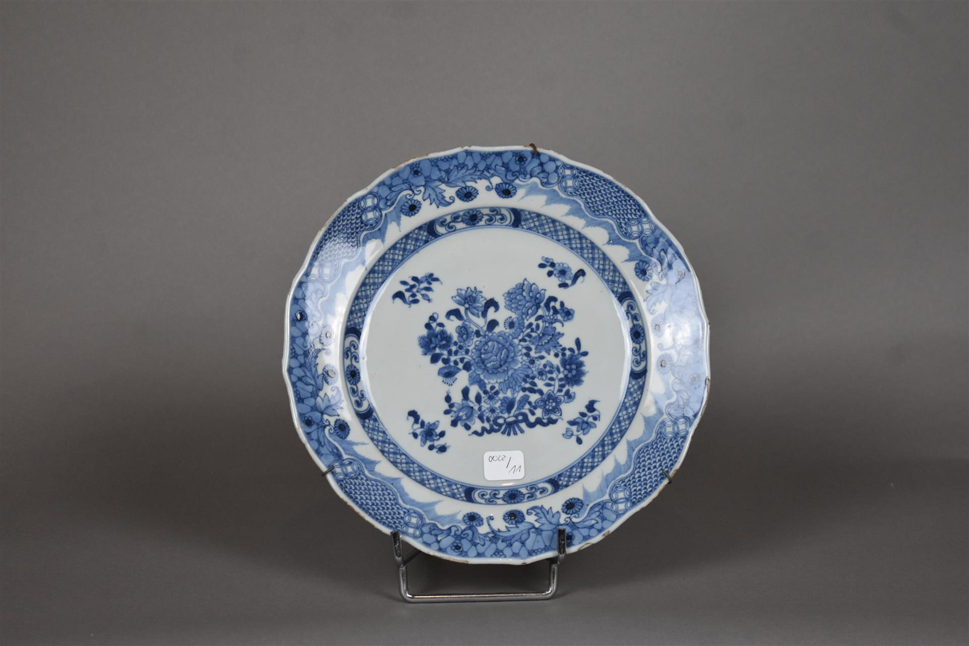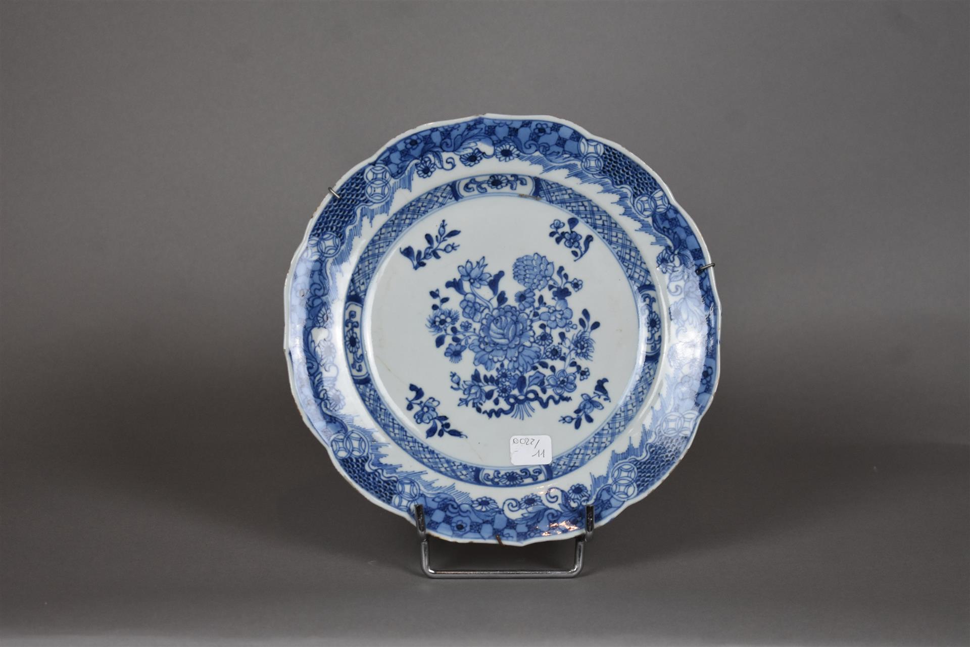 Deux assiettes en porcelaine à décor en bleu sous couverte d’un bouquet de fleur, l’aile à décor d’écailles et fleurs (les deux avec fêle). Chine, XVIIIe siècle. Diam. : 23 cm.