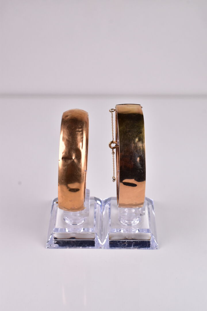 Deux bracelets type joncs ouvrants en or rose 18K 750/1000e (chocs et manque). Poids de l’ensemble. : 28,6 g.