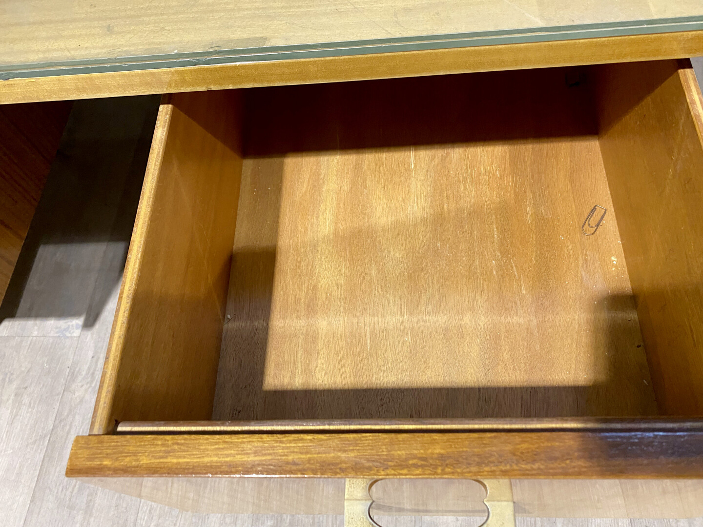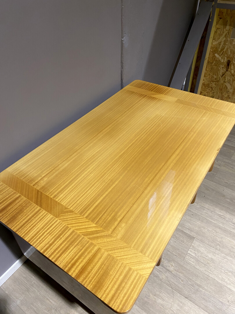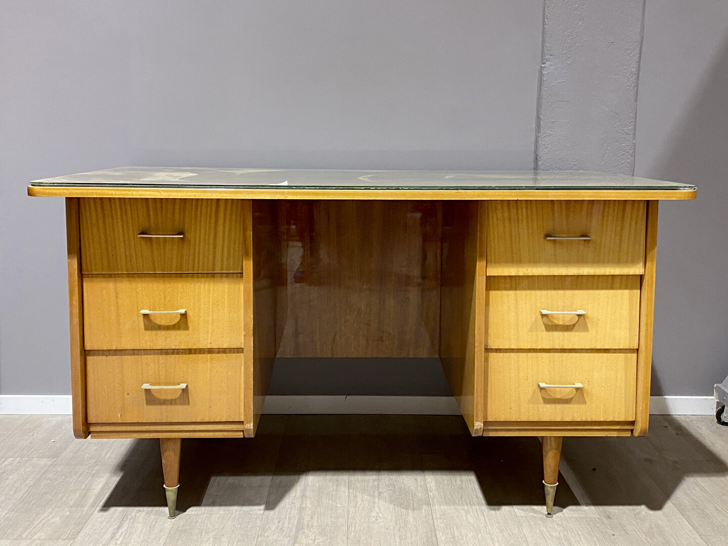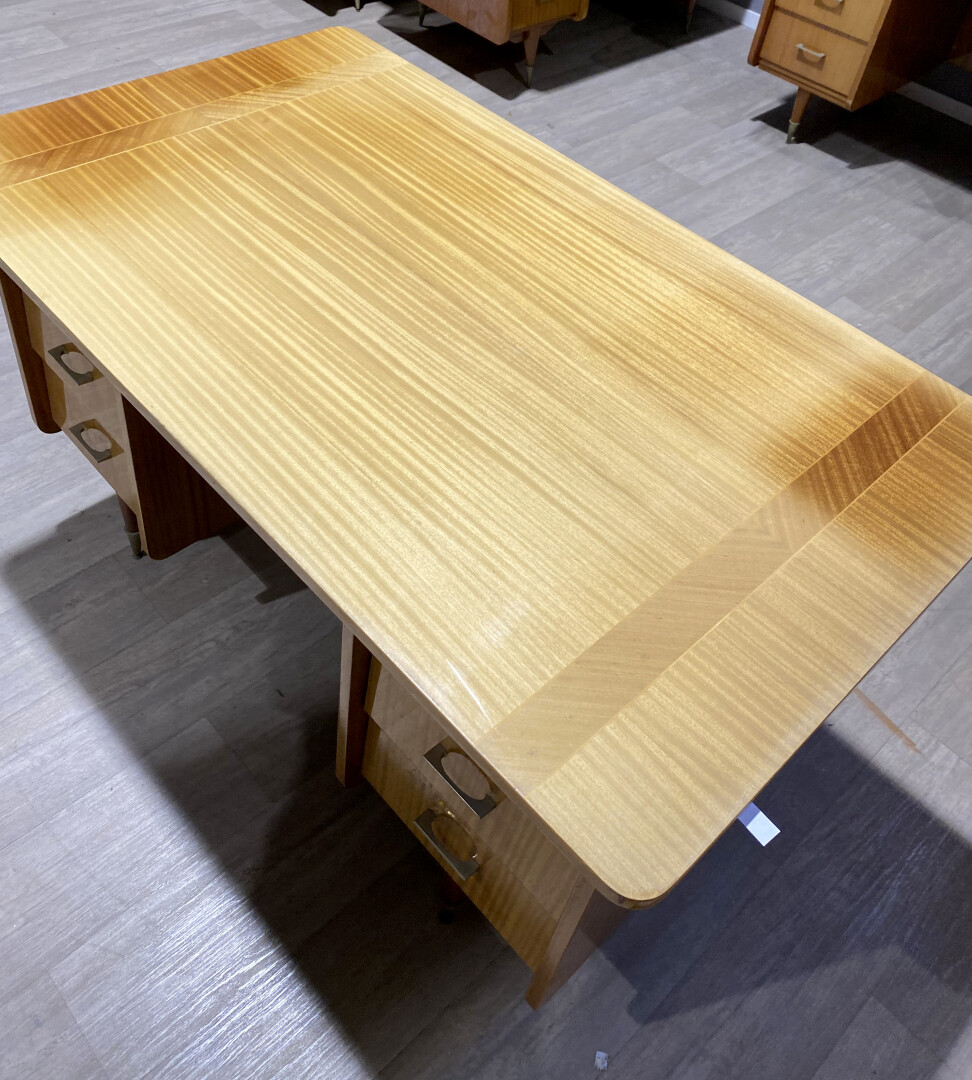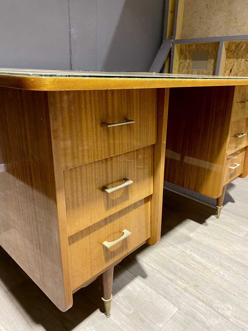 Deux bureaux à caissons en aggloméré plaqué de citronnier (légèrement insolés). Ils ouvrent à 6 tiroirs. Piétements fuselés à sabots de métal. Vers 1950/1960. Plateau de verre raporté. Haut. : 79 cm – Larg. : 80 cm- Prof. : 141 cm.