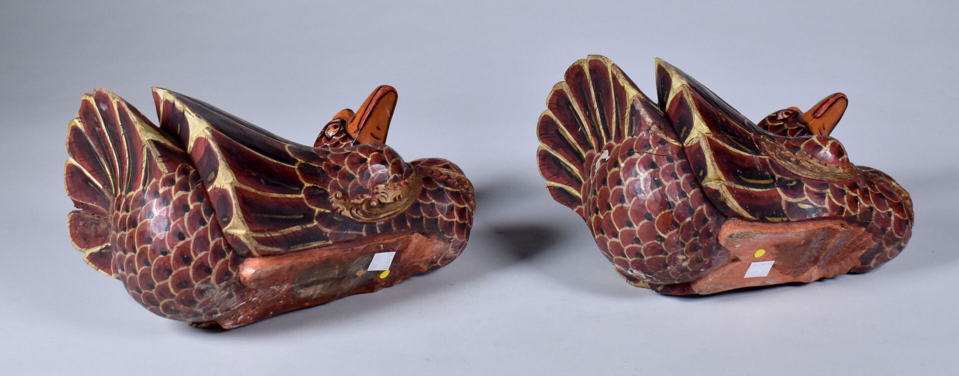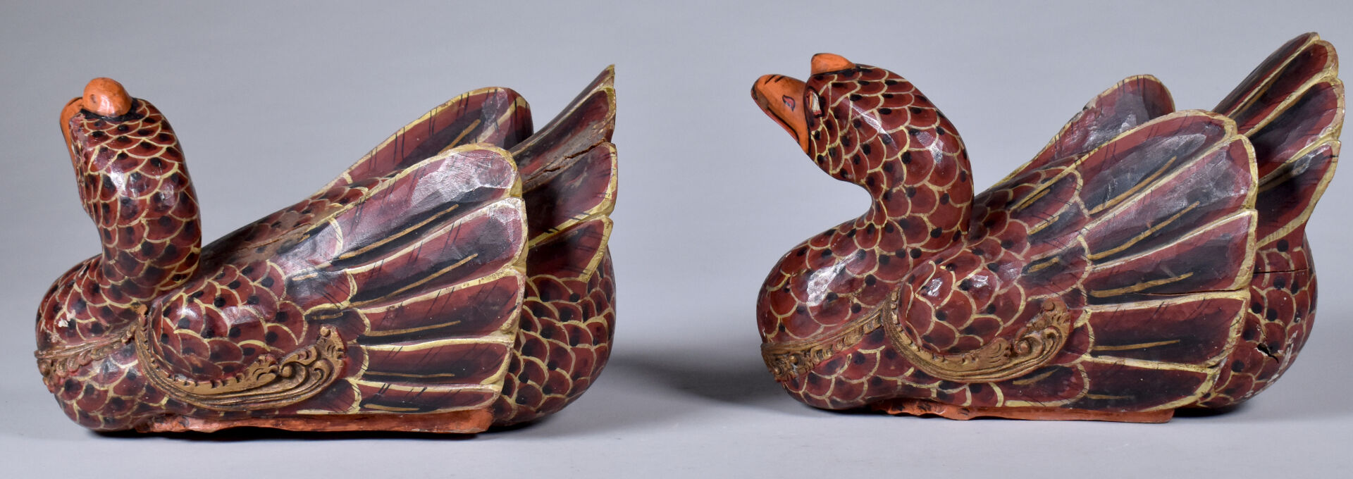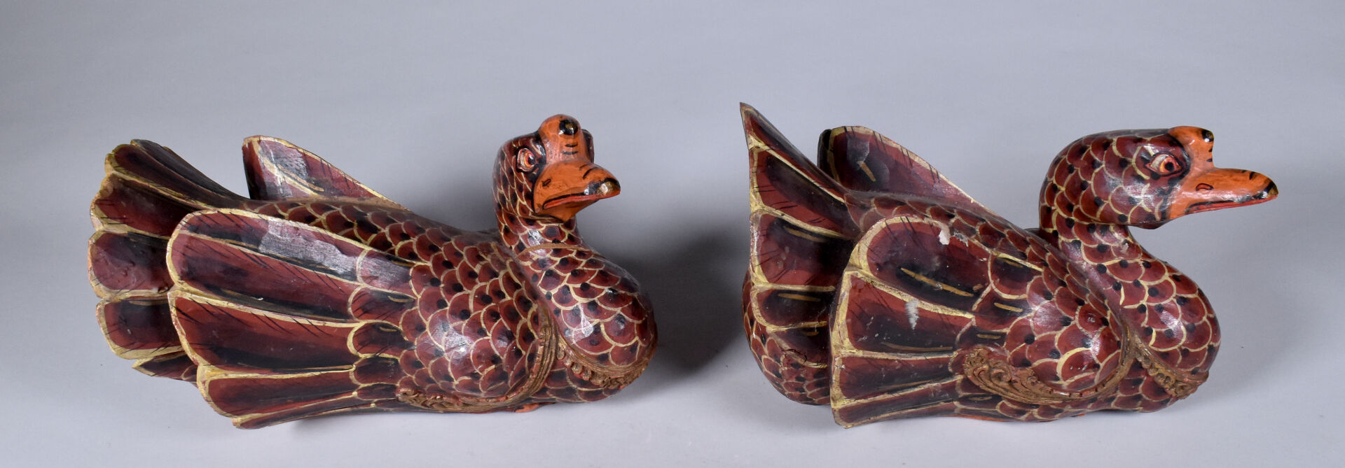 Deux canards en bois peint sculpté (usures et éclats). . Asie du Sud-Est. Haut. : 18 cm – Larg. : 26 cm – Prof. : 20 cm.