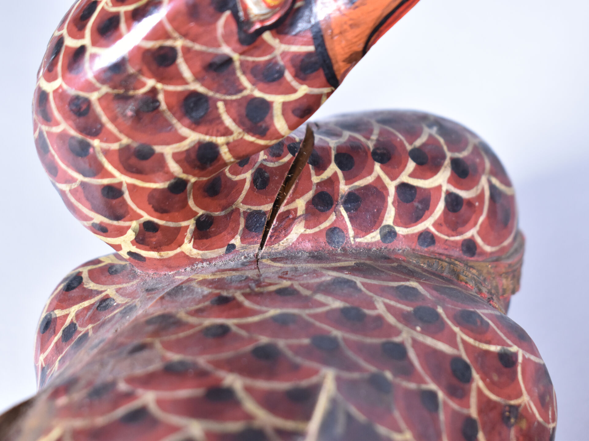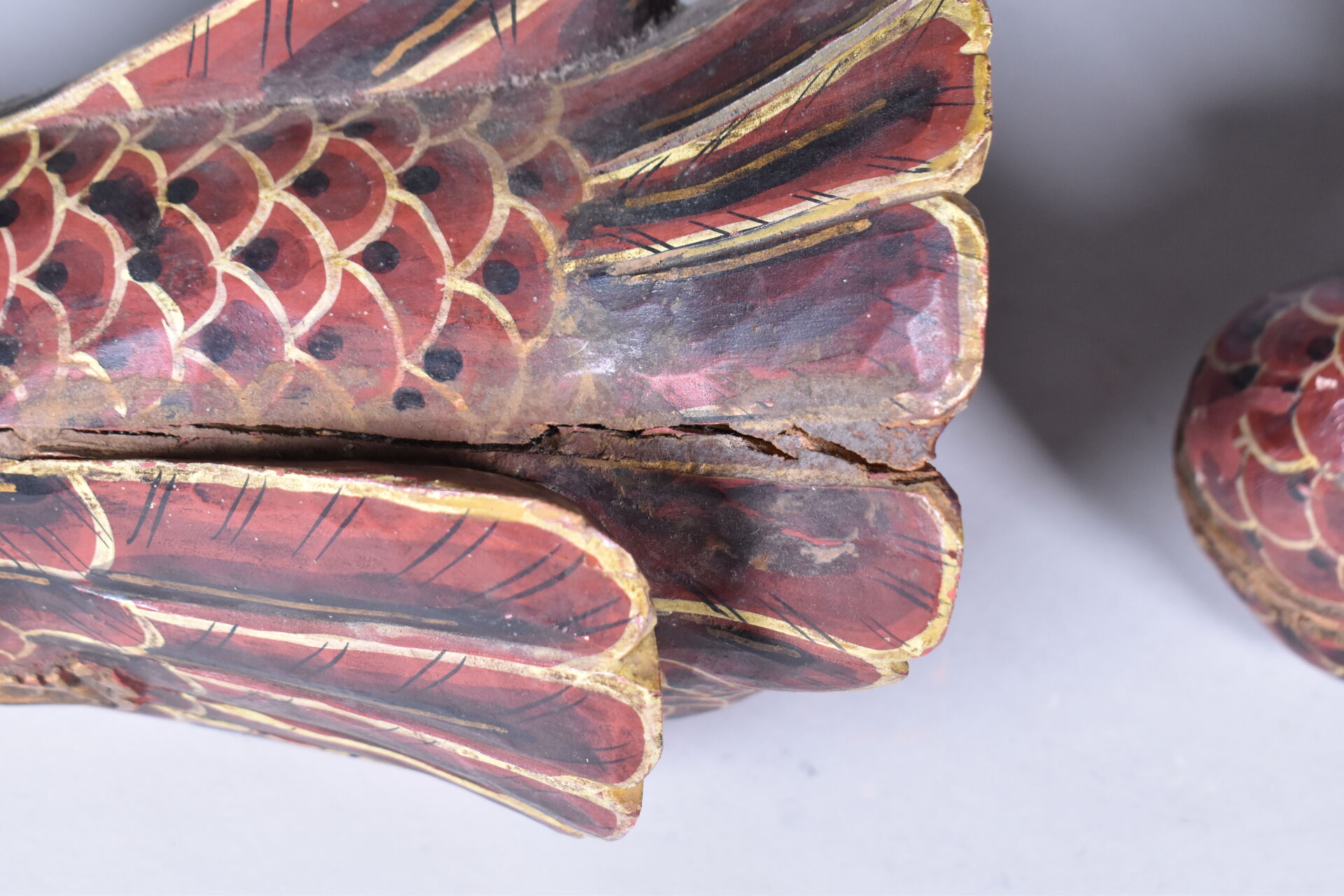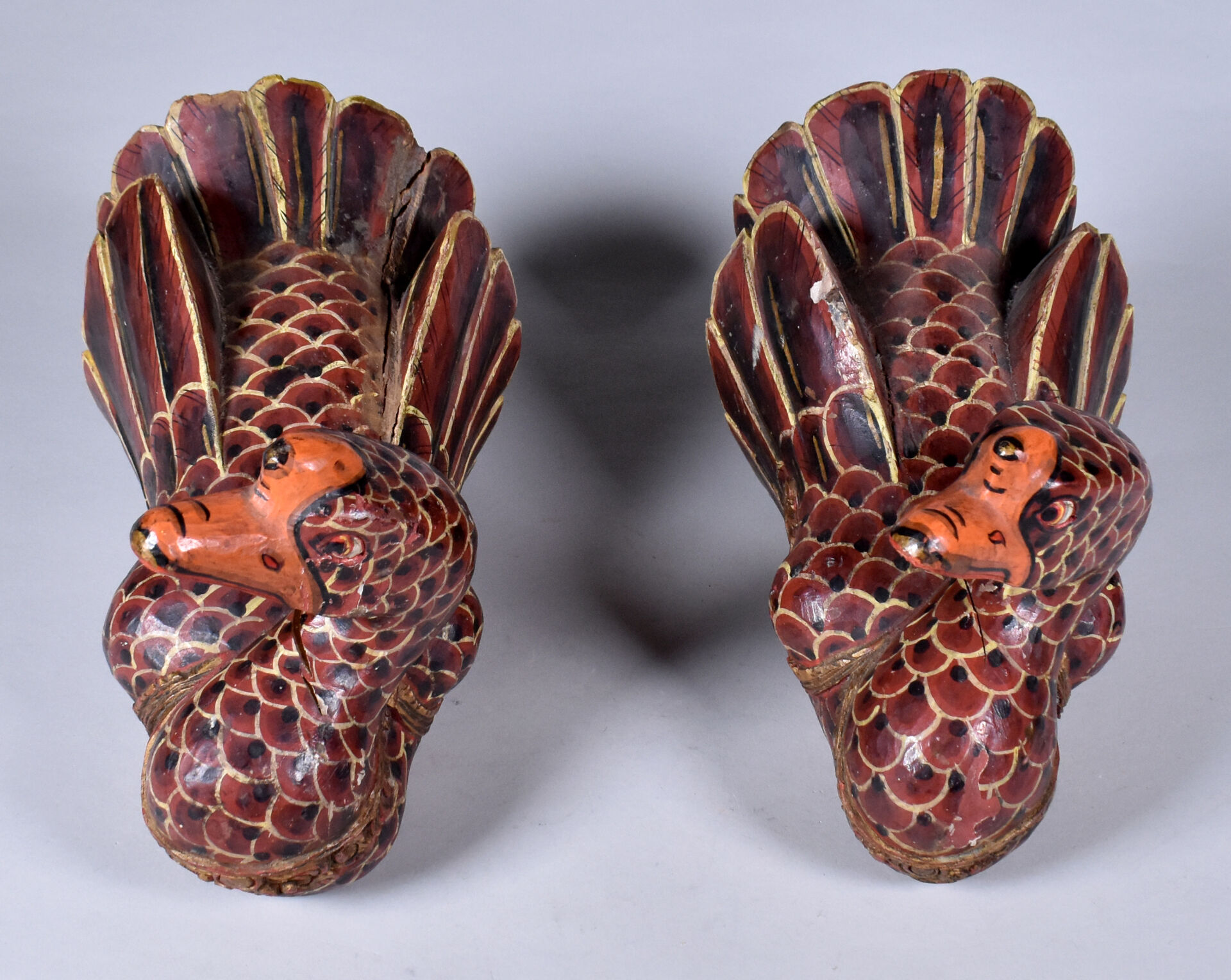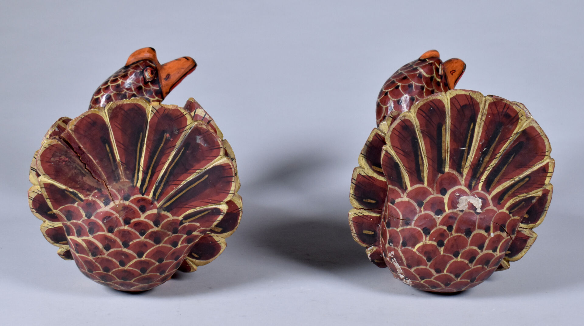 Deux canards en bois peint sculpté (usures et éclats). . Asie du Sud-Est. Haut. : 18 cm – Larg. : 26 cm – Prof. : 20 cm.