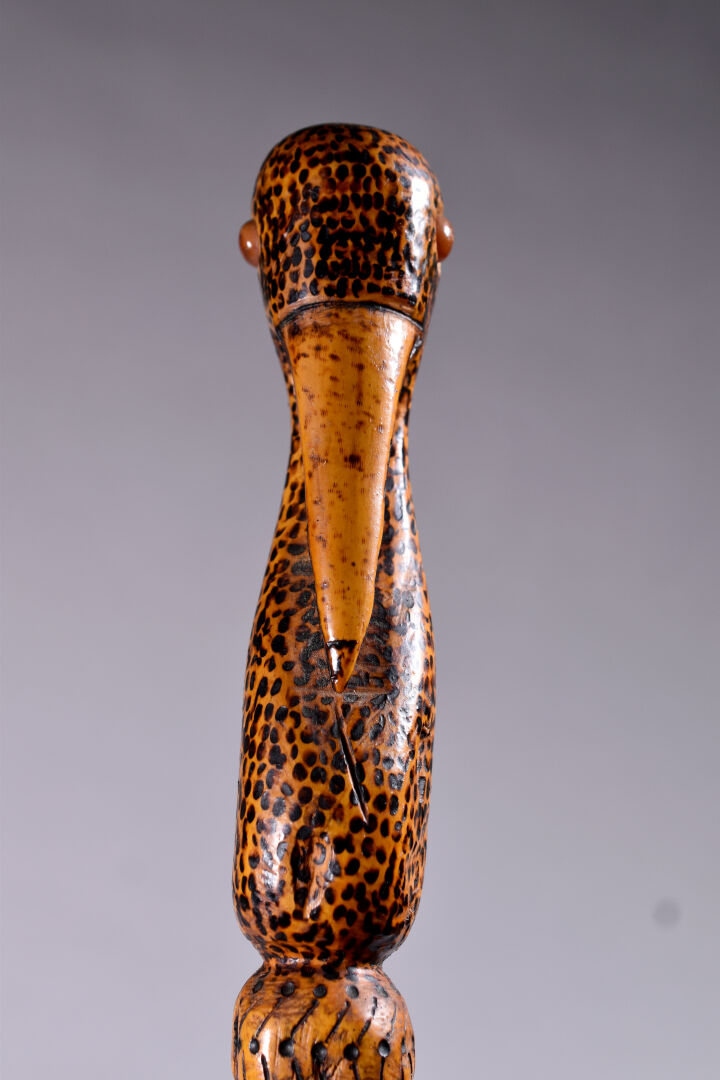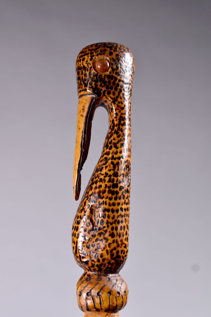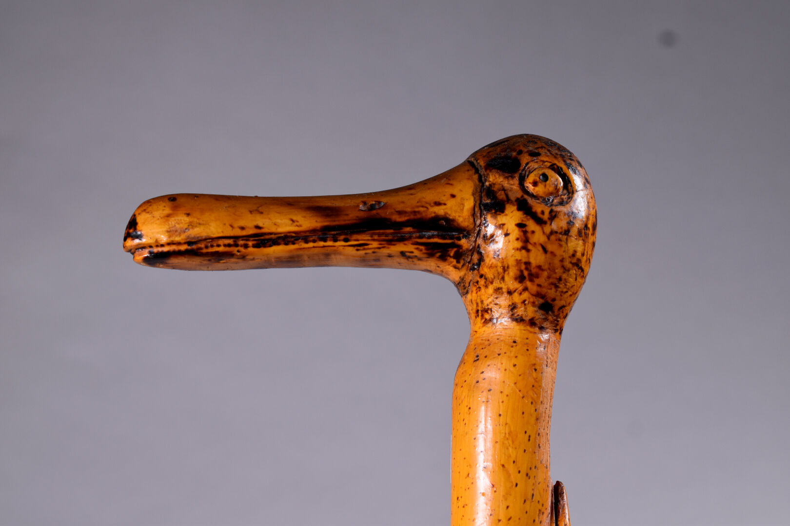 Deux cannes de poilu, les pommeaux sculptés de têtes d’oiseau, une ornée d’un serpent, l’autre de dominos). Long. : 87 cm – Long. : 92 cm.