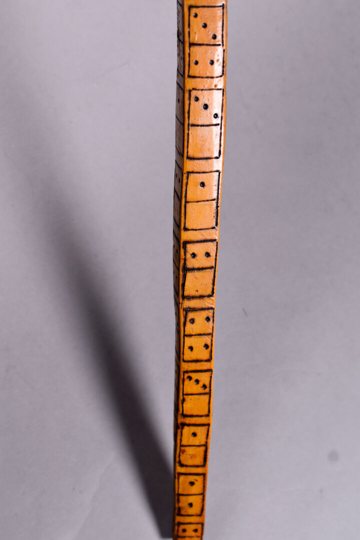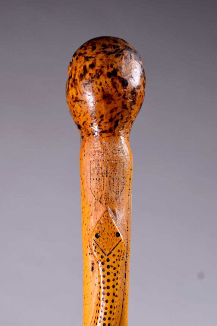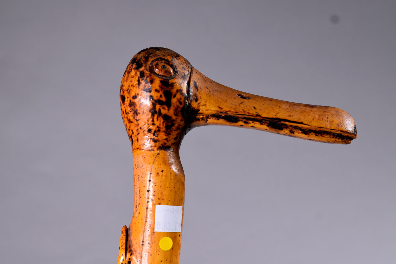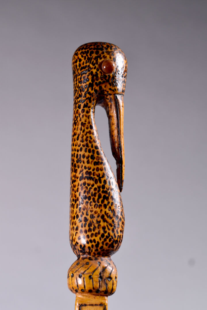 Deux cannes de poilu, les pommeaux sculptés de têtes d’oiseau, une ornée d’un serpent, l’autre de dominos). Long. : 87 cm – Long. : 92 cm.