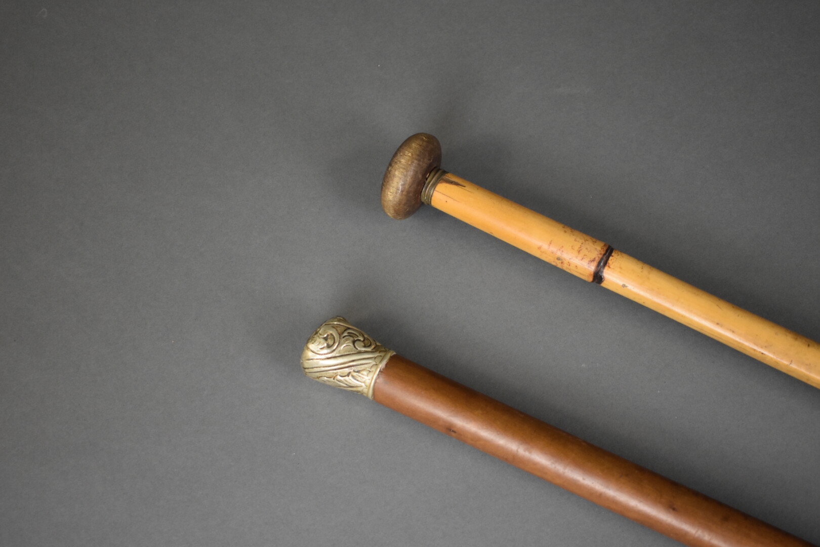 Deux cannes, l’une à pommeau en métal ciselé argenté.